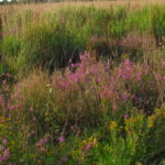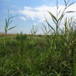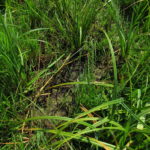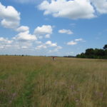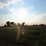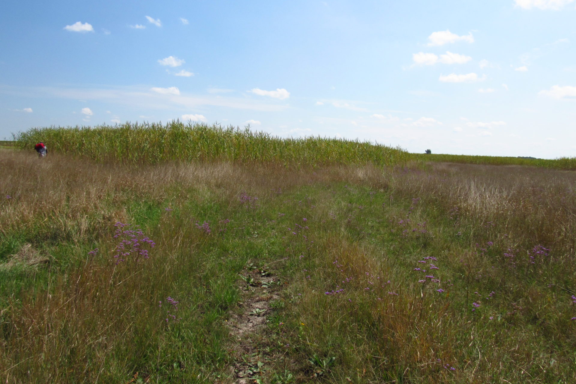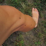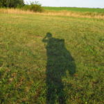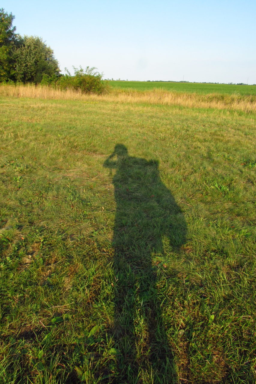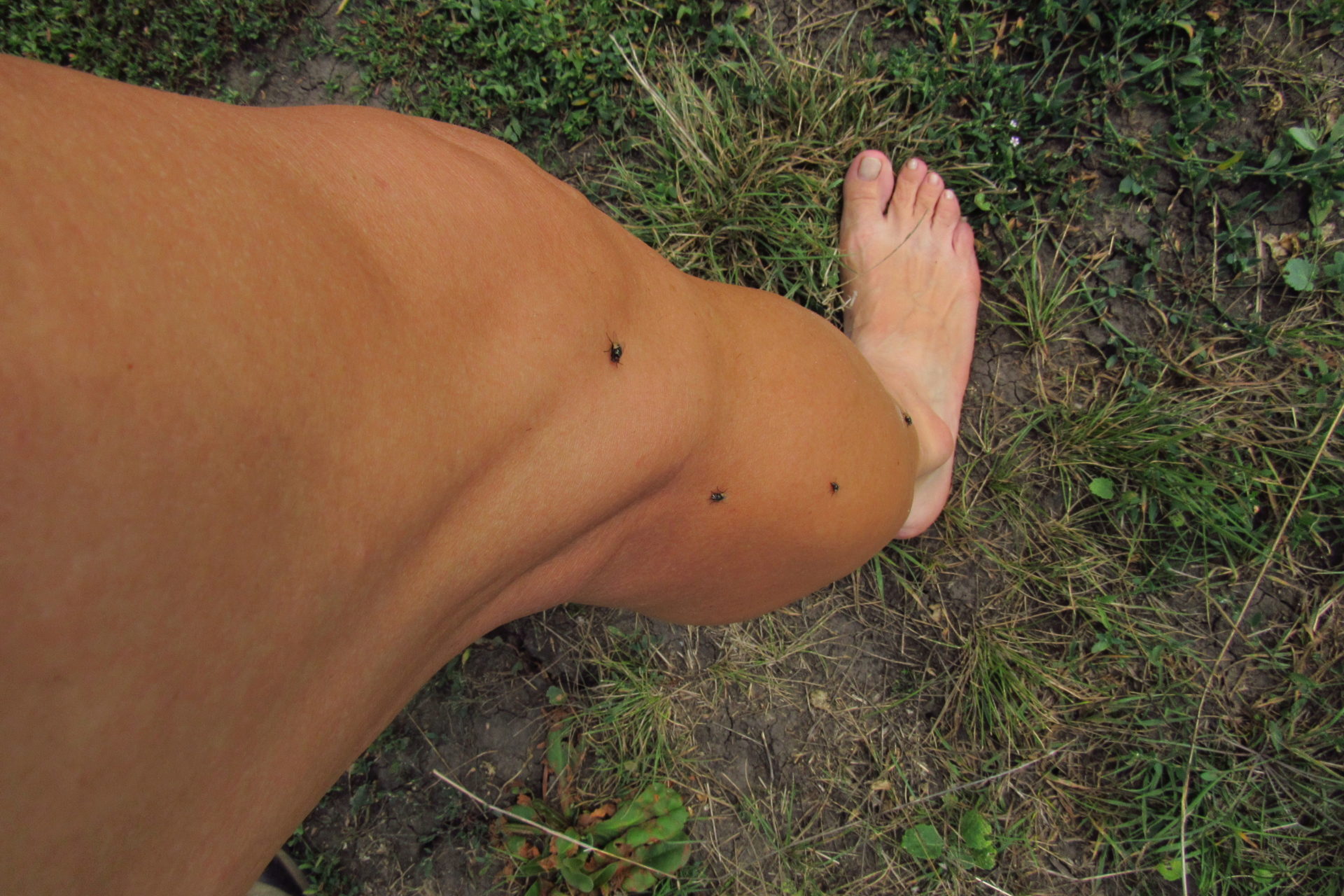 Innen kezdve, azt hiszem a napnak a “kóválygás és bukdácsolás napja” nevet adhatjuk. Kifelé haladva Átányból egy nagyon szép utca vezet ki. A végén ráfordultunk arra az útra, amiről azt gondoltuk, legalább egy darabon Kömlő felé visz. Egy darabon valóban arra vitt. Gergő már előre mondta, hogy ez nem lesz egy egyszerű út, mert ahogy eddig volt, ide már nem vezet egyenes út. Hát azt tudtam megállapítani, hogy, ha két falu egymástól pár kilométerre is van, akkor is van egy jóval hosszabb és még hosszabbnak tűnő út is. Na, mi ezen haladtunk. Eleinte még egész rendes kijárt út vitt, de egyszer csak vége lett, és beértünk egy nádasba. A lelkész mesélte, hogy régen azért telepedtek itt le az emberek, mert lápos vidék volt, ahova nem mindenki tudott bejutni, főleg, akit ők nem akartak. Hát ezt most megéltük mi is. Egyébként nagyon szép ez a lápos vidék, de elég nehéz benne haladni, és elég kiszámíthatatlan is. Úgyhogy egy idő után visszafordultunk oda, ahol vége lett a “rendes” útnak. És innen aztán indult az új kaland. Először egy kicsit buckás kamillával tarkított földön haladtunk. Mondtam Gergőnek, hogy olyan, mintha inhalálnánk, mert a levegő elég meleg volt és a mocsaras résztől pedig párás, így mindent áthatott a kamilla elképesztően erős és finom illata. Ezt követően ráfordultunk egy másik “útra”, ami eleinte cickafarkkal és kakukkfűvel volt benőve (így hát itt már ezzel a csodás illattal inhaláltunk tovább 🙂 ), majd egyszercsak átment egy nagy füves pusztába, ami ugyan síknak tűnt, de én ekkora repedésekkel és lyukakkal tarkított földet még nem láttam. Volt, ahol a repedések 20-30 centi mélyek voltak, és nem igazán lehetett látni őket a fűtől. Ezen nem volt túl egyszerű átkelni. Valójában csetlettünk, botladoztunk csak. És Gergőnek még nehezebb volt azzal a nagy zsákkal, mint nekem. De végre kiértünk egy útra, ami kétfelé indult innen. Lepakoltunk. Gergő elmenet az egyik, én a másik irányba, hogy megnézzük hova vezetnek. Végül a Gergő által felfedezett felé vettük az irányt. Itt elhaladtunk egy kis erdő mellett, aminek a végénél ismét megláttuk a templomtornyot. Ezt akkor már harmadszor élvezhettük, és mindannyiszor azt gondoltuk, hogy már nem vagyunk messze tőle. De tévedtünk, mert valóban nem voltunk messze elvileg … de gyakorlatilag! Szóval a kis erdő után úgy tűnt megint van egy út, de az ismét elkanyarodott egész más irányba. Gondoltunk átvágunk, de végül az út mellett döntöttünk mégis. Amikor azonban már annyira elkanyarodott, hogy úgy éreztük ez nagyon nem lesz jó, megláttunk egy másik kis erdőt, amin volt egy rész, ahol úgy tűnt, át lehetett menni. Arra vettük hát az irányt, és én csak reméltem, hogy végül nem az egész erdőt kerüljük majd meg. De Gergő látta az irányt. Hát mentünk. Az erdőkerülés után kiértünk ismét egy földre, ahol egy nagyon ritkásan ültetett kukorica föld is volt. Itt aztán elsütöttük azt a viccet, hogy ez nem a ritka búza, ritka rozs, hanem inkább a ritka kukorica… Haladtunk tovább. Most egy napraforgótábla jött, és mellette egy többé-kevésbé járható csapás. Majd egy árok, majd egy újabb föld, amit akkor szánthattak be, majd újabb füves, árkos föld, majd egy újabb árok, de az már csalánnal tarkítva, és nem is akármilyen mély. Mindeközben ugyan láttuk a templomtornyot, de nem úgy tűnt, mintha közelednénk. A csalános árok után (ugye már az első nap be lettünk avatva, így aztán ez a pár méteres szakasz, mit nekünk már) következett egy jó nagy föld, ami szintén be volt szántva. De itt már láttuk a falu végét, és a műutat. Ezen a szakaszon elég nehéz volt haladni, de már volt remény. Egy-két napja még nem gondoltam volna, hogy örülni fogunk egy betonútnak. Hát most ez történt! Azt se gondoltam volna, hogy egy falunév tábla ekkora örömöt is tud jelenteni, hát még a kocsma! (azért, ha őszinte akarok lenni, ez utóbbiról azért voltak elképzeléseim és talán emlékeim is :)). De hazudnék, ha azt állítanám, hogy ez az út rossz emlék lenne majd. Hihetetlenül érdekes, hogy mennyi arca, illata, minősége tud lenni egy tájnak. Mindez nem lehetett több 10 km-nél (azt hiszem a műúton, vagy egyenesen kb. 5-6 km lehet), de olyan sokszínű és változatos volt, hogy az valami csoda. Egyetlen igazán kellemetlen dolog volt, az a szúnyogok és mini legyek sokasága. Emiatt aztán nem is álltunk meg túl sűrűn útközben, mert azonnal megszálltak minket. Készítettem is képet a lábamon tanyázó mini legyek sokaságáról.