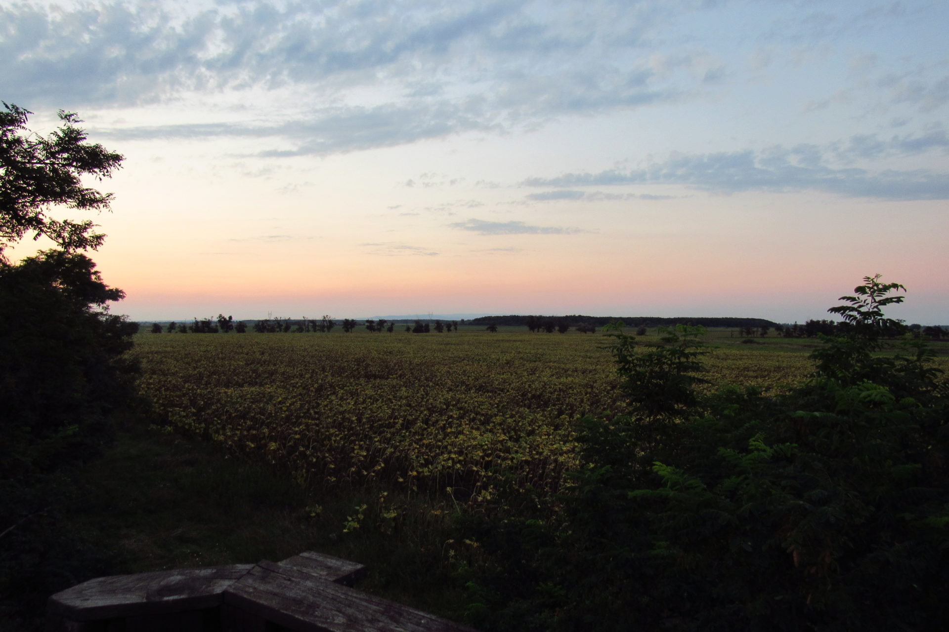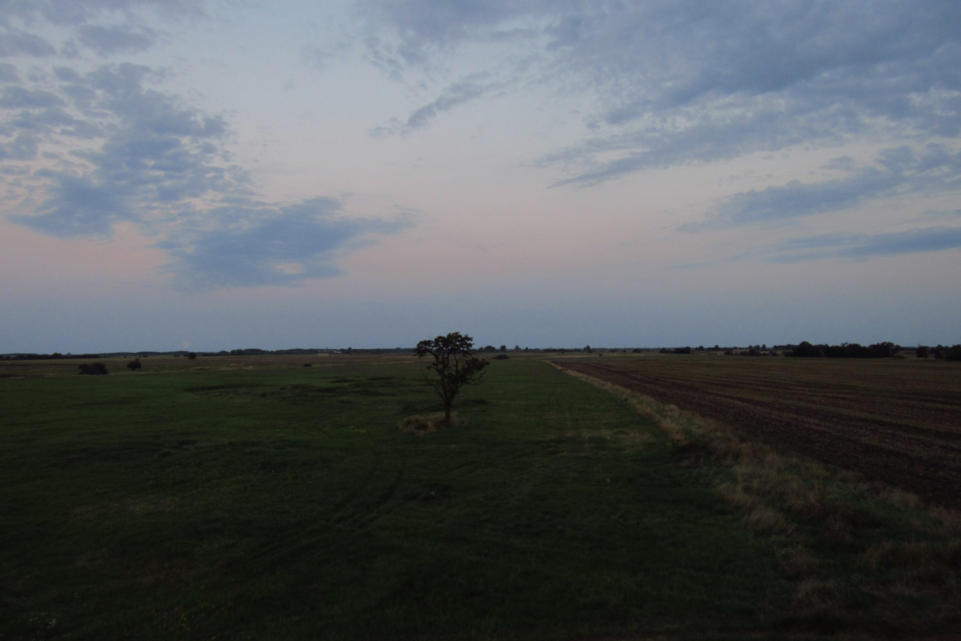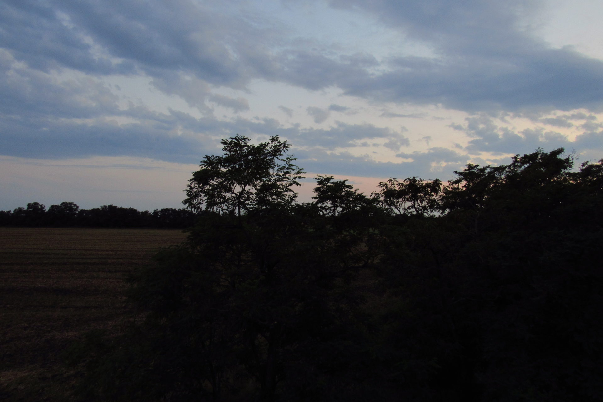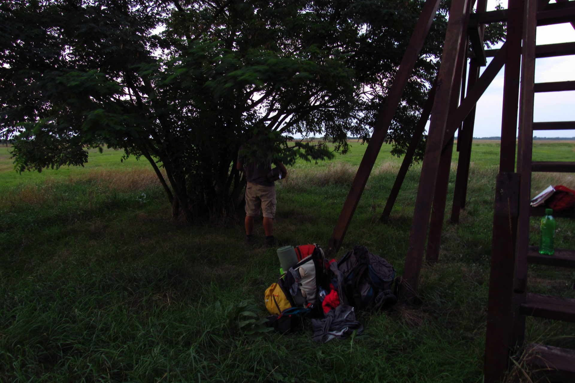 Nem jutottunk túl messzire, amikor jött egy dzsip, benne három vadász. Vicces volt, mert ők ijedtek meg, hogy mi itt akarunk átkelni, és aludni, Először azt gondoltam mi vagyunk veszélyben a lövések miatt, de hamar kiderült, hogy nekik rossz, hogy ha mi ott átkelünk, mert a vaddisznó nem megy arra, amerre akár csak egy régebben elhaladt ember szagát is érzi. Úgyhogy megkértek, hogy üljünk be az autóba, és kivisznek minket a vadászterületről egy olyan helyre, ahol már nem vagyunk “útban”, és aludni is tudunk. Így aztán kb. 3 km-t ezen a napon autóval tettünk meg terveinkkel ellentétben. Gergő a platón ült egy sráccal, én a főnökkel elől. Érdeklődött, merre tartunk. Szokásos módon jól elképedt. Aztán beszélgettünk a vadászatról, meg arról mesélt, hogy itt régen volt egy nagy uradalom (János uradalom) és azon az úton, amin haladtunk most mi is, régen lóvasút volt. Így szállították a terményt Sarudra. Útközben szembe jött velünk az a pasi, aki előtte útba igazított minket. Kiderült, hogy ő a vadásztársaság elnöke, és sok itteni föld birtokosa is. Kicsit leálltak megbeszélni, hol tudnánk aludni, hova vigyenek minket. Végül egy madár les alatti terület mellett döntöttek. Kitettek minket egy kis hídnál, és gyalog kb. 200 méter után meg is leltük ezt a helyet. Jó sok szúnyog és gyönyörű táj. Gyors sátorverés következett, de még előtte felmásztunk a túzok lesre. Álomszép kilátás a pusztára, és csodálatos naplemente.