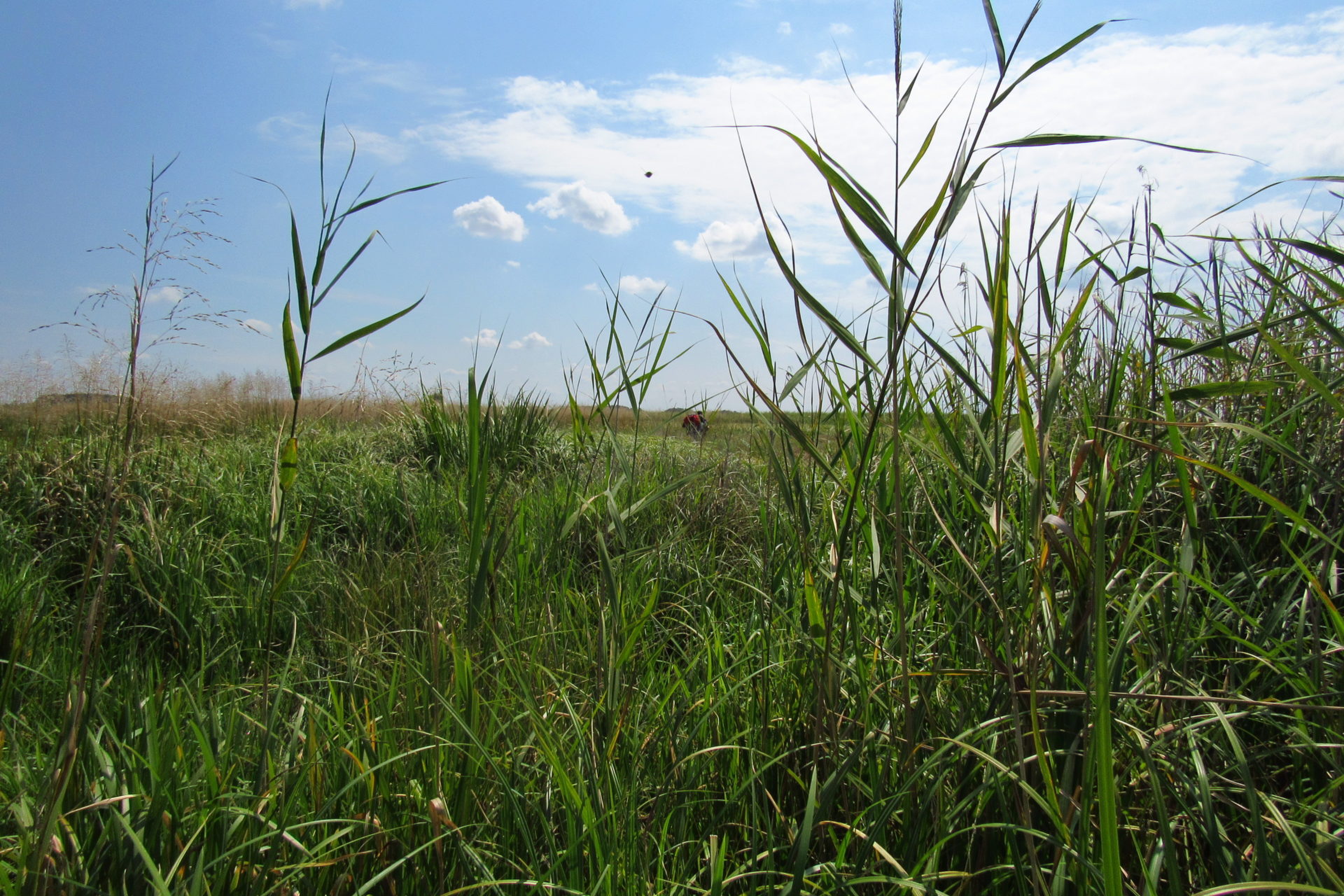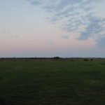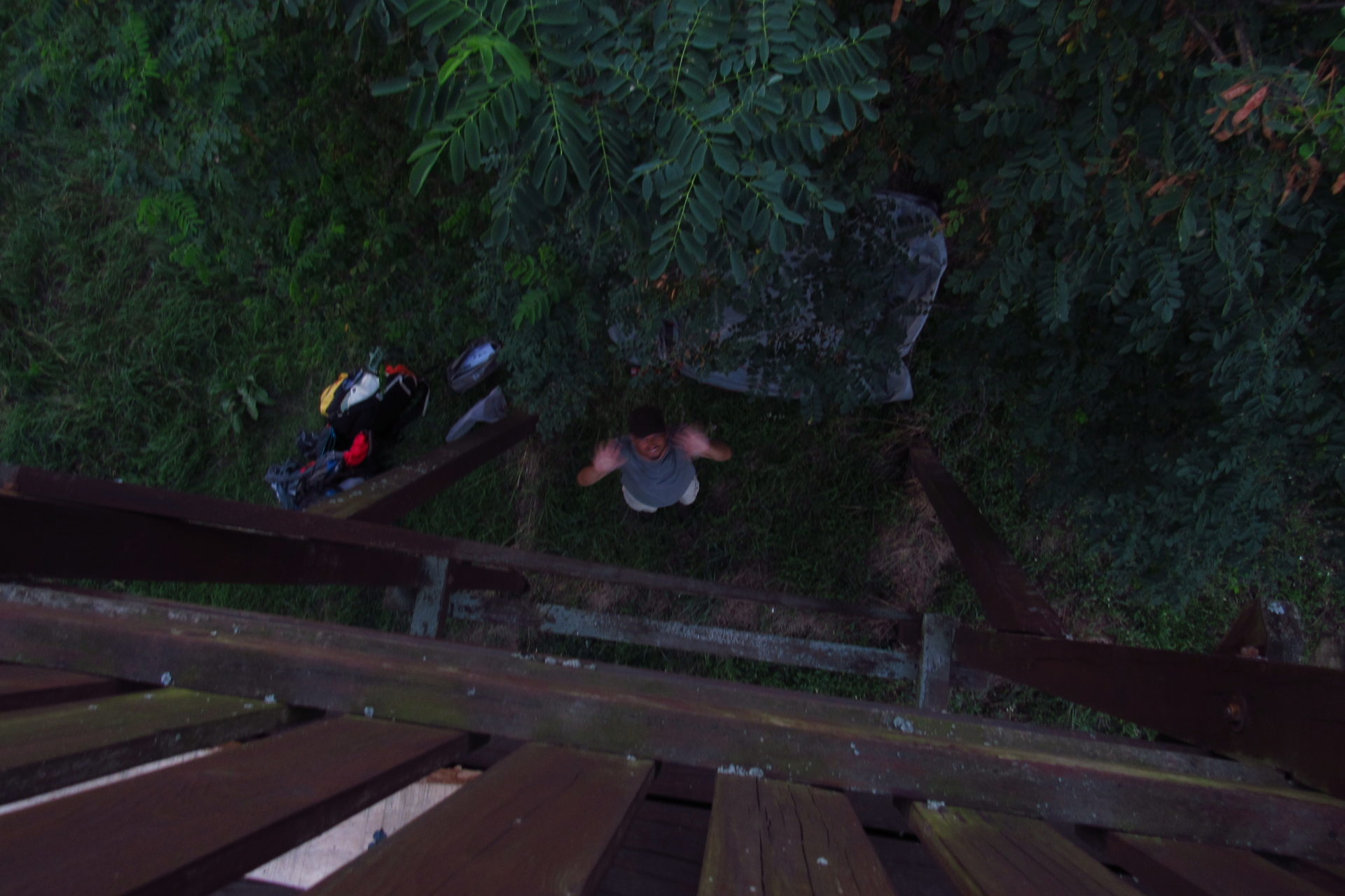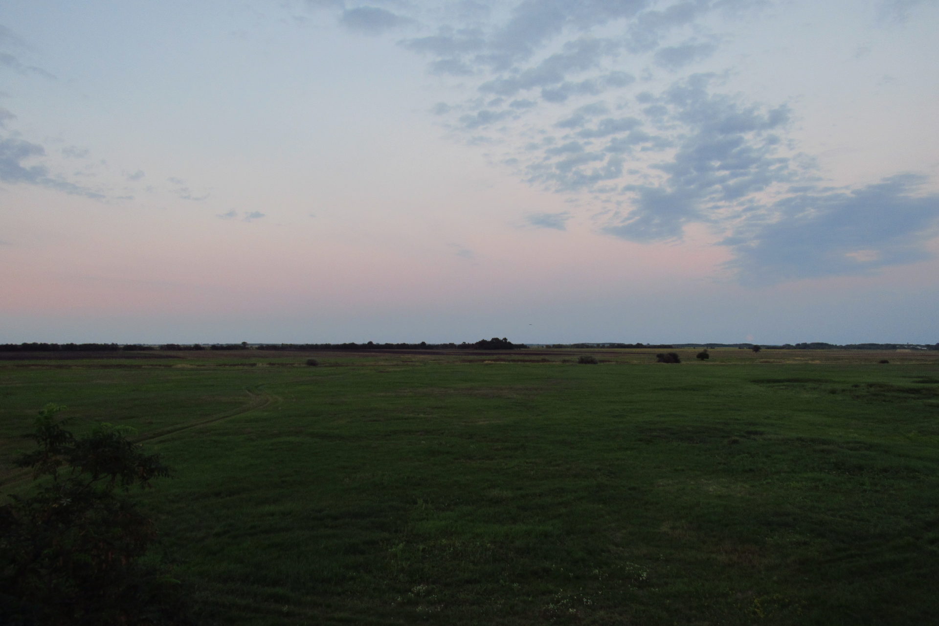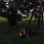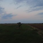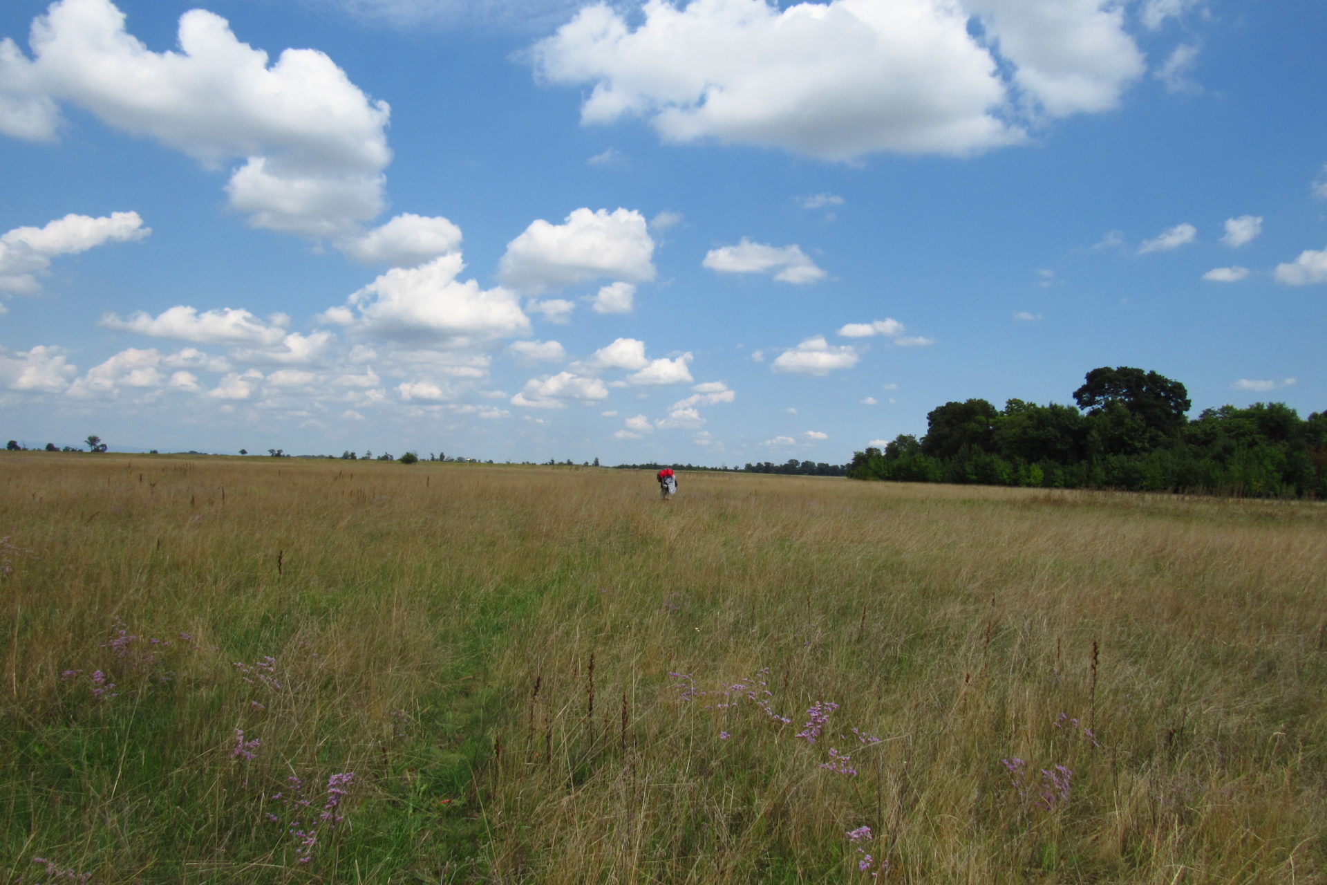 Nem jutottunk túl messzire, amikor jött egy dzsip, benne három vadász. Vicces volt, mert ők ijedtek meg, hogy mi itt akarunk átkelni, és aludni, Először azt gondoltam mi vagyunk veszélyben a lövések miatt, de hamar kiderült, hogy nekik rossz, hogy ha mi ott átkelünk, mert a vaddisznó nem megy arra, amerre akár csak egy régebben elhaladt ember szagát is érzi. Úgyhogy megkértek, hogy üljünk be az autóba, és kivisznek minket a vadászterületről egy olyan helyre, ahol már nem vagyunk “útban”, és aludni is tudunk. Így aztán kb. 3 km-t ezen a napon autóval tettünk meg terveinkkel ellentétben. Gergő a platón ült egy sráccal, én a főnökkel elől. Érdeklődött, merre tartunk. Szokásos módon jól elképedt. Aztán beszélgettünk a vadászatról, meg arról mesélt, hogy itt régen volt egy nagy uradalom (János uradalom) és azon az úton, amin haladtunk most mi is, régen lóvasút volt. Így szállították a terményt Sarudra. Útközben szembe jött velünk az a pasi, aki előtte útba igazított minket. Kiderült, hogy ő a vadásztársaság elnöke, és sok itteni föld birtokosa is. Kicsit leálltak megbeszélni, hol tudnánk aludni, hova vigyenek minket. Végül egy madár les alatti terület mellett döntöttek. Kitettek minket egy kis hídnál, és gyalog kb. 200 méter után meg is leltük ezt a helyet. Jó sok szúnyog és gyönyörű táj. Gyors sátorverés következett, de még előtte felmásztunk a túzok lesre. Álomszép kilátás a pusztára, és csodálatos naplemente.