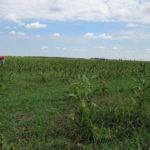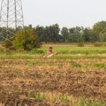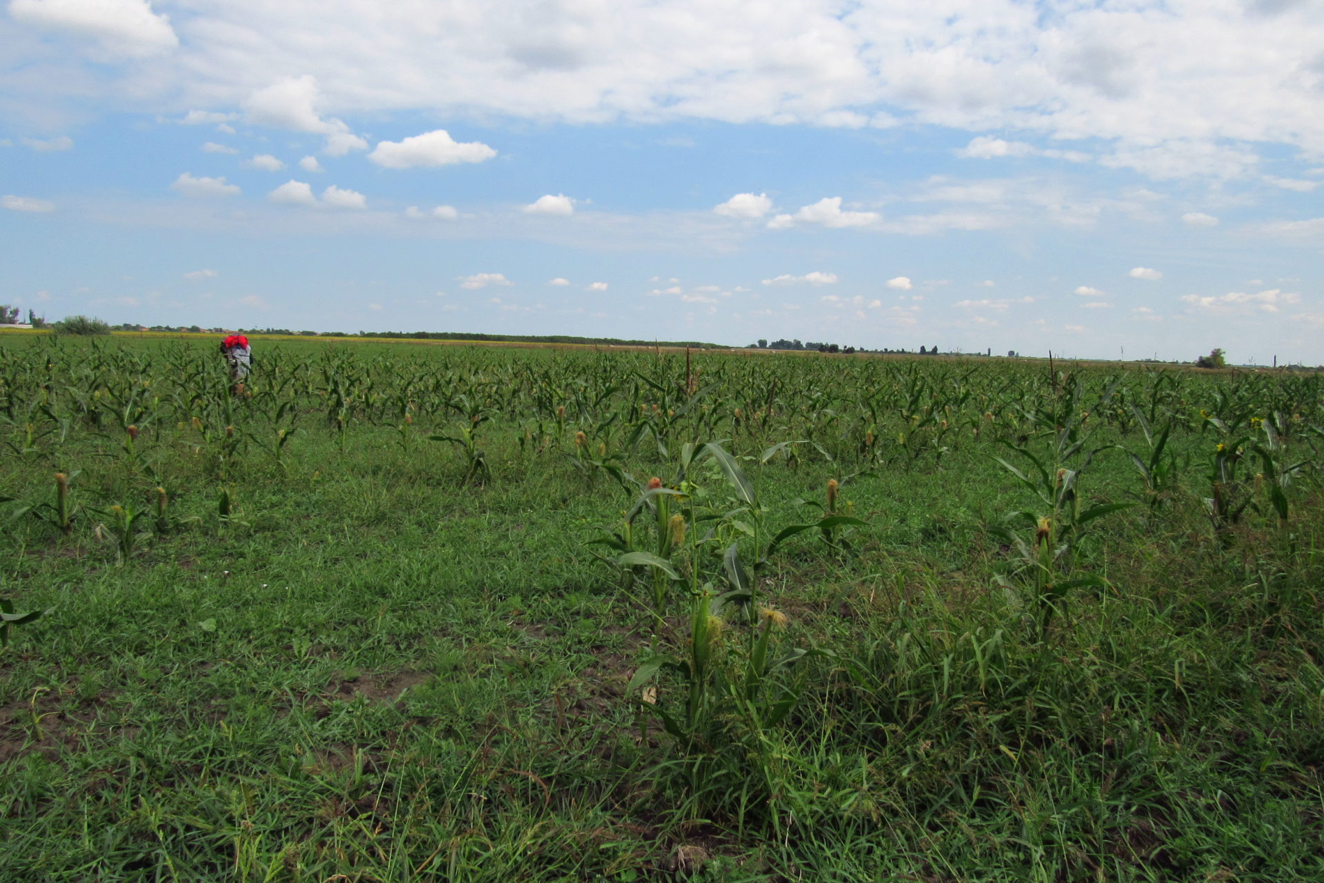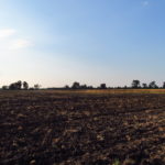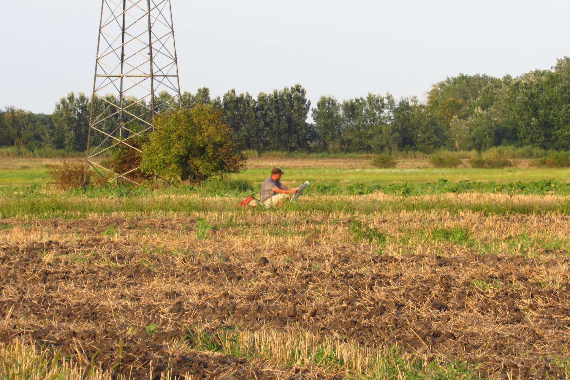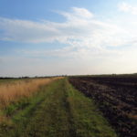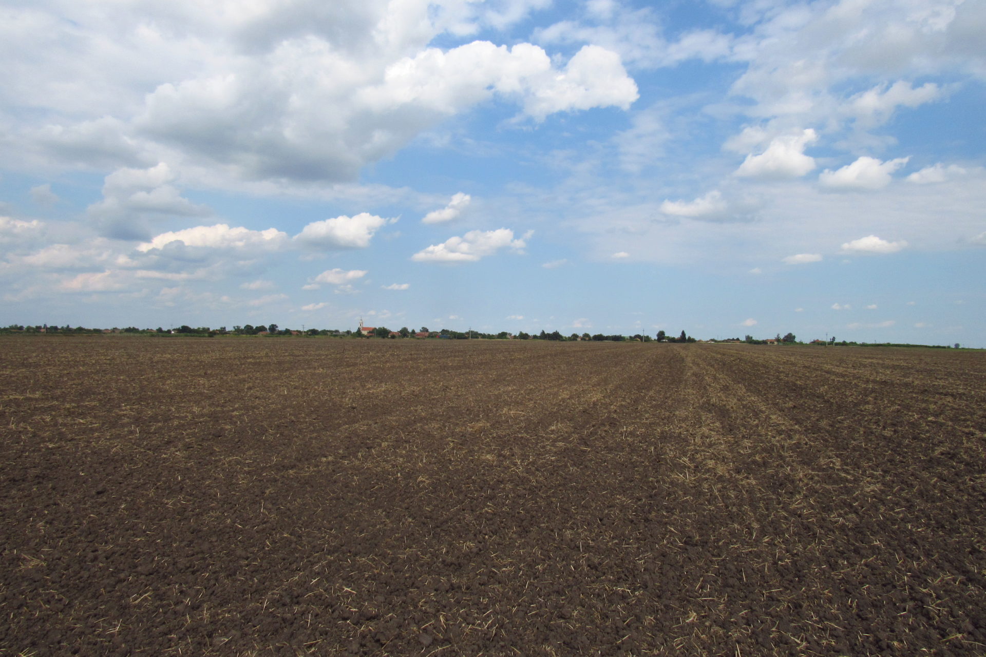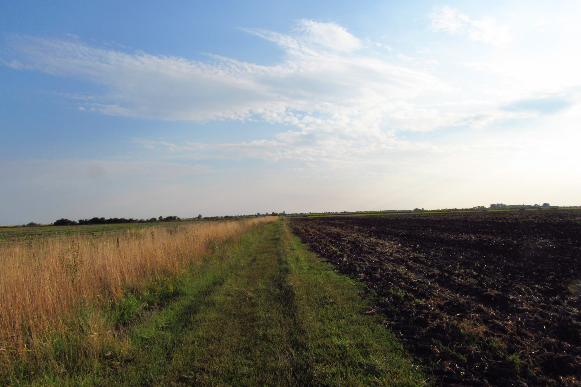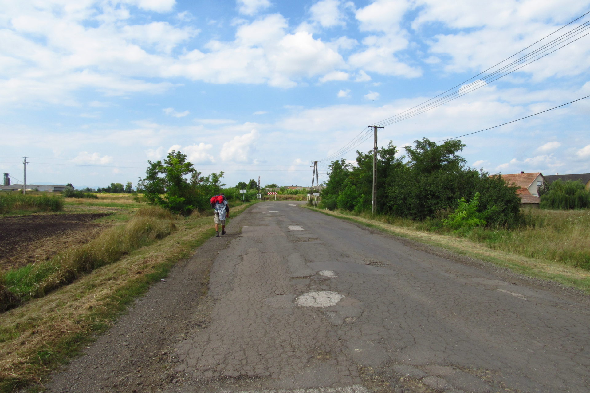 Most jött utunk kóválygós szakasza. Meseszép úton haladtunk először. Megfigyeltük, hogy az állatok egyre közelebb és közelebb engednek magukhoz, és már csak akkor, amikor eléggé közel vagyunk, szaladnak vagy repülnek el. Érdekes élmény egy pár méterre felrepülő ragadozó madár, vagy a közvetlenül előttünk játszadozó őzgida pár, vagy a nyúl, aki ül a kukoricás mellett vezető úton és hosszan szembenéz velünk, miközben haladunk felé. Szóval ezen a fákkal, rétekkel tarkított úton haladtunk. Majd lefordultunk erről az útról az utasításoknak megfelelően jobbra. Előtte még én elvesztem a frissen szántott föld feketeségében, háttérben a traktorral és a Mátrával. Gergő közben persze jól előre haladt. Jobbra fordulva megláttunk egy templomtornyot, majd megállapítottuk, hogy fogalmunk nincs, melyik falué lehet. Van három falu, amelyik nyugodtan lehet. Haladtunk az utasításoknak megfelelően “fel”, majd elfordult az út, így mi is. Gergő próbálta nézni a térképet, de mint már a kocsmában is mondták, nem igazán lehet használni, mert ma már a gazdák, hiába lenne kötelességük, hogy karban tartsák őket, gyakran beszántják, vagy csak egyszerűen elhanyagolják. Így aztán hiába van jelölve a térképen földút, a valóságban vagy van, vagy nincs, vagy éppen egy szakasza már termőföldé alakult. Így hát haladtunk az orrunk után, és arra, amerre éppen volt út. Pár autó elhaladt mellettünk, de nem álltak meg. Végül elértünk egy kereszteződéshez, ahol először az egyik irányba, majd néhány pár száz méter utáni új döntésünk alapján, végül a másik irányba indultunk el. Itt jött egy autós, aki meg is állt. Egy nagyon kedves pasi volt. Felajánlotta, hogy elvisz minket, de amikor mondtuk, hogy mi gyalogolni szeretnénk, elmagyarázta, hogy itt egyenesen lesz majd egy kis híd, ott jobbra, aztán majd egyszer csak a dűlőn balra, majd jön egy napraforgó tábla egy pléh Krisztussal, ott figyeljünk és menjünk… ki tudja már merre, és már Sarudon is vagyunk. Ez neki egyszerűnek tűnhetett, de nekünk nem annyira. Mondtuk, hogy csak addig mondja, amíg egy alvó helyet találunk. El is mondta, mi meg elindultunk.