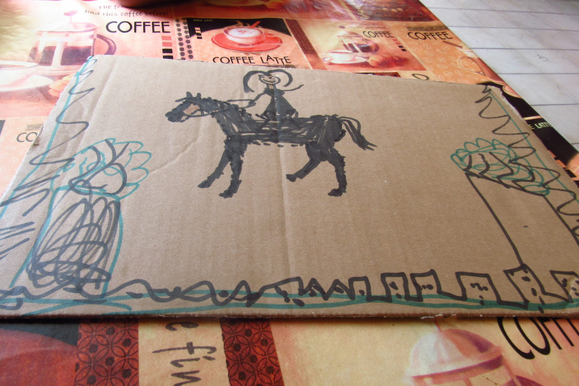 Na, de aztán megláttam a kocsmát, ahova Gergő már be is tért addigra. Itt egy nagyon kedves és jó fej tulaj volt. Ott volt az unokája is, aki megmutatta a rajzát és az általa készített sárkányt. Le is fotóztam. A kislány ló mániás, és mint kiderült, 7 éves és most megy majd az átányi református iskolába. A kislány ezek szerint benne van abban a 14 gyerekben, akit 25-ből választottak ki az első osztályba. Büszkék is, hogy oda fog járni – az ő szavaikkal élve – elit iskolába. Van ebben valami abszurd, de érthető is. Na, mindegy. …Kaptunk szilvát, jót beszélgettünk, söröztünk. Gergő a kocsmában tartózkodó egyik pasival átbeszélte az útvonalat, amin végül el is indultunk.