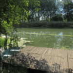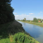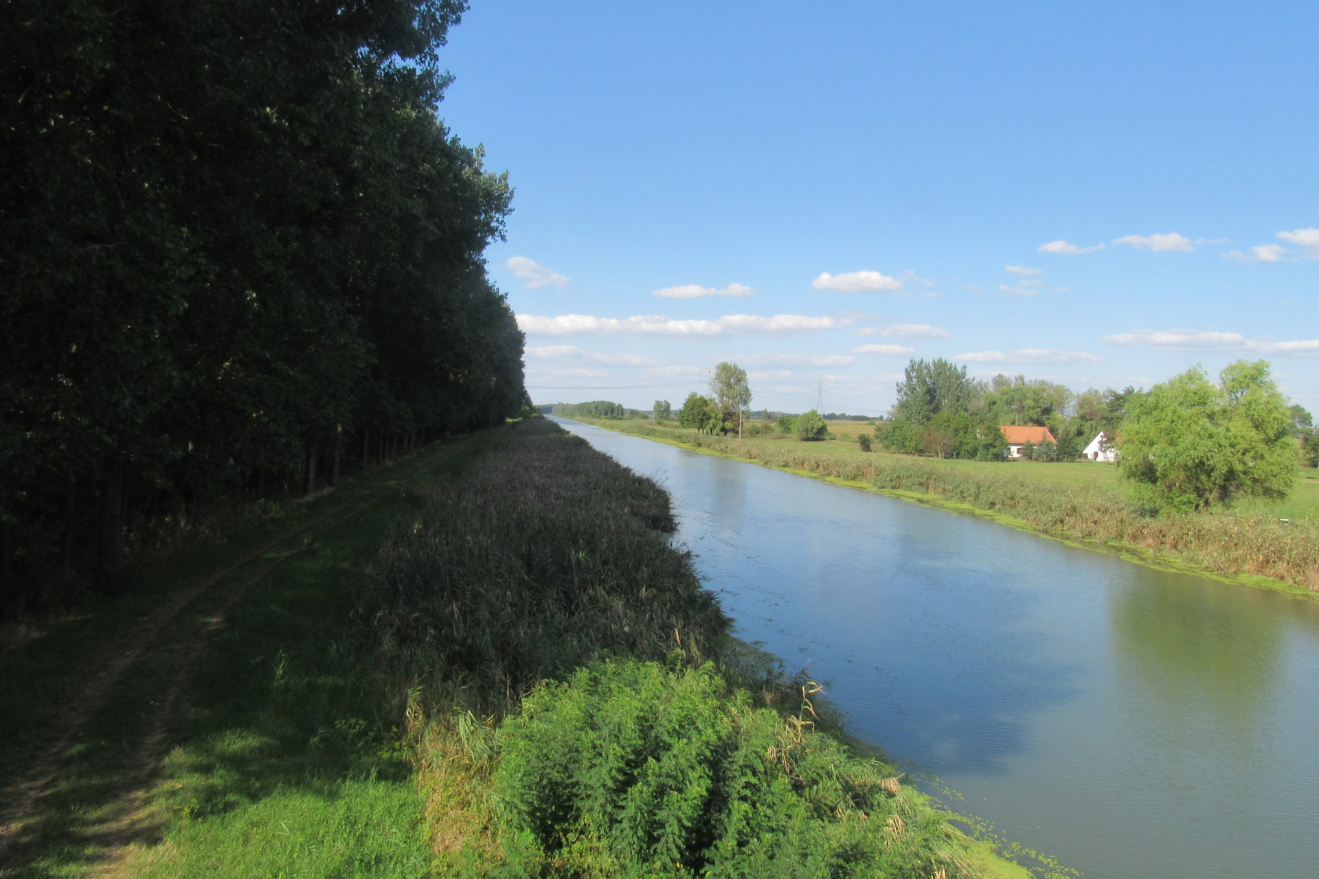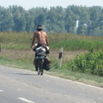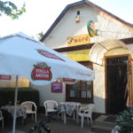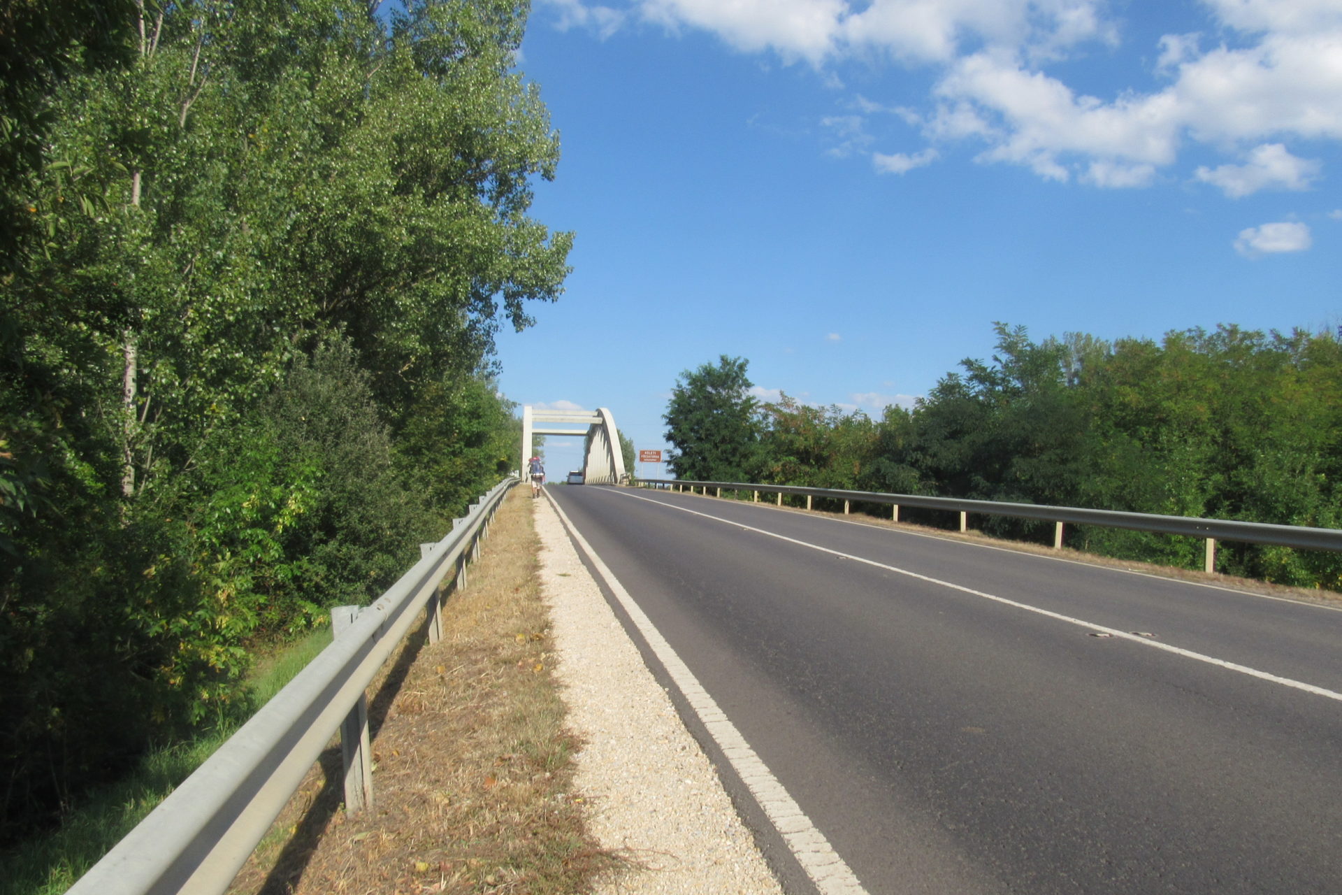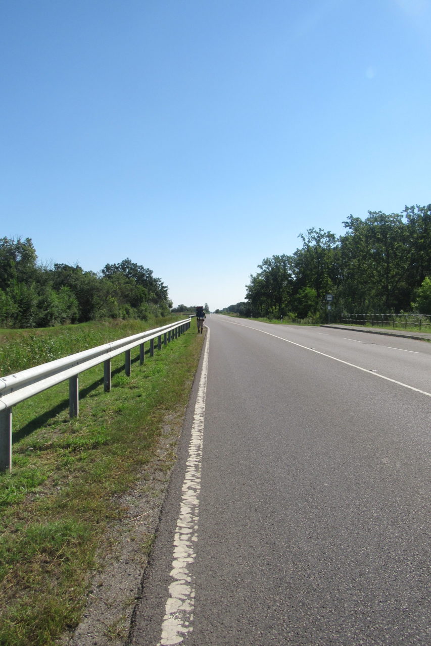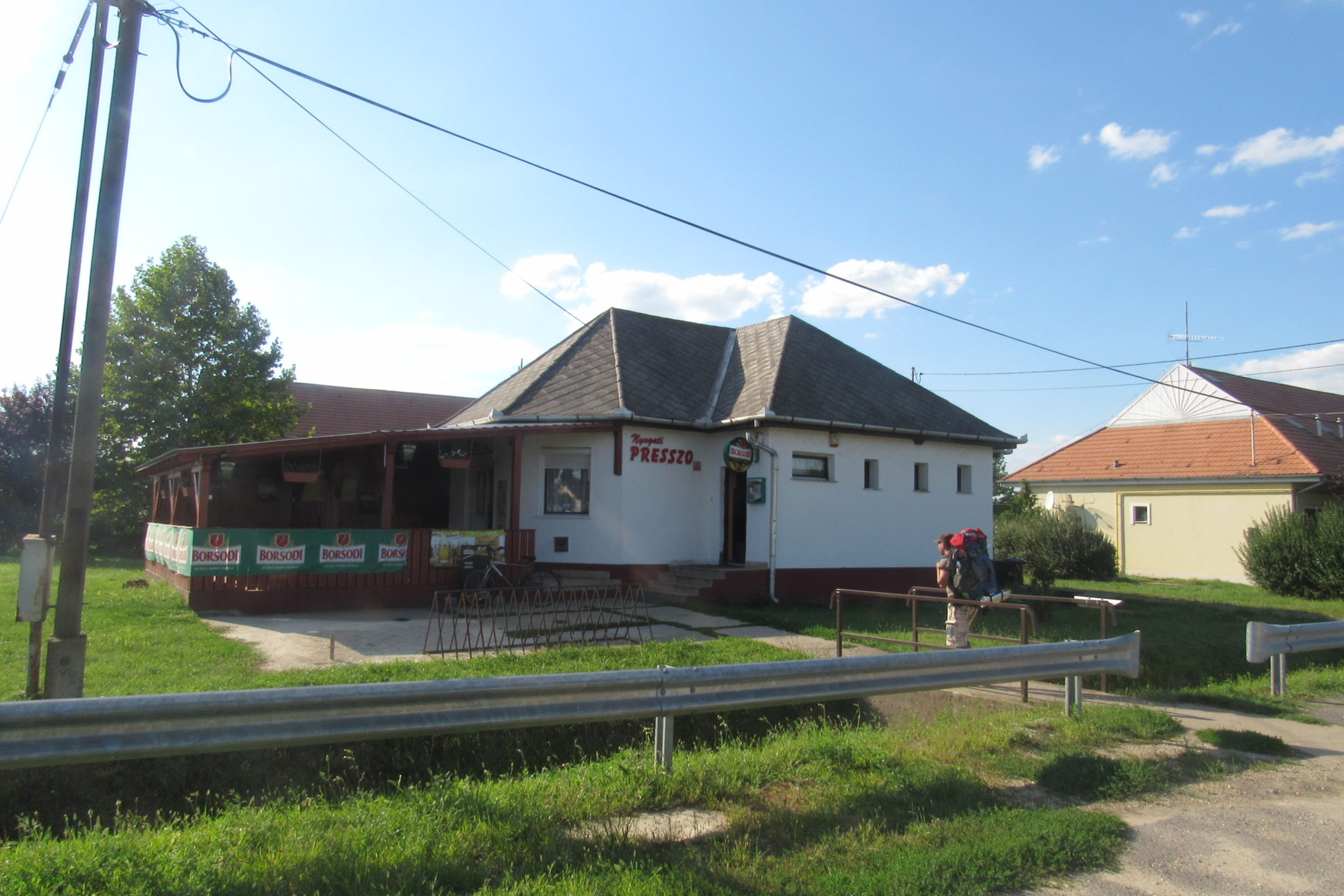 Valóban jóval kellemesebb szakasz következett a csatornát áthidaló híd után. Kis házakkal tarkított folyópart. Hálásak is voltunk nagyon az információért, hogy erre is jöhetünk. Amikor innen lefordultunk a falu irányába, megláttunk egy kocsmát, ahova be is tértünk. Velünk egy időben érkezett egy jó nagy hangú ember. Mint kiderült, ő aztán mindenkit ismer, és fordítva is igaz ez. Beszélgettünk kicsit a kocsmáros fiúval is, aki már többször járt Erdélyben. Vittek innen egy kopjafát a Madarasi Hargitára. Mondta, hogy nézzük meg, ha eljutunk oda. Nagyon nehéz volt vele beszélni, mert ez a másik jó ember jó harsány volt. Mindegy … Gergő tudott itt enni egy pizzát, nekem meg ajánlottak egy másik helyet, ahol én is tudok enni valamit. Nagy nehezen elszakadtunk e helytől és elindultunk a másik felé. Útközben egy kocsma mellett elhaladva meg akartak venni Gergőtől,. De nem adott el. 🙂 Azt hiszem nem járt volna velem túl jól a pasi!