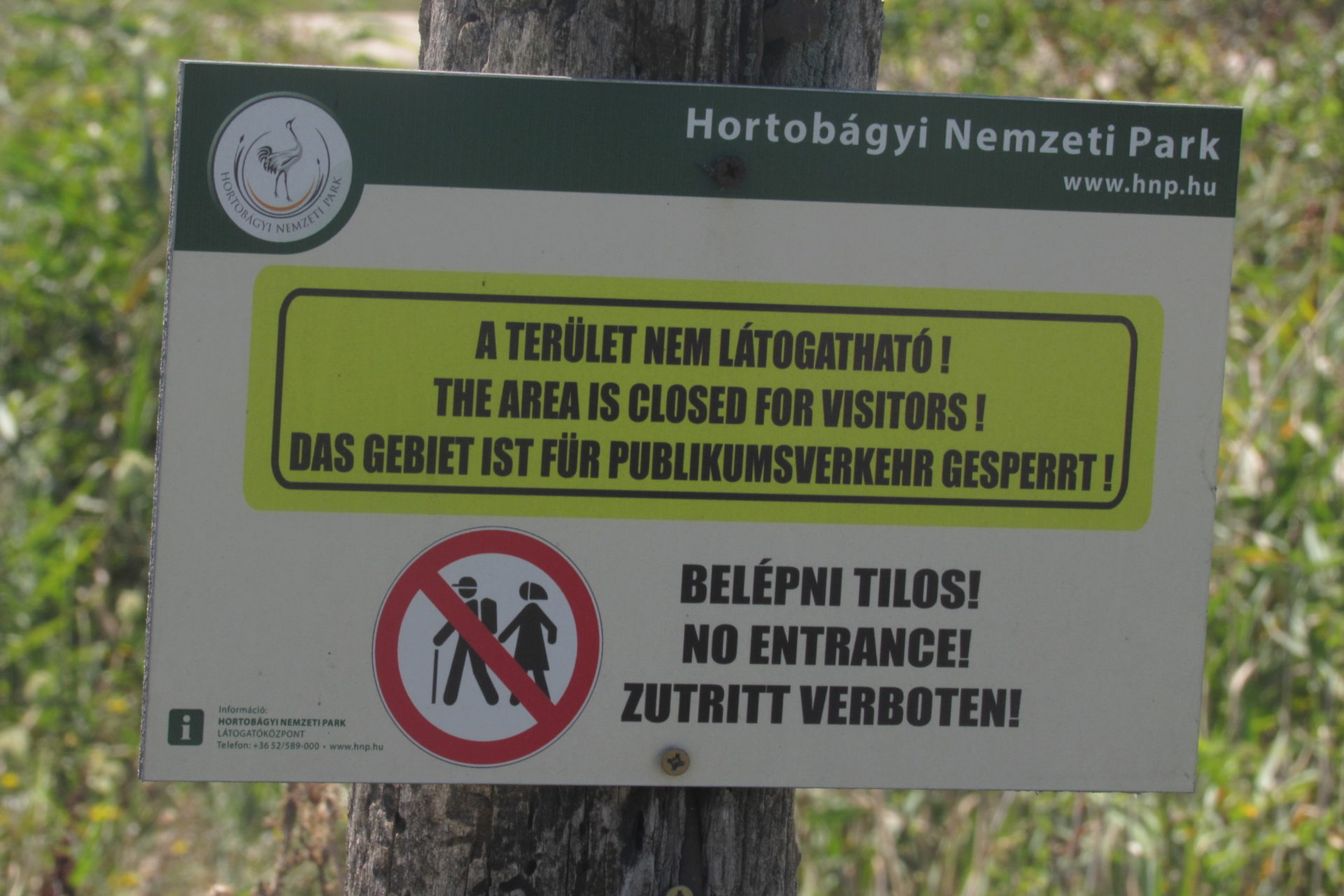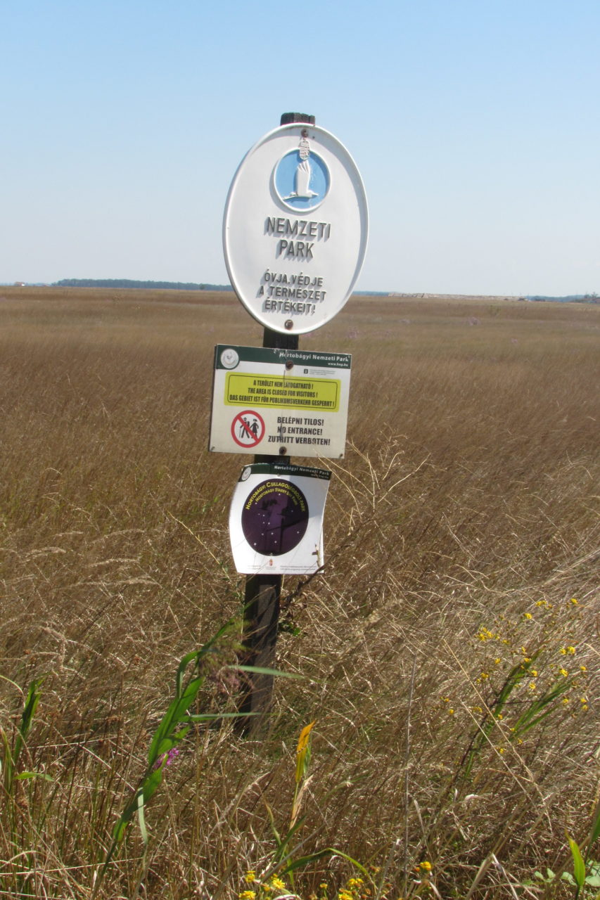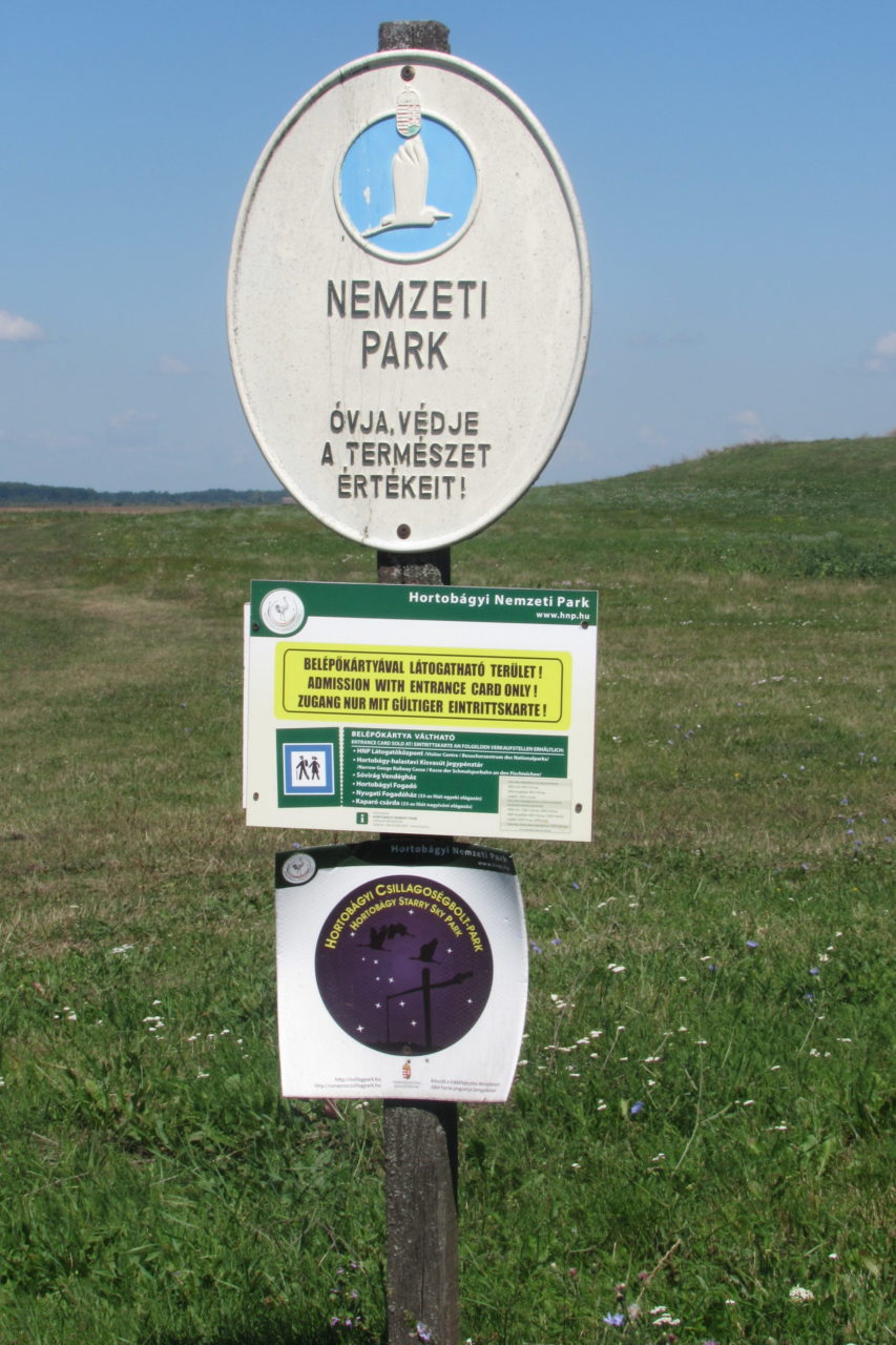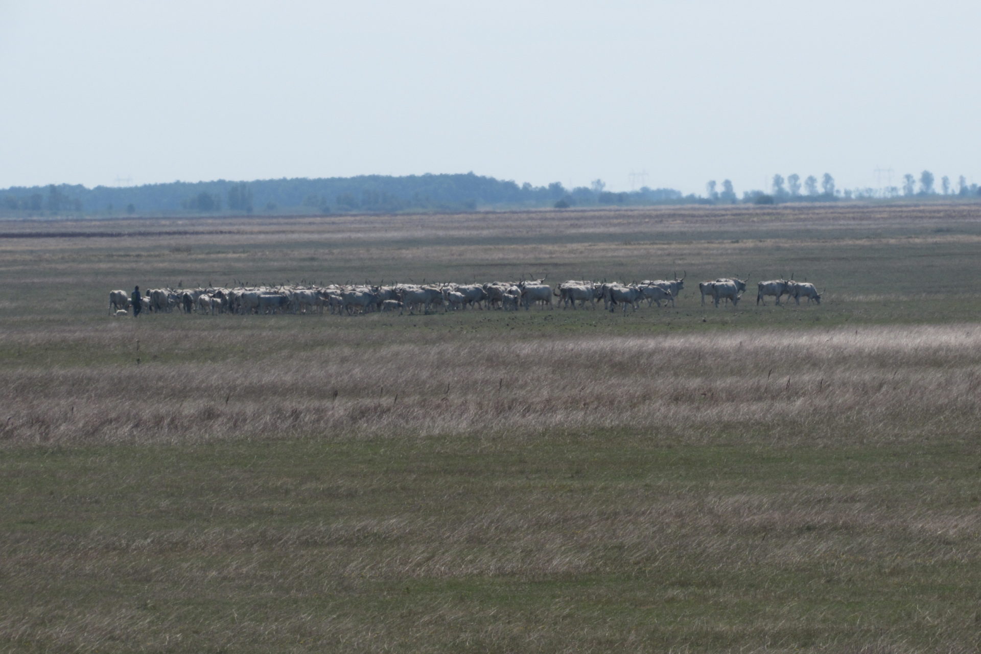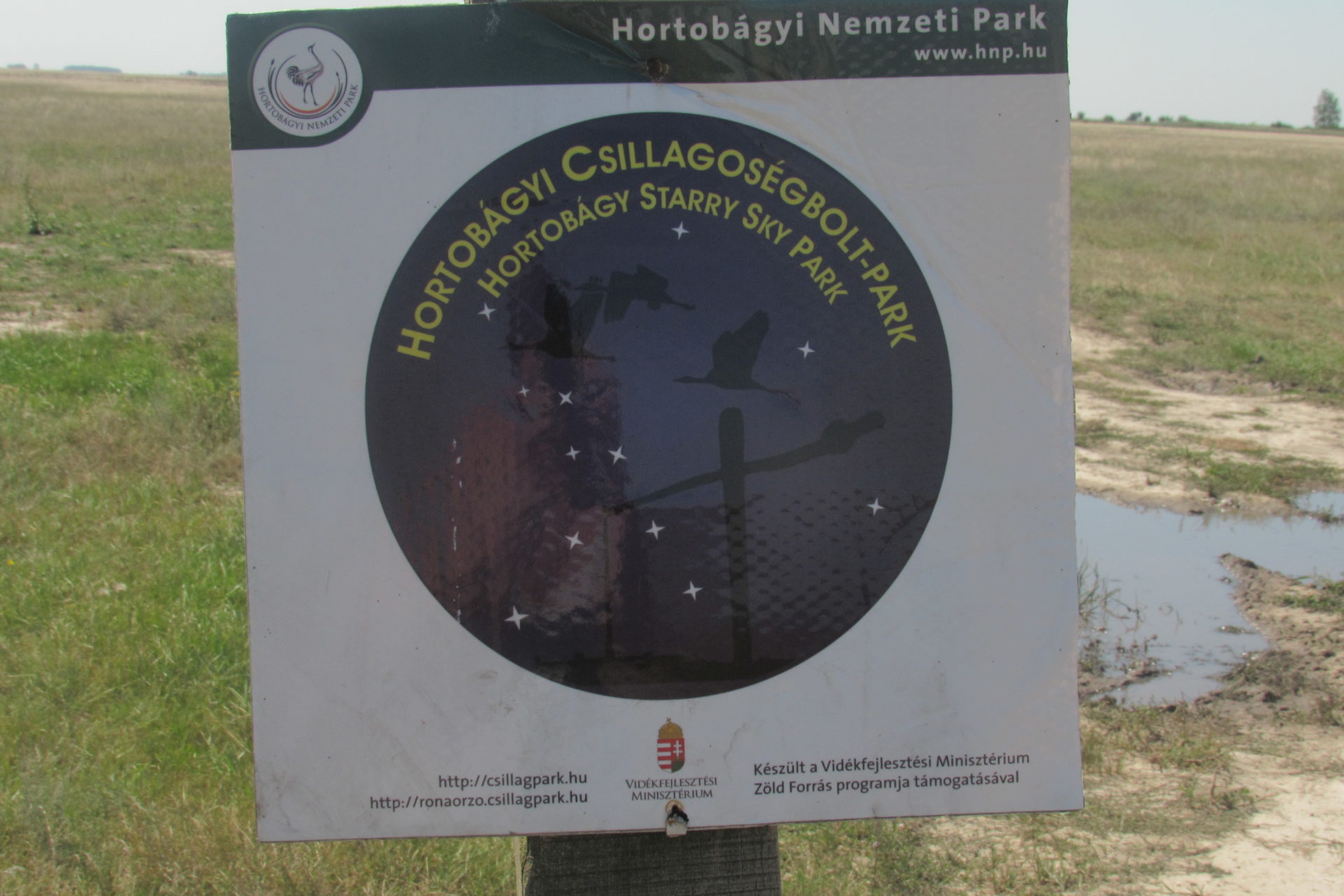 Elég megdöbbentő, de tény, hogy egyik, ha nem a legnagyobb Nemzeti parkunkon nem vezet át gyalog út, csak a 33-as nagy forgalmú autóút. Ahol elvben lehetne menni, ott mindenhol tiltó tábla van, illetve néhol jó drágán megvett látogatójeggyel be lehet menni. (Amiben az a különösen pikáns, hogy a Nemzeti park másik végében van a hely, ahol megvásárolható a jegy. 🙂 ) Így hát az autóúton indultunk el. Nagyon rossz volt haladni rajta, de nem is annyira fizikailag, hanem agyilag. Nem mondhatnám, hogy valami kellemes élmény a kamionok, motorosok, bálákat szállító hatalmas traktorok hangja és lökete, amit testközelből átélhet így az ember. Nem beszélve a száguldó autósokról. Ezért aztán tilos vagy nem – egy ponton lementünk az út mellé. Vicces, hogy néhol az egyik oldalon, néhol a másikon találtunk tiltó táblát, így e szerint haladtunk. A legfurább tábla azért mégis csak a “Hortobágyi csillagos ég program” táblája, amit a kormány támogat. Persze gondolom nem ők tették és teszik minden este a csillagokat az égre, de kicsit a tábla alapján úgy tűnt! 🙂 Ezen jót nevettünk. Találtunk egy lest, amire engedély nélkül is fel lehet menni. Innen láttunk egy nagy gulyát, amit le is fotóztam.