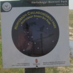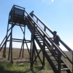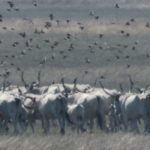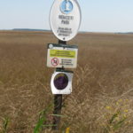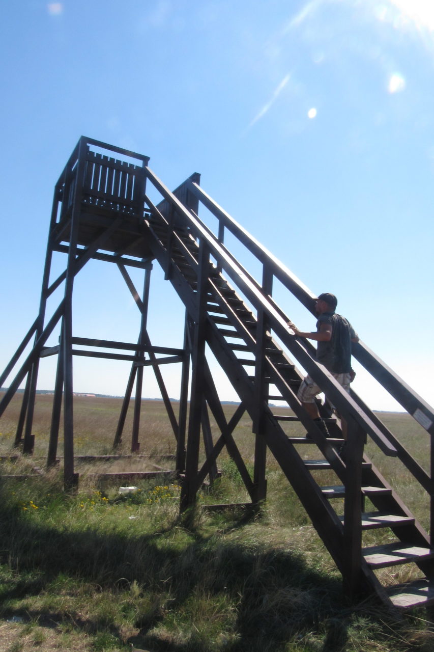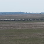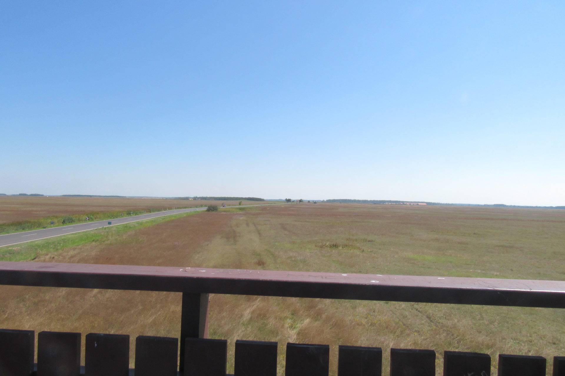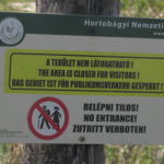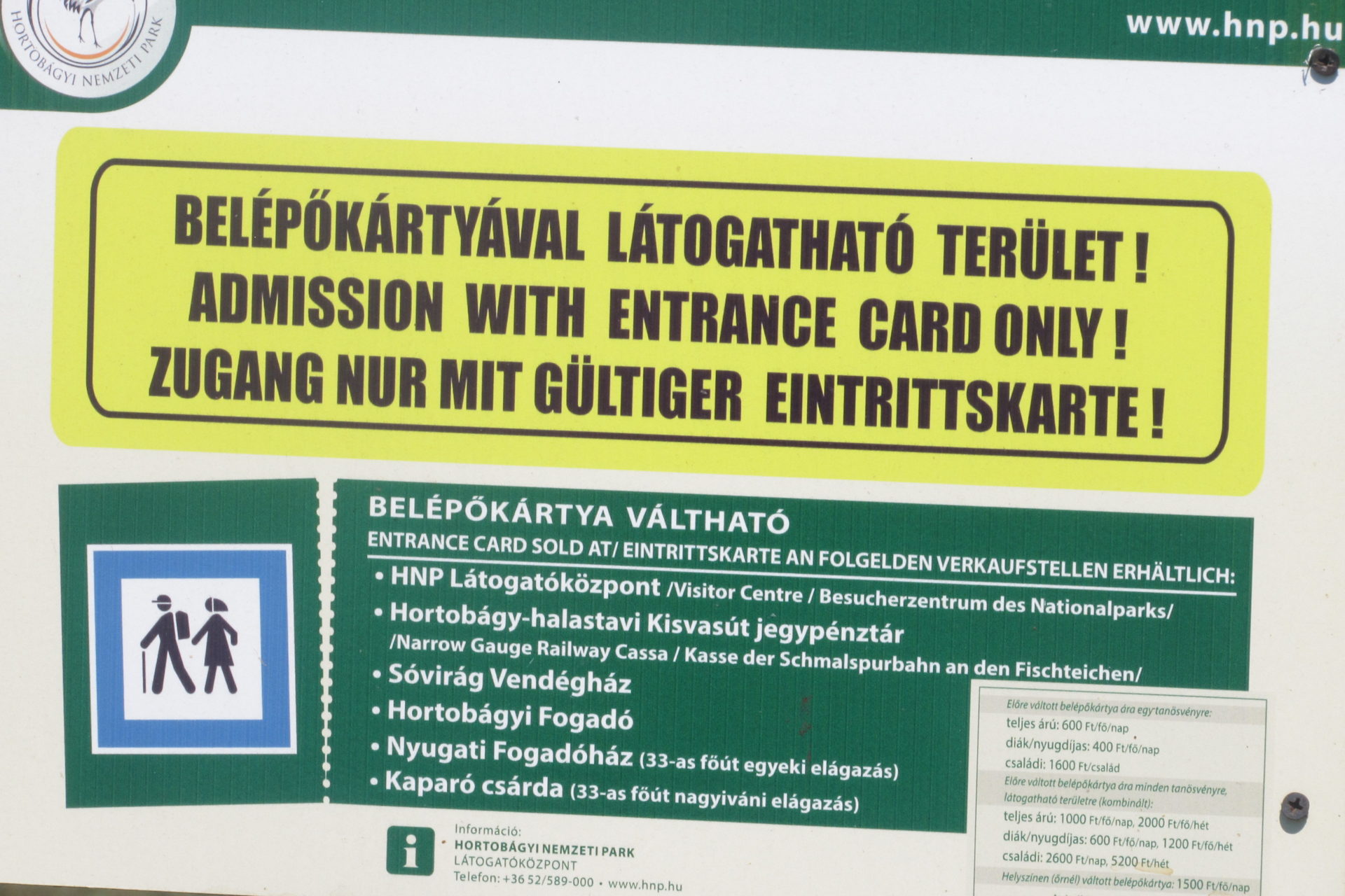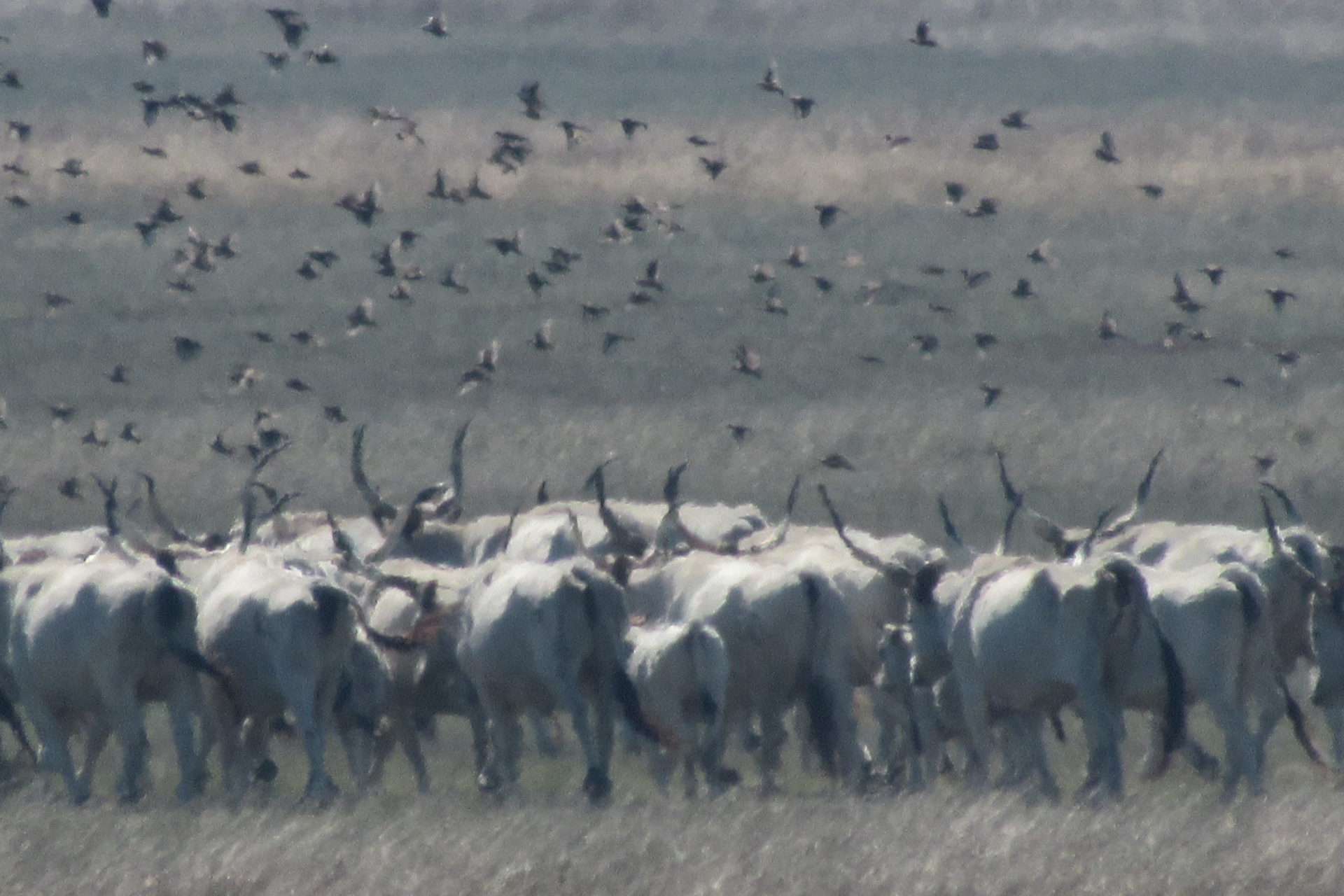 Elég megdöbbentő, de tény, hogy egyik, ha nem a legnagyobb Nemzeti parkunkon nem vezet át gyalog út, csak a 33-as nagy forgalmú autóút. Ahol elvben lehetne menni, ott mindenhol tiltó tábla van, illetve néhol jó drágán megvett látogatójeggyel be lehet menni. (Amiben az a különösen pikáns, hogy a Nemzeti park másik végében van a hely, ahol megvásárolható a jegy. 🙂 ) Így hát az autóúton indultunk el. Nagyon rossz volt haladni rajta, de nem is annyira fizikailag, hanem agyilag. Nem mondhatnám, hogy valami kellemes élmény a kamionok, motorosok, bálákat szállító hatalmas traktorok hangja és lökete, amit testközelből átélhet így az ember. Nem beszélve a száguldó autósokról. Ezért aztán tilos vagy nem – egy ponton lementünk az út mellé. Vicces, hogy néhol az egyik oldalon, néhol a másikon találtunk tiltó táblát, így e szerint haladtunk. A legfurább tábla azért mégis csak a “Hortobágyi csillagos ég program” táblája, amit a kormány támogat. Persze gondolom nem ők tették és teszik minden este a csillagokat az égre, de kicsit a tábla alapján úgy tűnt! 🙂 Ezen jót nevettünk. Találtunk egy lest, amire engedély nélkül is fel lehet menni. Innen láttunk egy nagy gulyát, amit le is fotóztam.