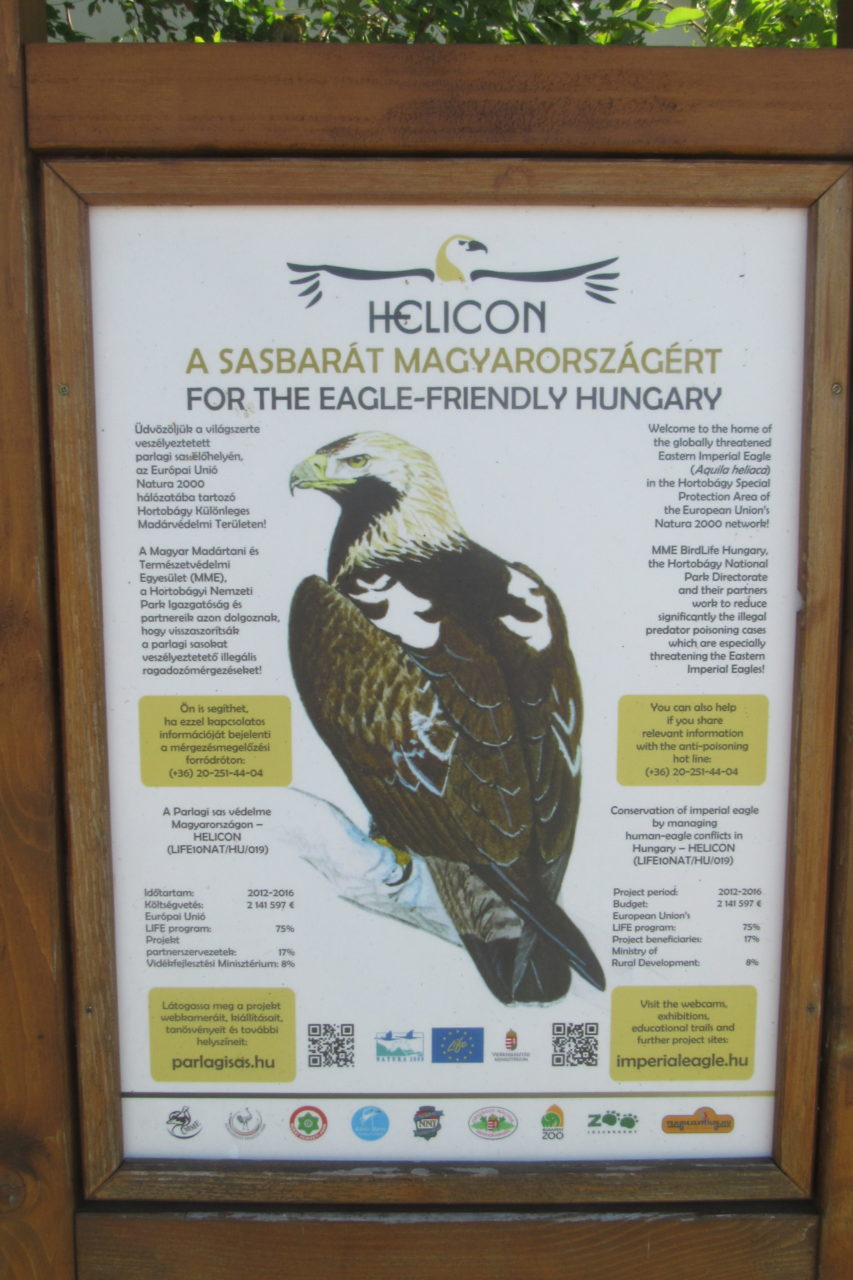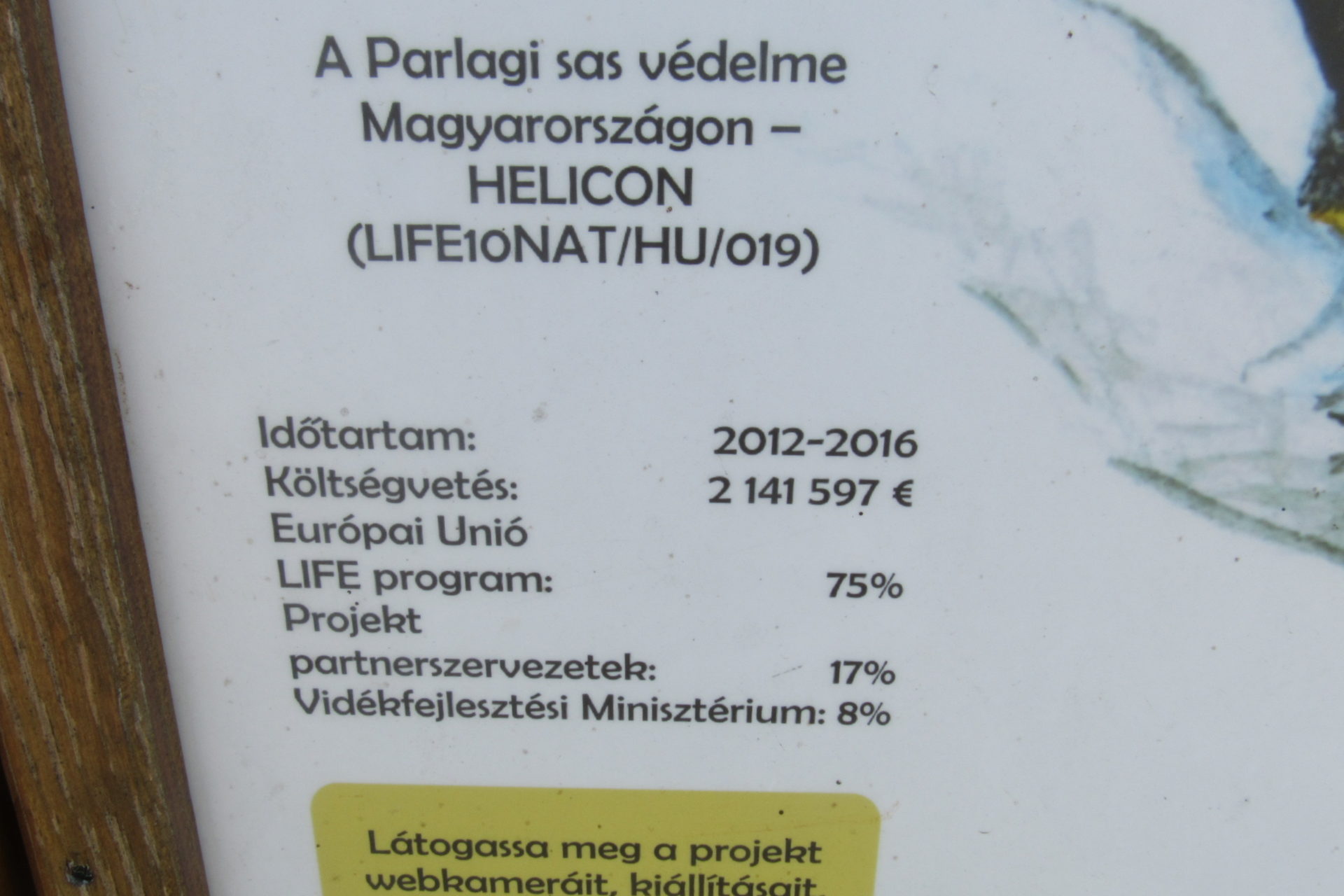 Nem csárda volt, hanem valami épület, ami a Kht-é. Itt találtunk egy táblát, miszerint valami irdatlan pénzt kaptak 2012. és 2016. közöttre a sasok megmentésére. Kicsit kiakadtam az összegen. (Nem tudom az ilyeneket megjegyezni, ezért lefotóztam!)