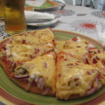 Megtaláltuk a másik helyet. Itt egy egészen sajátságos pizza-felfogással találkoztam. Kelt tészta (eddig stimmel a dolog, bár inkább a lángoshoz volt hasonlítható mind formáját, mind ízét tekintve) rajta ketchup, lilahagyma, paradicsom, uborka, majd ismét ketchup, majonéz, mustár, sajt mindez megsütve és ismét ketchup. Érdekes volt, de nagyon jól esett. Gergő evett még egy hot-dogot, ami szintén kicsit más volt, mint amit megszoktunk. Óriás kifli félbevágva, beletéve egy virsli és sajttal megszórva. (Ebben nem volt ketchup, lehet, hogy az ő adagja is az enyémre került. 🙂 ) Érdekes volt ebben a környezetben a porcelán tányér is, amin az evőeszközt kaptuk meg.
