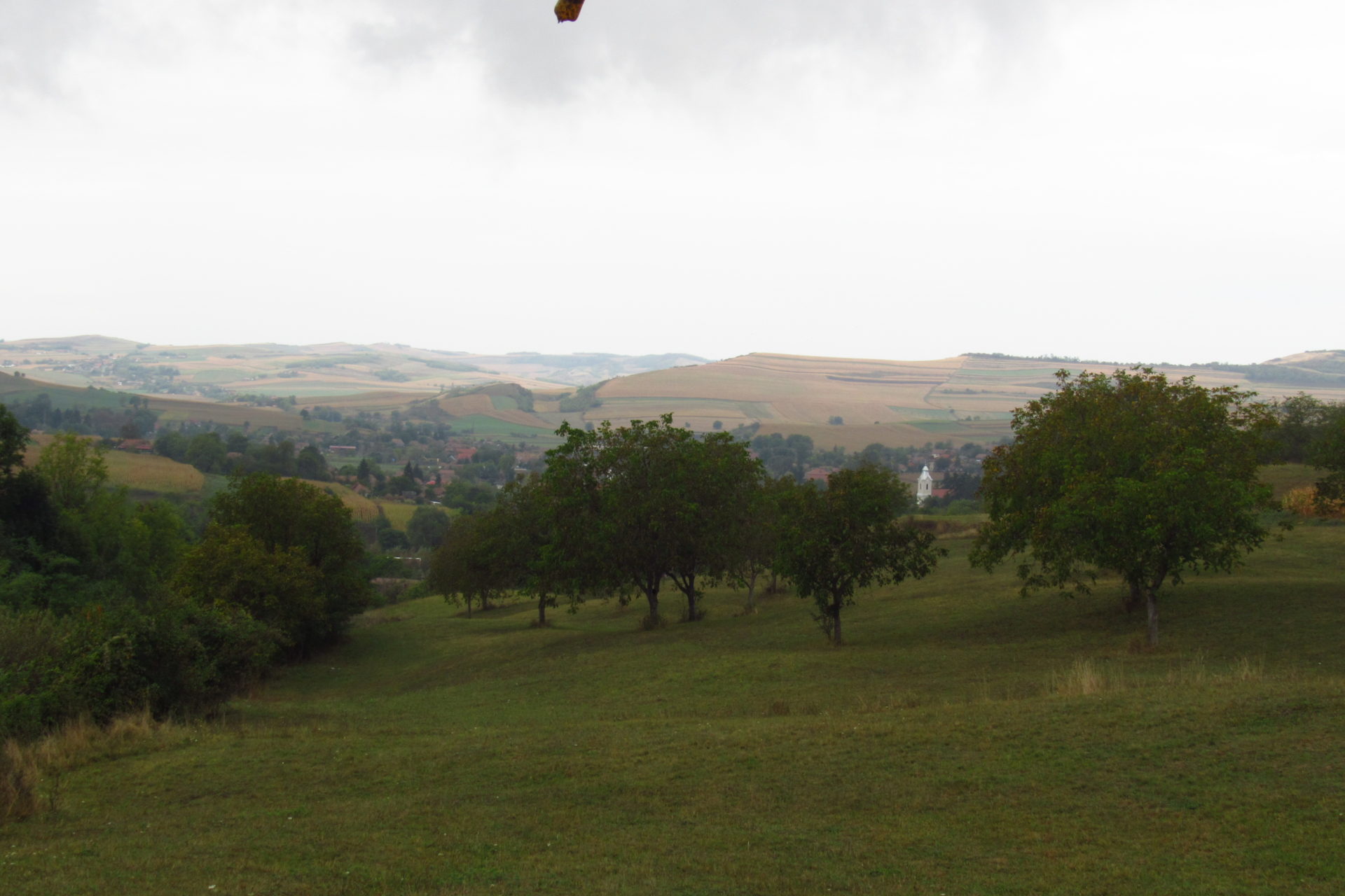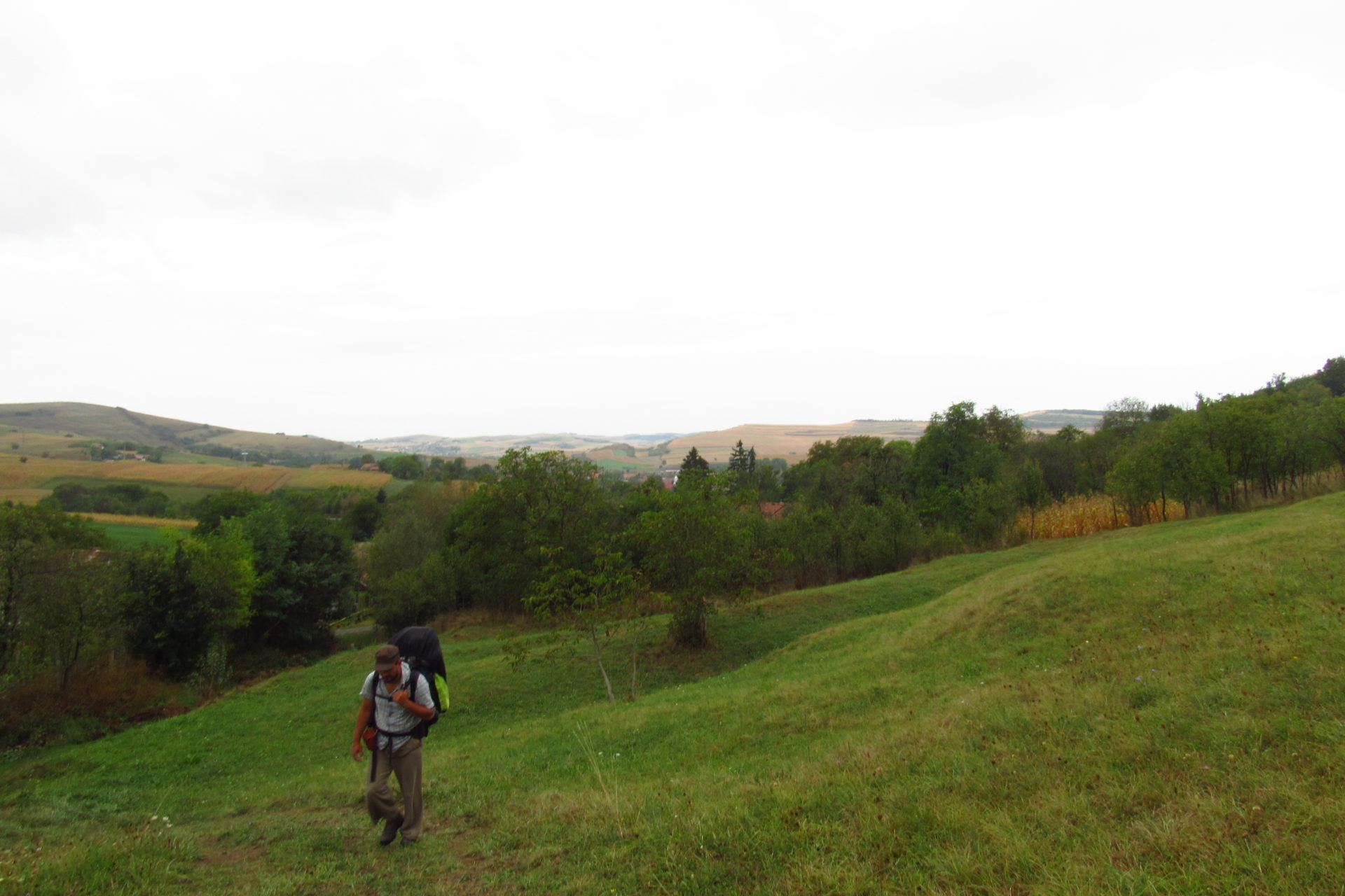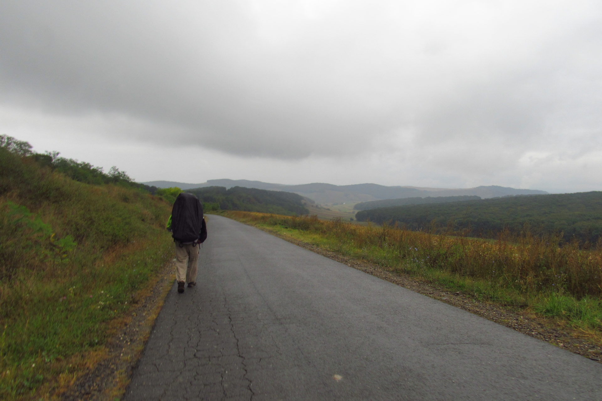 Kiérve végre a faluból újabb csodába értünk. Igazán nagyon szép domboldalra. Legelők és erdő. Rég mentünk erdőben. Kár, hogy esett, de így is nagyon jó volt. Szeretem az őszi erdőt. Kezdenek a levelek színesedni. Még nem pompáznak, de már nem zöld minden. Egy egészen jól jelölt szakaszon értünk el egy betonutat. Mellettünk a szokásos nyájak vonultak. Jó vizesek lettünk, de szerencsére még nem ázott be a bakancsom. Elértük egy kis falu szélét. Ekkor már jó egy-másfél órája jöttünk. Ilyenkor kb. meg szoktunk állni. Most úgy döntöttünk, menjünk. Nagyon jól bírjuk már. Igaz, most nincs is az a meleg, így aztán az újabb meredélynek megállás nélkül vágtunk neki. Ez egy erdei út, ami nem közvetlenül meredek, hanem hosszan és eléggé. Kivezetett minket egy fennsíkhoz, ahonnan megláttuk a délibábvárosunkat, Marosvásárhelyt.