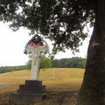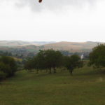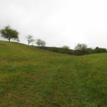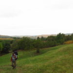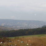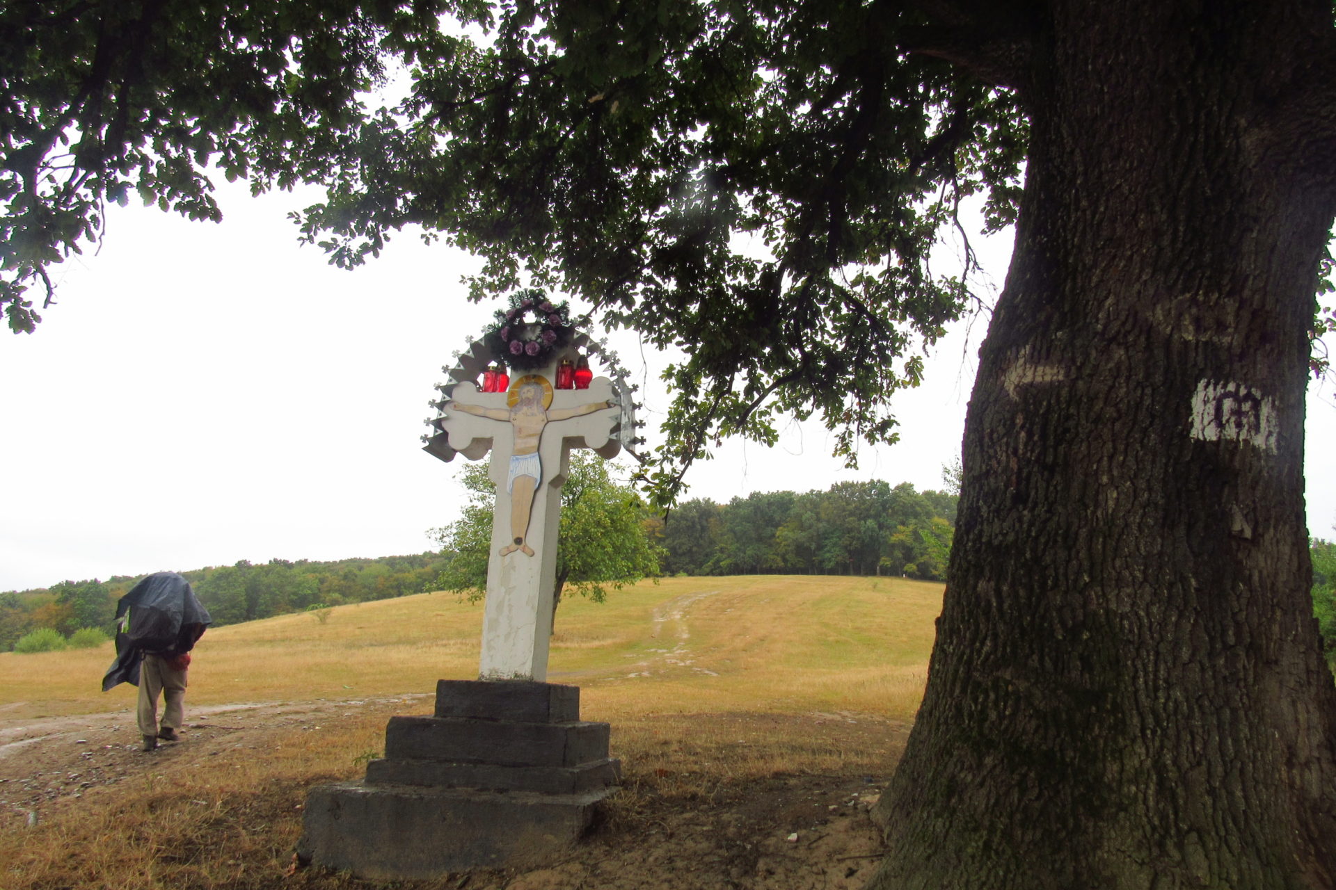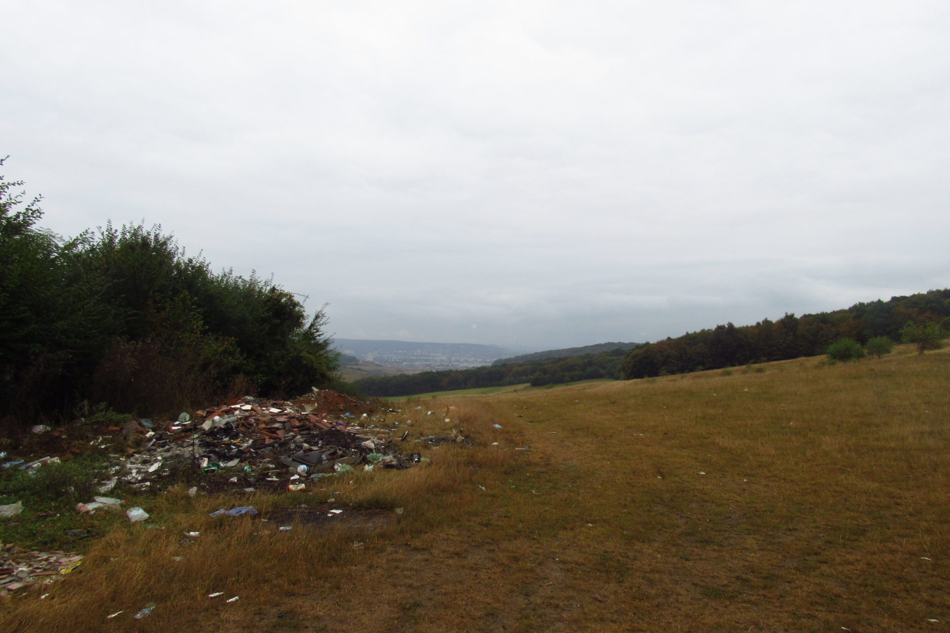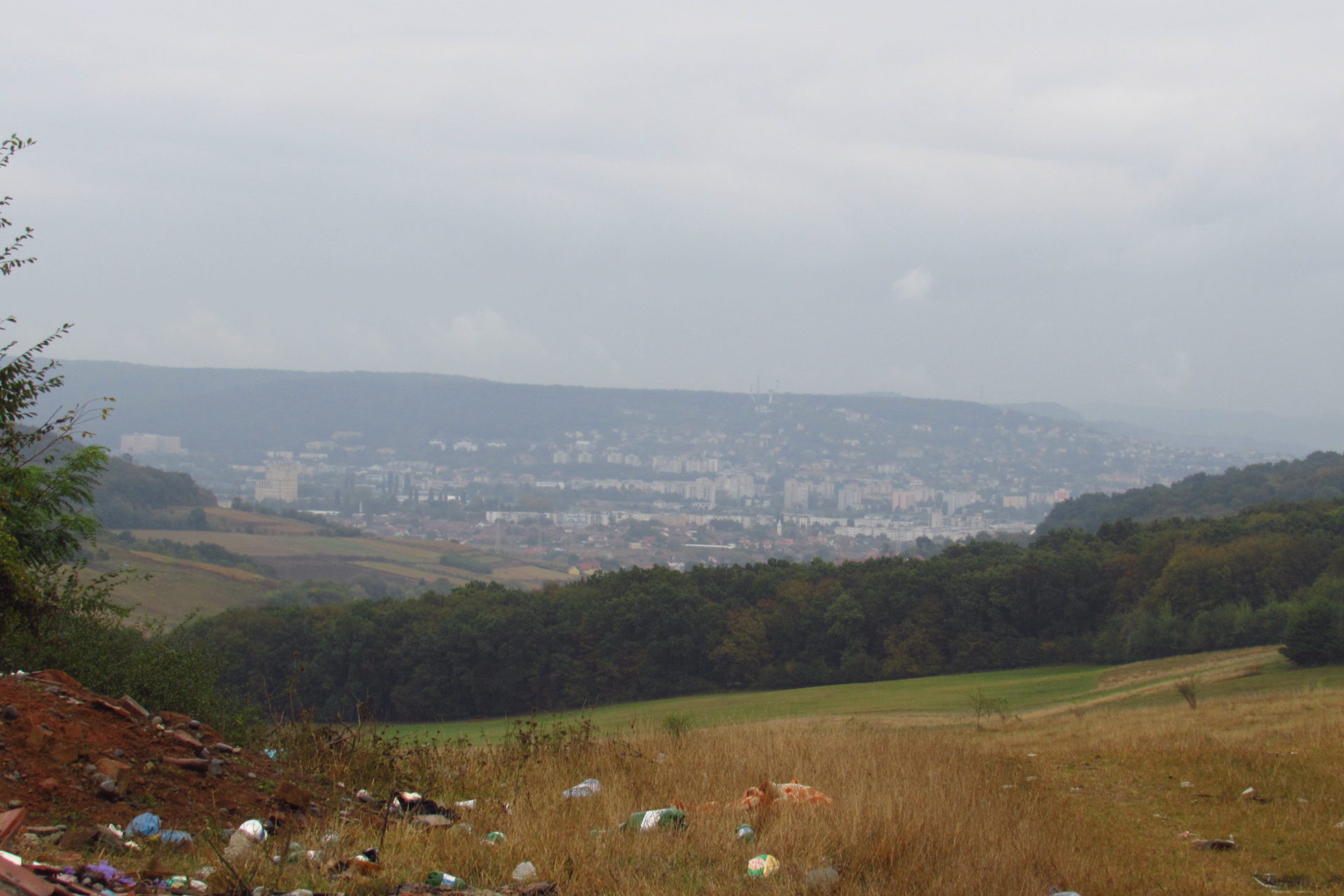 Kiérve végre a faluból újabb csodába értünk. Igazán nagyon szép domboldalra. Legelők és erdő. Rég mentünk erdőben. Kár, hogy esett, de így is nagyon jó volt. Szeretem az őszi erdőt. Kezdenek a levelek színesedni. Még nem pompáznak, de már nem zöld minden. Egy egészen jól jelölt szakaszon értünk el egy betonutat. Mellettünk a szokásos nyájak vonultak. Jó vizesek lettünk, de szerencsére még nem ázott be a bakancsom. Elértük egy kis falu szélét. Ekkor már jó egy-másfél órája jöttünk. Ilyenkor kb. meg szoktunk állni. Most úgy döntöttünk, menjünk. Nagyon jól bírjuk már. Igaz, most nincs is az a meleg, így aztán az újabb meredélynek megállás nélkül vágtunk neki. Ez egy erdei út, ami nem közvetlenül meredek, hanem hosszan és eléggé. Kivezetett minket egy fennsíkhoz, ahonnan megláttuk a délibábvárosunkat, Marosvásárhelyt.