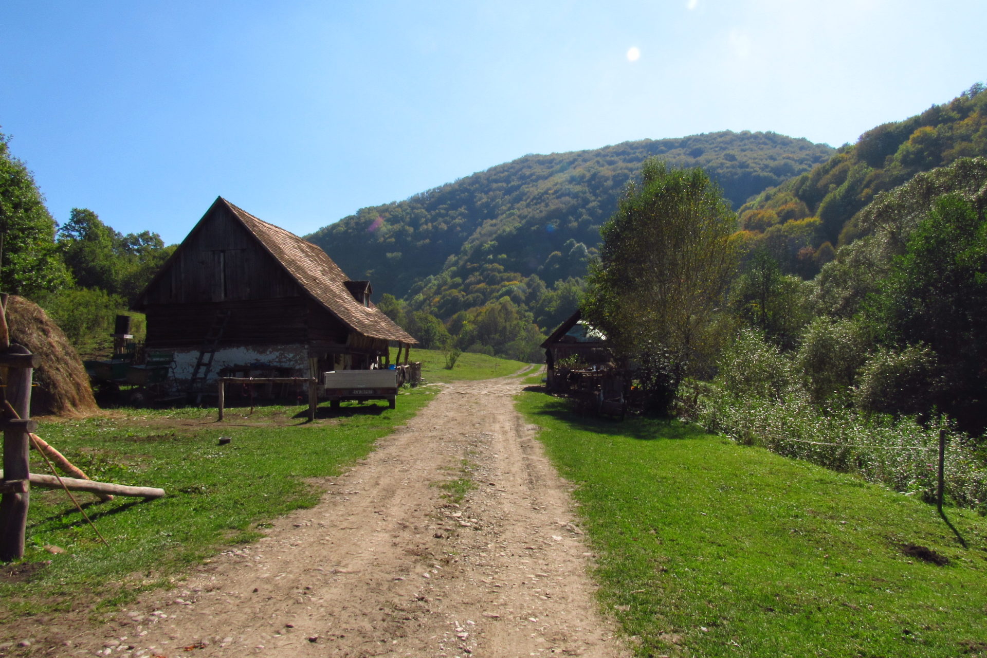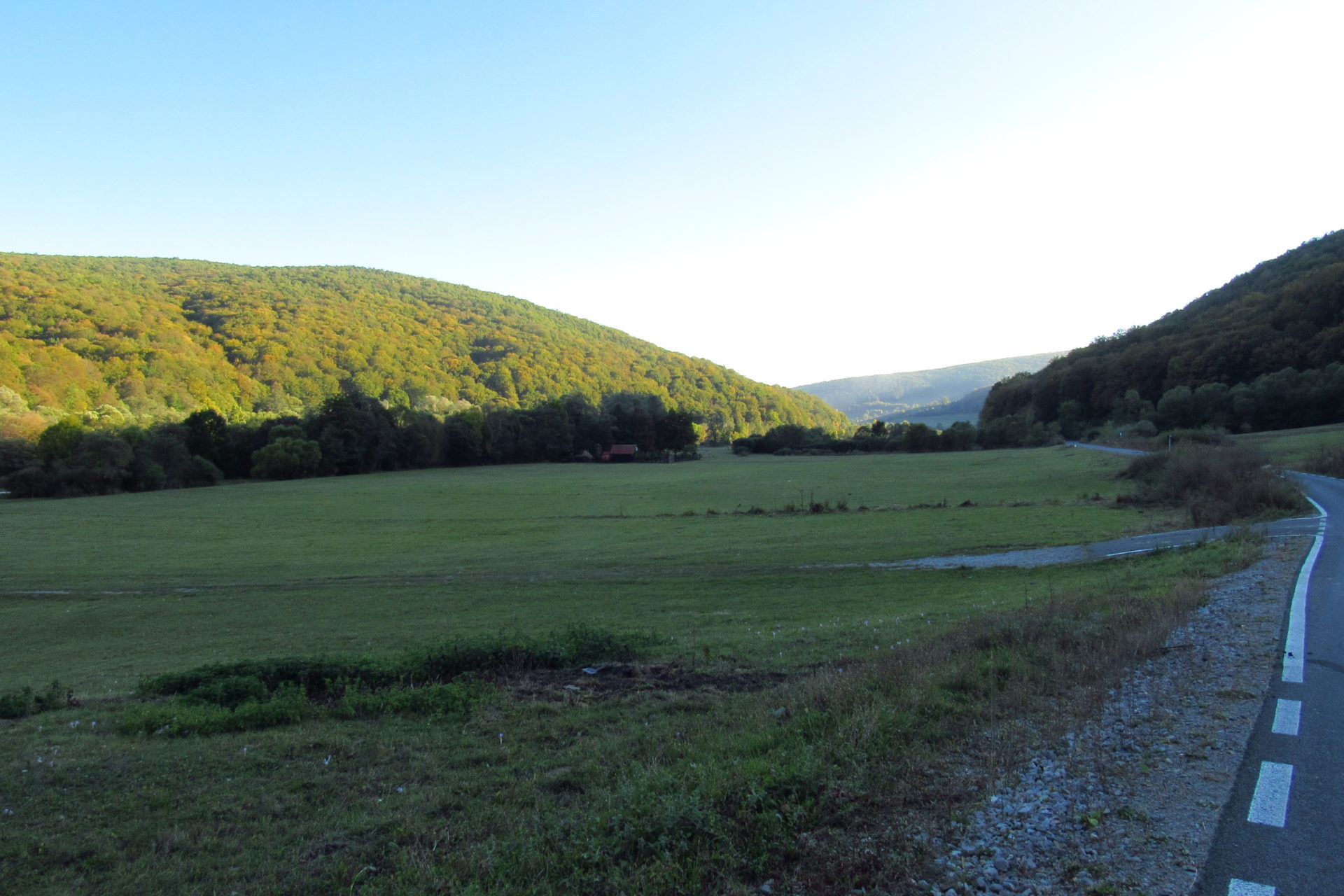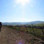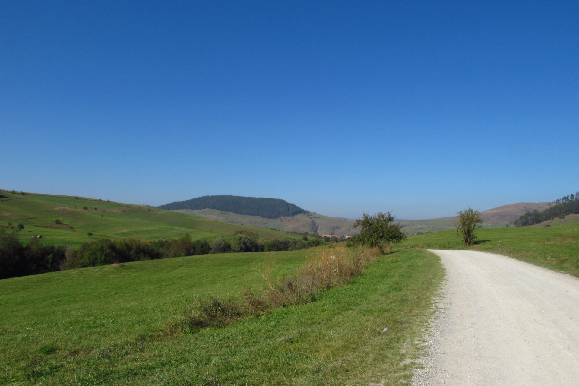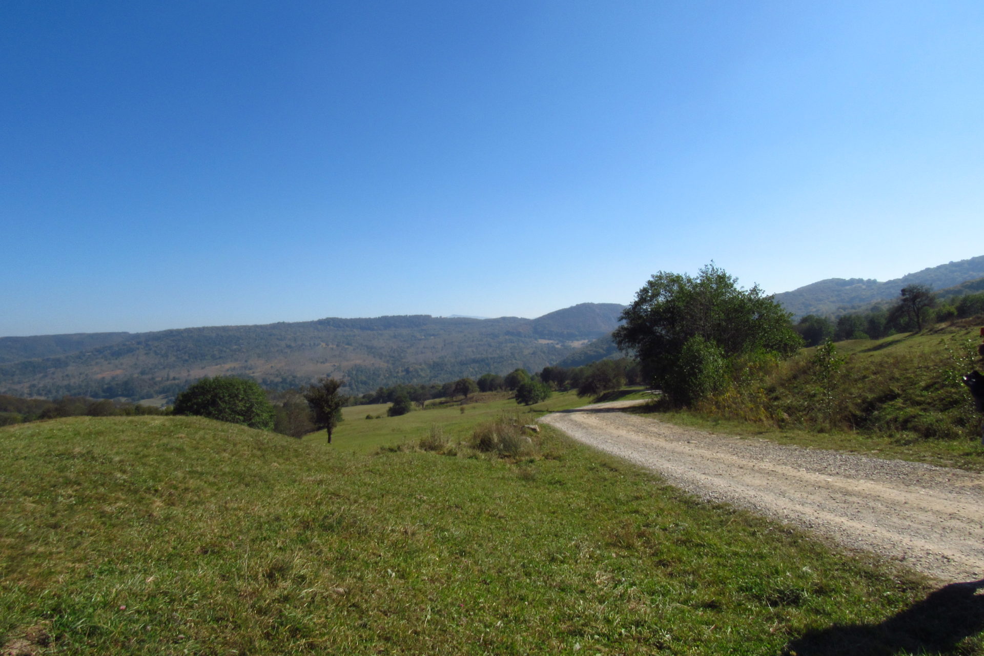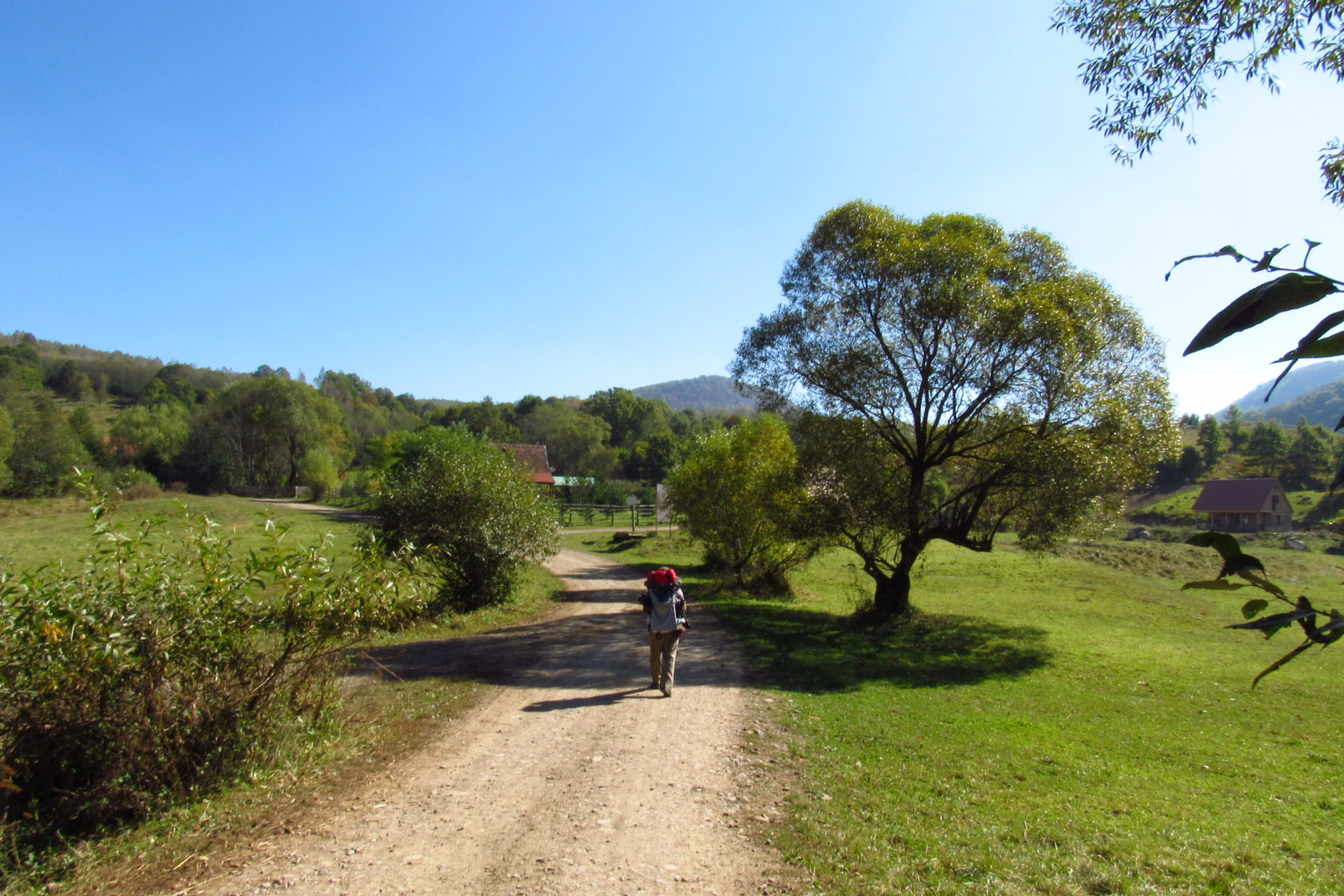 Hát ez a varázslatosság és egy igazi kalandtúra napja volt. (Eszembe is jutott ippi barátunk, aki ugye túlélő túrázóknak nézett minket. Hát ha most látott volna minket…. nem is tévedett olyan sokat! 🙂 ) Meg is beszéltük Gergővel, hogy ez a tényleg leírhatatlan kategória, mármint, ami a csodát illeti. Éreztük ezt már, ahogy kisétáltunk Almásról azonnal. De már a falu végén is. Az út, ami kivezet, egy csodálatos rétekkel, legelőkkel, erdőkkel tarkított, először kisebb, majd nagyobb dombra visz fel. Innen belátni az egész falut és a szemben lévő hegyet, melyen az az út kanyarog, amin előző nap beértünk a faluba. És ezt követi a valódi varázslat első fele. Álomszép kanyargós út a hegyek között, és azon át. Patak csörgedezik végig az út mentén, legelők, nyájak és gulyák itt is, ott is, kolompok és bácsok hangja, hatalmas ragadozó madarak (ölyv vagy sasok) szállnak felettünk, őszülő erdő, kék ég, napsütés. Nem lehet leírni, csak megélni. Egyébként megdöbbentően meleg lett. Ujjatlan pólóban és feltűrt nadrágban voltam végig ezen a szakaszon.
