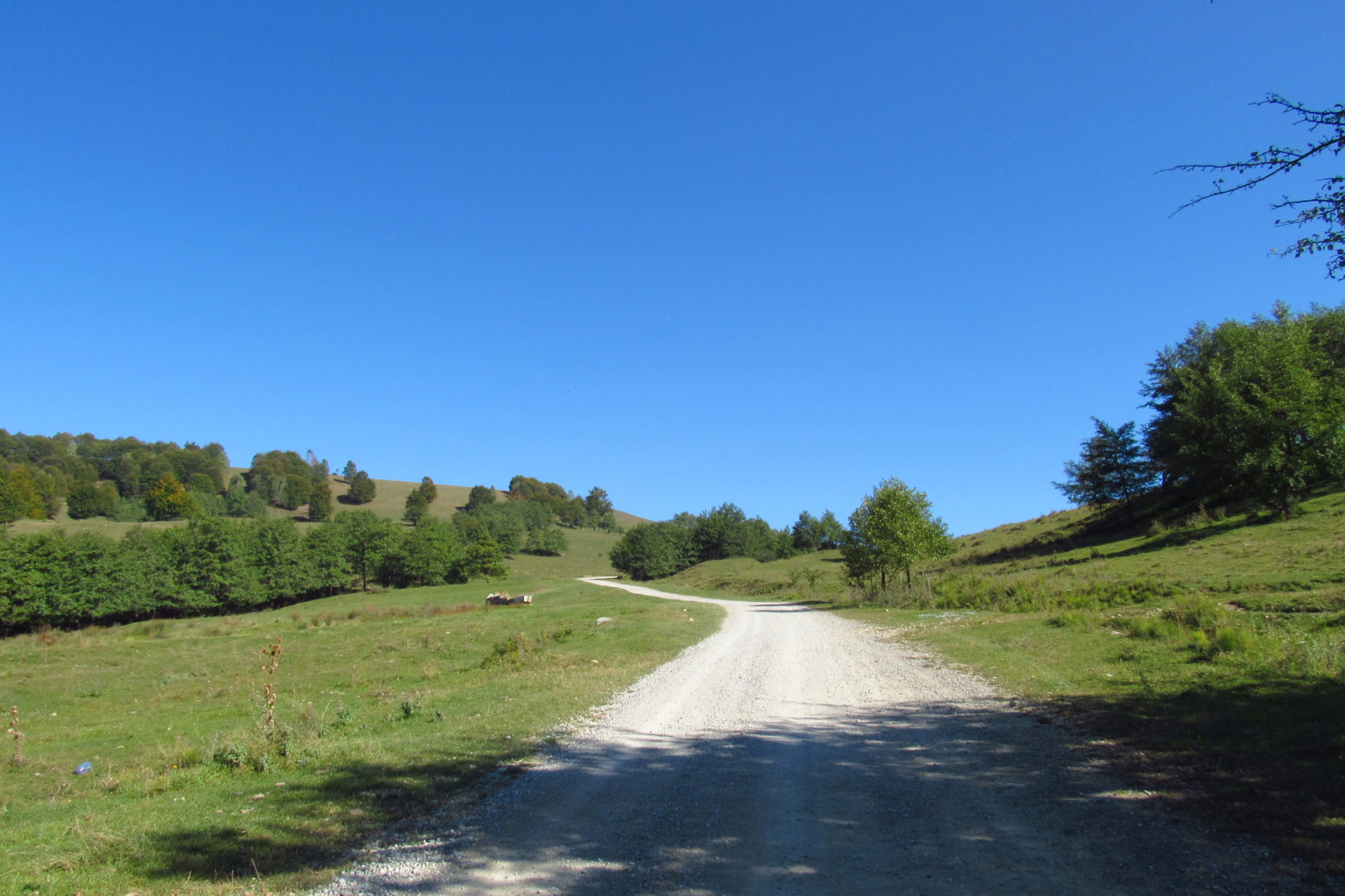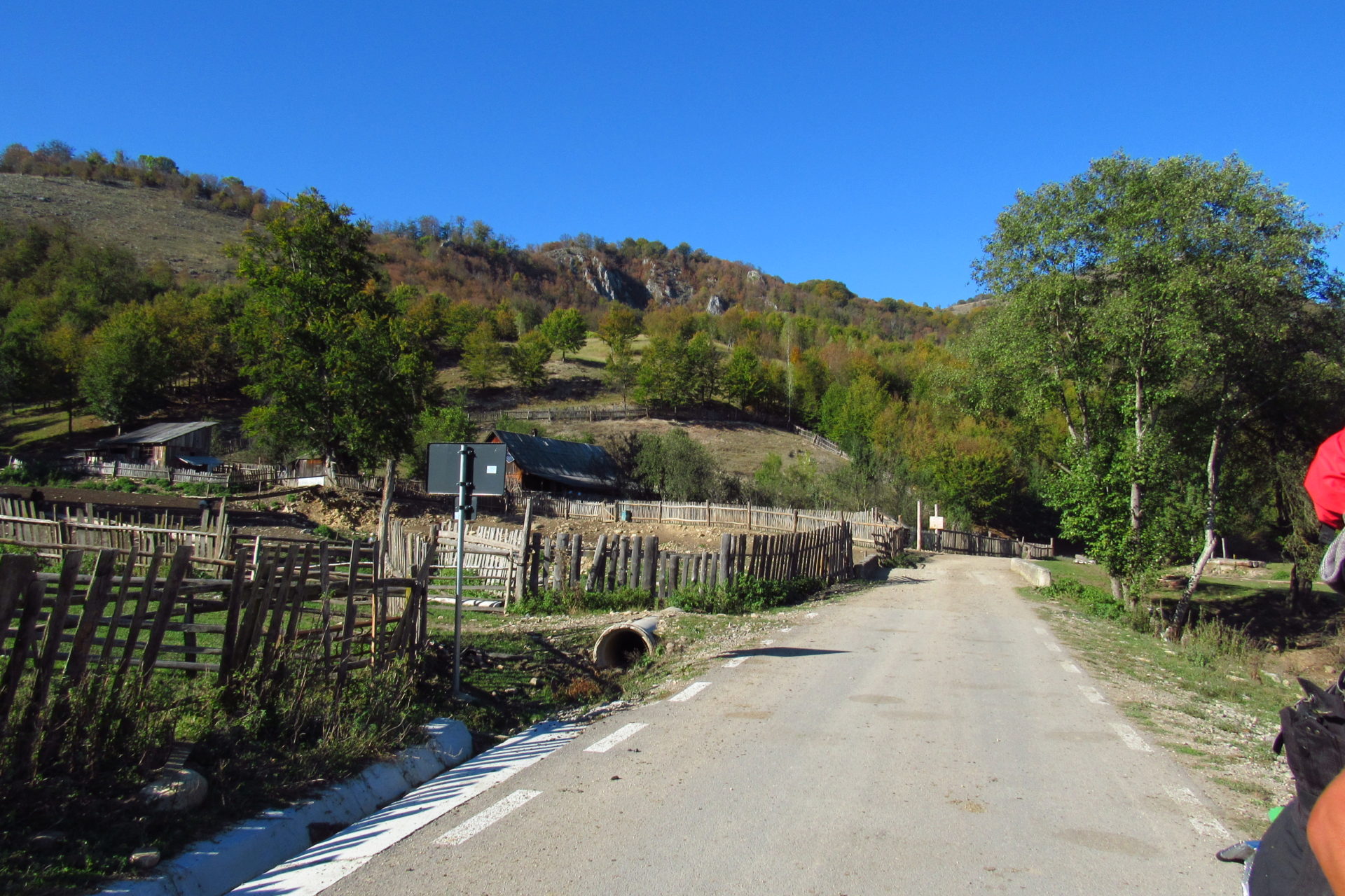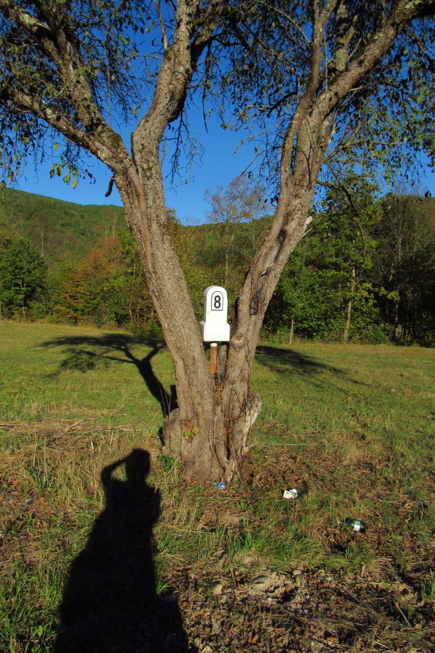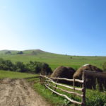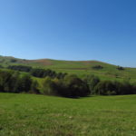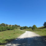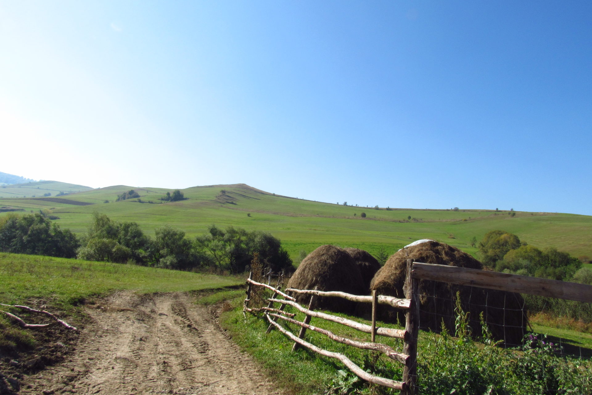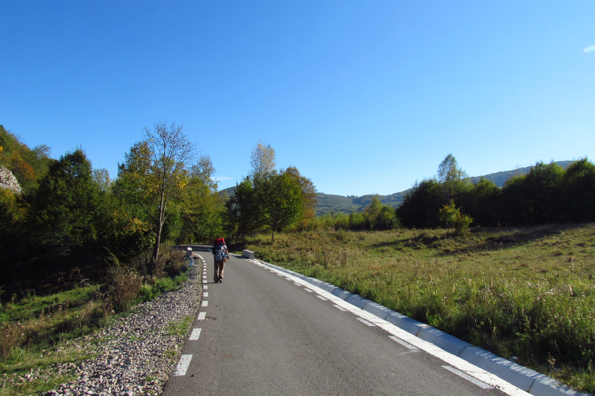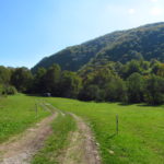 Hát ez a varázslatosság és egy igazi kalandtúra napja volt. (Eszembe is jutott ippi barátunk, aki ugye túlélő túrázóknak nézett minket. Hát ha most látott volna minket…. nem is tévedett olyan sokat! 🙂 ) Meg is beszéltük Gergővel, hogy ez a tényleg leírhatatlan kategória, mármint, ami a csodát illeti. Éreztük ezt már, ahogy kisétáltunk Almásról azonnal. De már a falu végén is. Az út, ami kivezet, egy csodálatos rétekkel, legelőkkel, erdőkkel tarkított, először kisebb, majd nagyobb dombra visz fel. Innen belátni az egész falut és a szemben lévő hegyet, melyen az az út kanyarog, amin előző nap beértünk a faluba. És ezt követi a valódi varázslat első fele. Álomszép kanyargós út a hegyek között, és azon át. Patak csörgedezik végig az út mentén, legelők, nyájak és gulyák itt is, ott is, kolompok és bácsok hangja, hatalmas ragadozó madarak (ölyv vagy sasok) szállnak felettünk, őszülő erdő, kék ég, napsütés. Nem lehet leírni, csak megélni. Egyébként megdöbbentően meleg lett. Ujjatlan pólóban és feltűrt nadrágban voltam végig ezen a szakaszon.