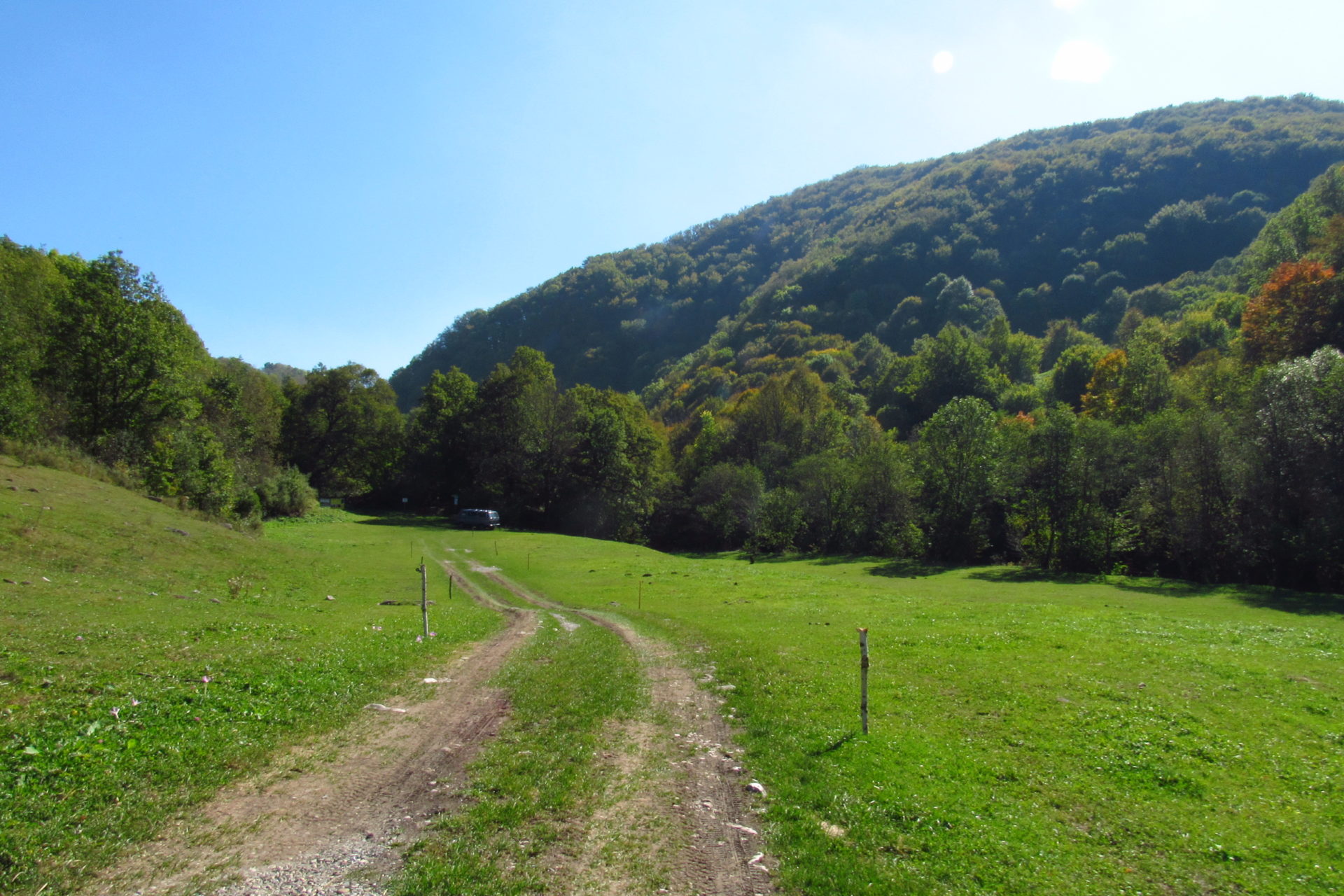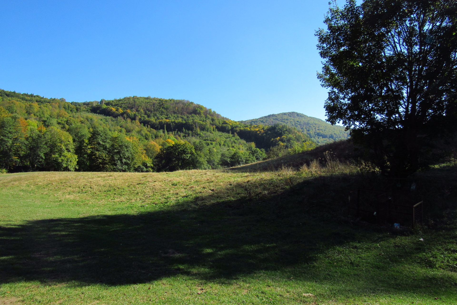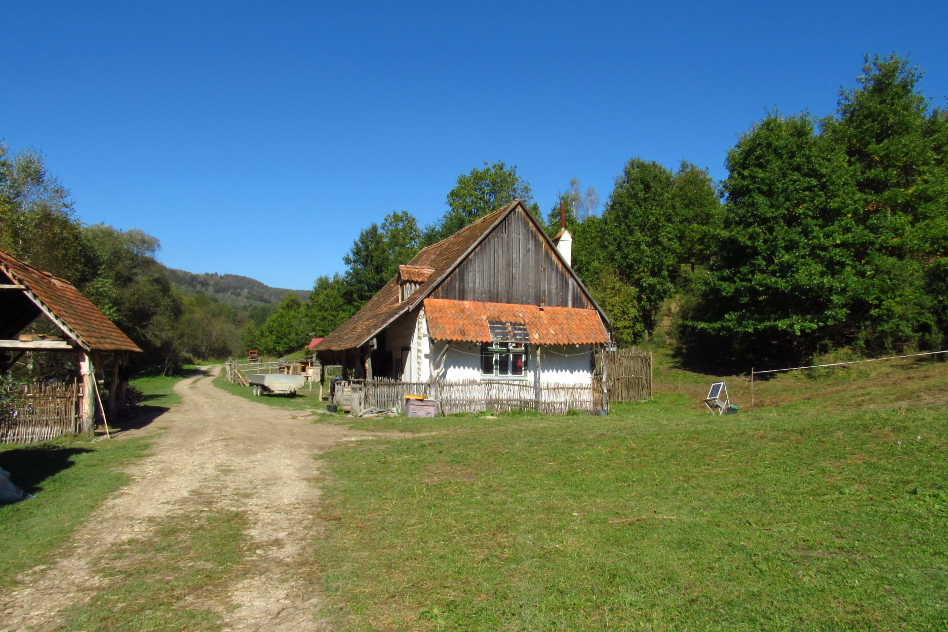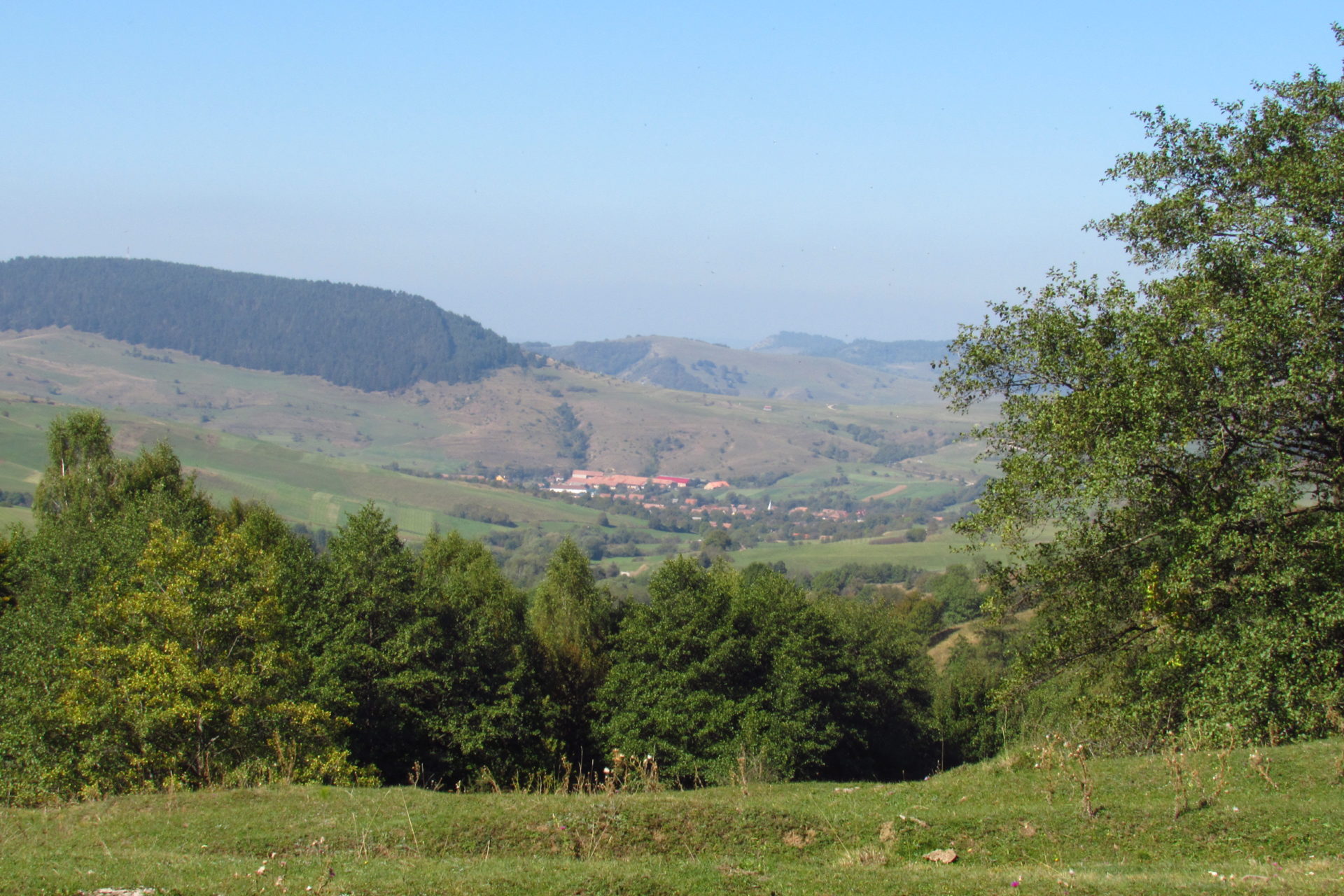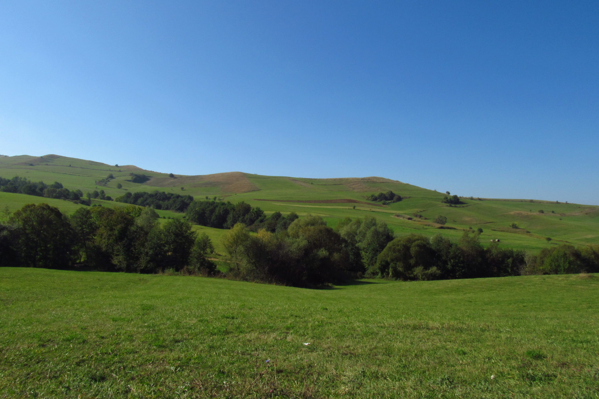 Hát ez a varázslatosság és egy igazi kalandtúra napja volt. (Eszembe is jutott ippi barátunk, aki ugye túlélő túrázóknak nézett minket. Hát ha most látott volna minket…. nem is tévedett olyan sokat! 🙂 ) Meg is beszéltük Gergővel, hogy ez a tényleg leírhatatlan kategória, mármint, ami a csodát illeti. Éreztük ezt már, ahogy kisétáltunk Almásról azonnal. De már a falu végén is. Az út, ami kivezet, egy csodálatos rétekkel, legelőkkel, erdőkkel tarkított, először kisebb, majd nagyobb dombra visz fel. Innen belátni az egész falut és a szemben lévő hegyet, melyen az az út kanyarog, amin előző nap beértünk a faluba. És ezt követi a valódi varázslat első fele. Álomszép kanyargós út a hegyek között, és azon át. Patak csörgedezik végig az út mentén, legelők, nyájak és gulyák itt is, ott is, kolompok és bácsok hangja, hatalmas ragadozó madarak (ölyv vagy sasok) szállnak felettünk, őszülő erdő, kék ég, napsütés. Nem lehet leírni, csak megélni. Egyébként megdöbbentően meleg lett. Ujjatlan pólóban és feltűrt nadrágban voltam végig ezen a szakaszon.
