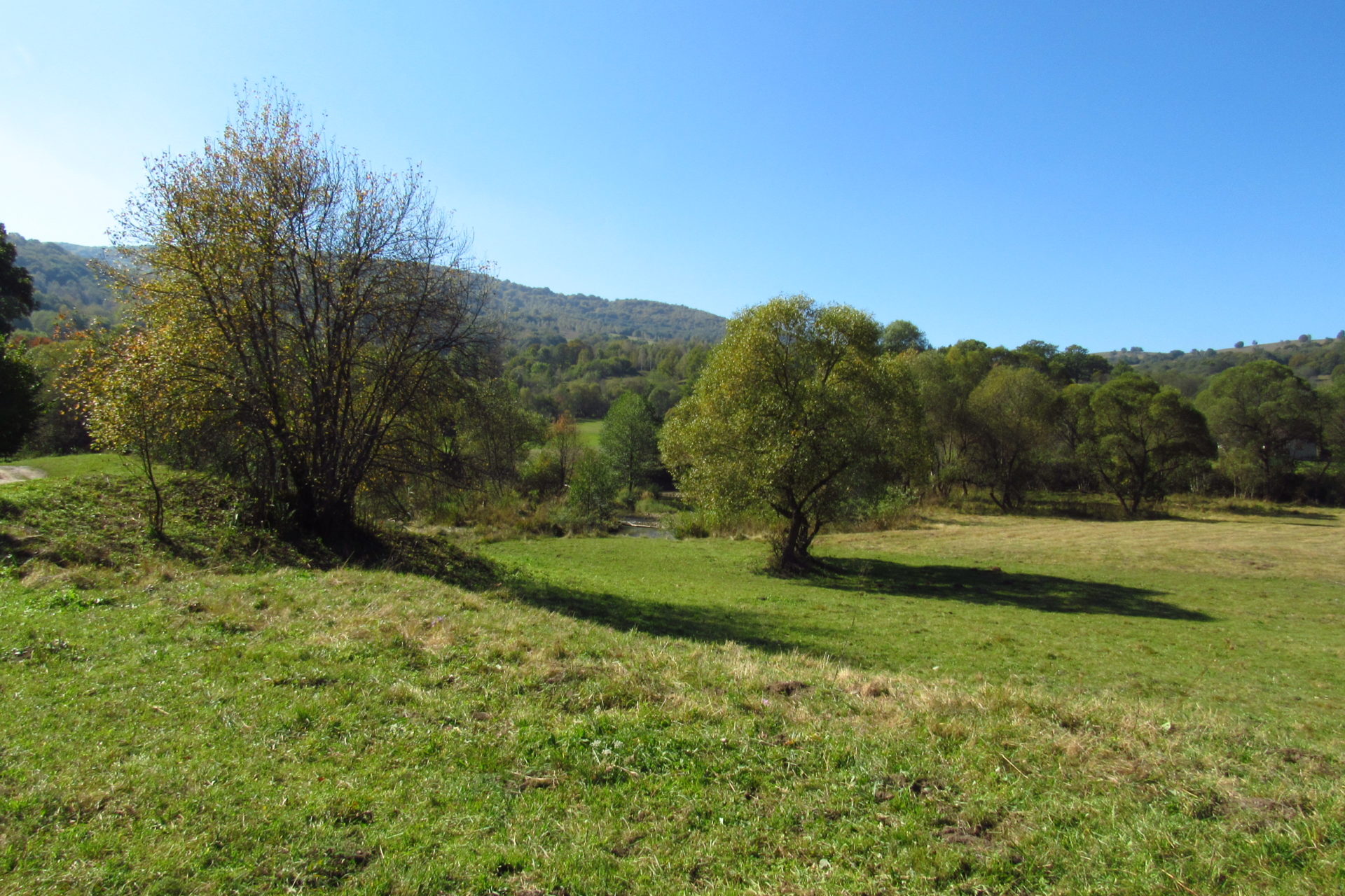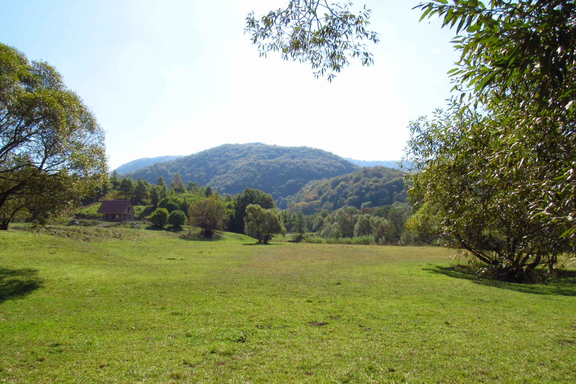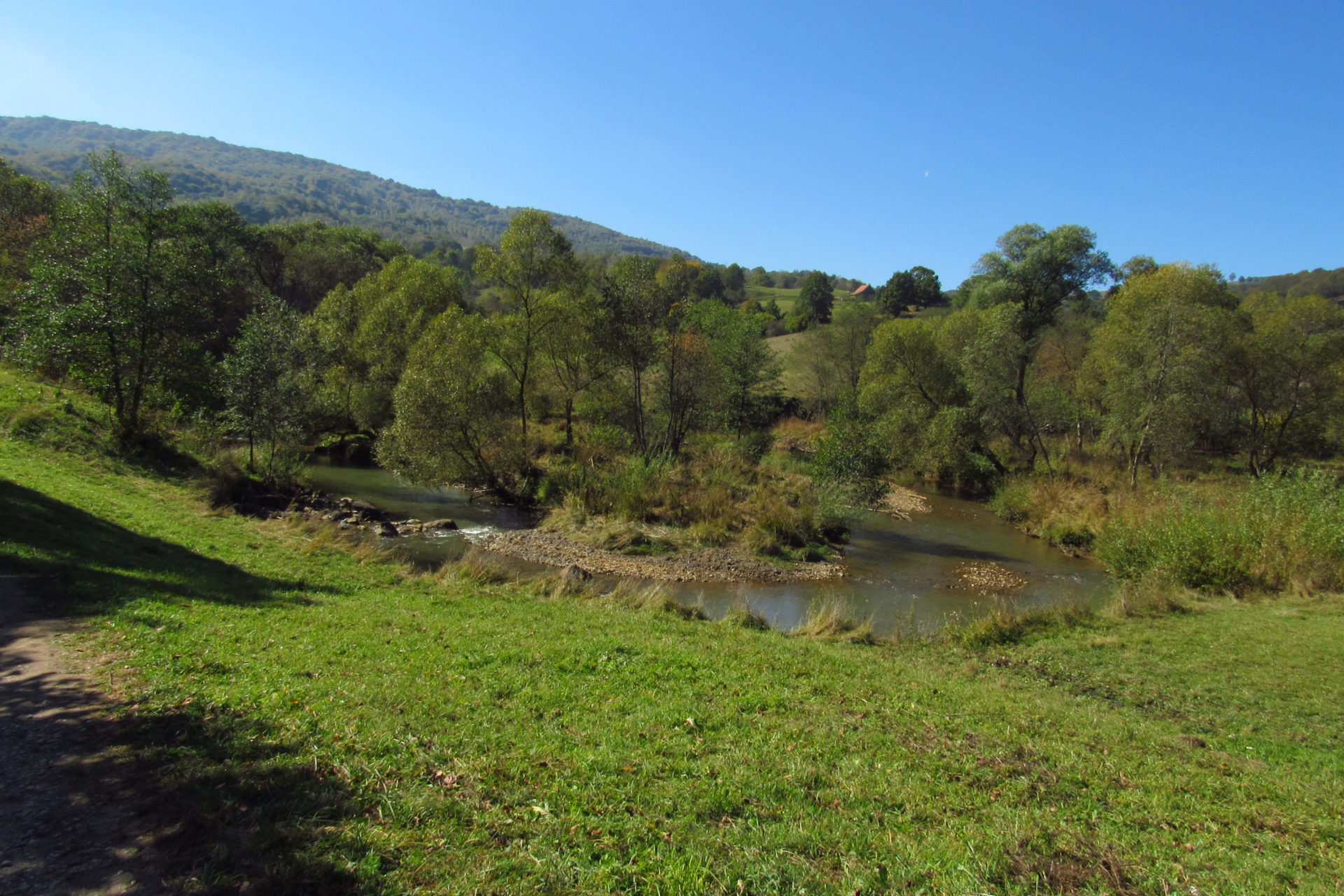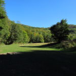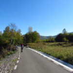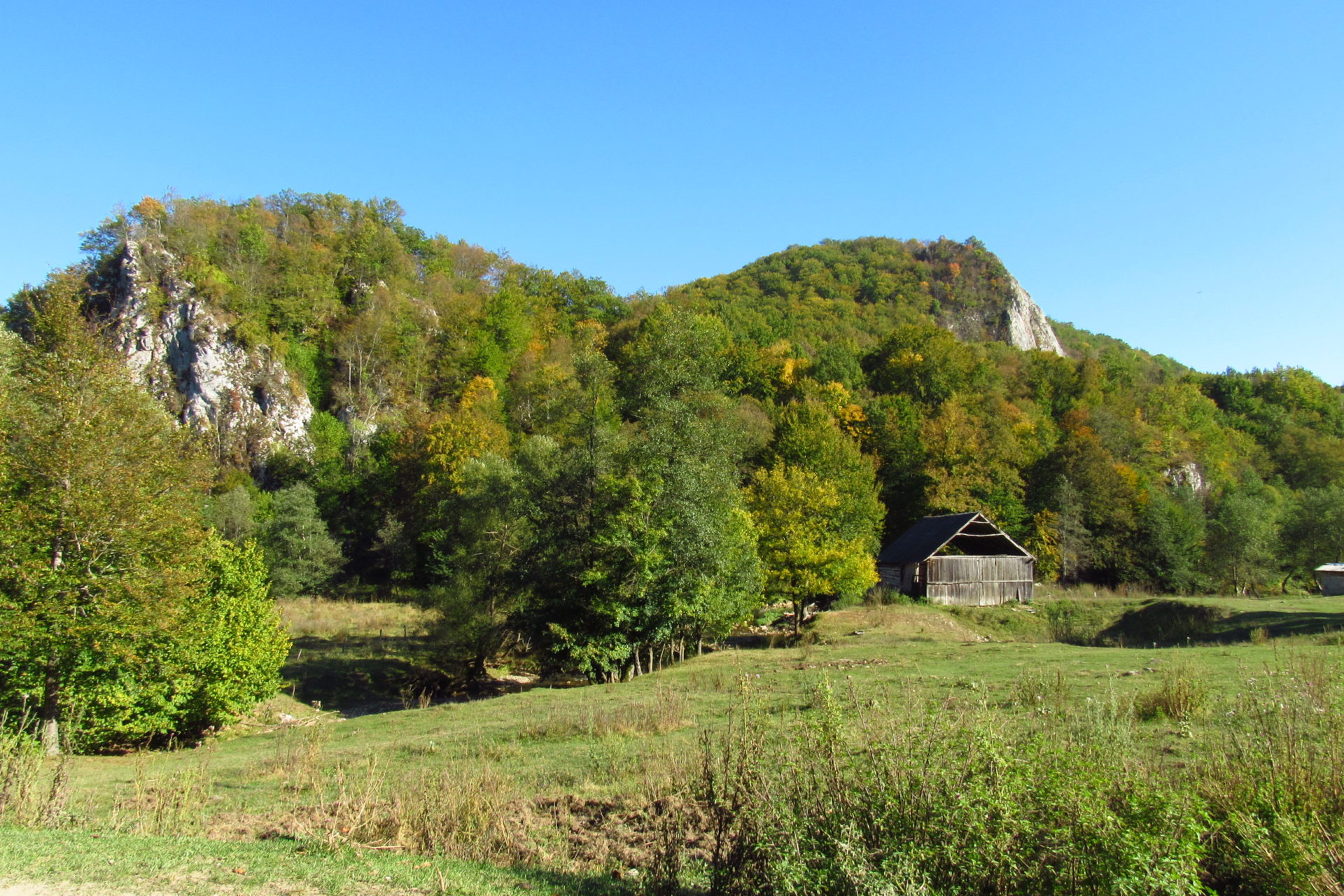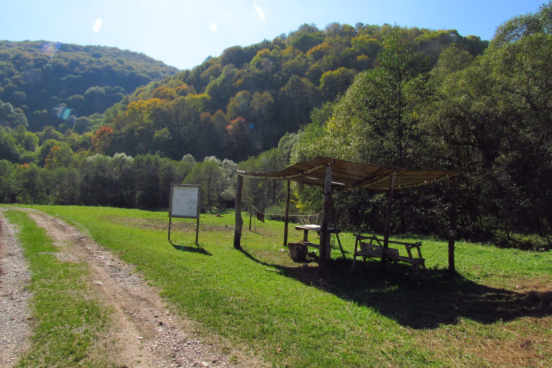 Hát ez a varázslatosság és egy igazi kalandtúra napja volt. (Eszembe is jutott ippi barátunk, aki ugye túlélő túrázóknak nézett minket. Hát ha most látott volna minket…. nem is tévedett olyan sokat! 🙂 ) Meg is beszéltük Gergővel, hogy ez a tényleg leírhatatlan kategória, mármint, ami a csodát illeti. Éreztük ezt már, ahogy kisétáltunk Almásról azonnal. De már a falu végén is. Az út, ami kivezet, egy csodálatos rétekkel, legelőkkel, erdőkkel tarkított, először kisebb, majd nagyobb dombra visz fel. Innen belátni az egész falut és a szemben lévő hegyet, melyen az az út kanyarog, amin előző nap beértünk a faluba. És ezt követi a valódi varázslat első fele. Álomszép kanyargós út a hegyek között, és azon át. Patak csörgedezik végig az út mentén, legelők, nyájak és gulyák itt is, ott is, kolompok és bácsok hangja, hatalmas ragadozó madarak (ölyv vagy sasok) szállnak felettünk, őszülő erdő, kék ég, napsütés. Nem lehet leírni, csak megélni. Egyébként megdöbbentően meleg lett. Ujjatlan pólóban és feltűrt nadrágban voltam végig ezen a szakaszon.