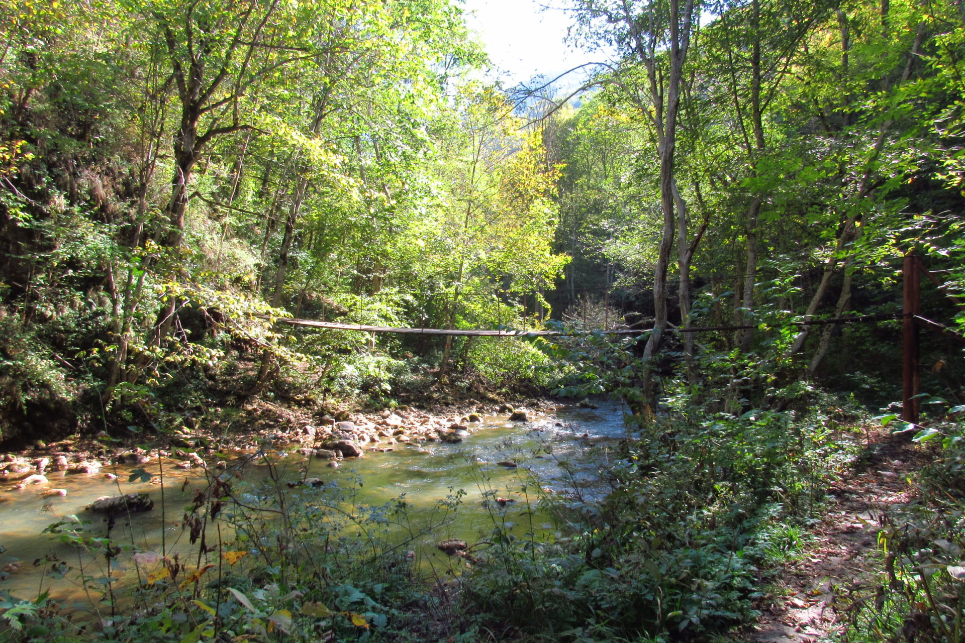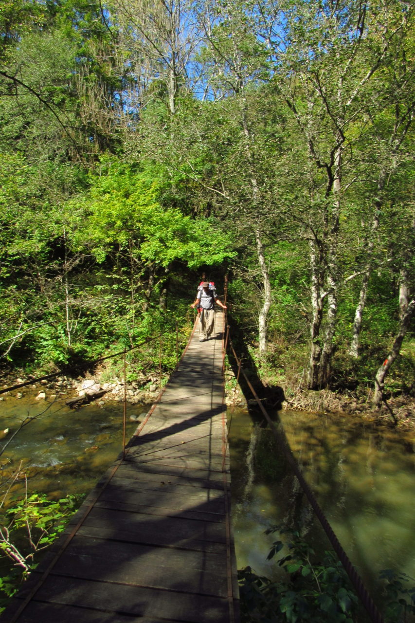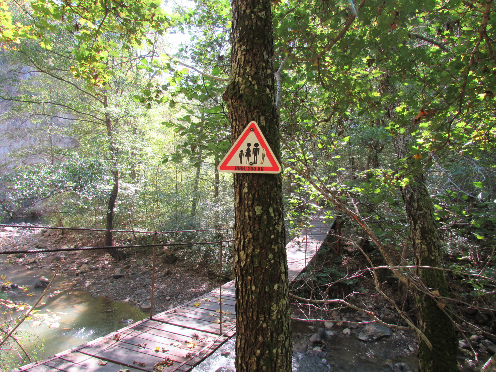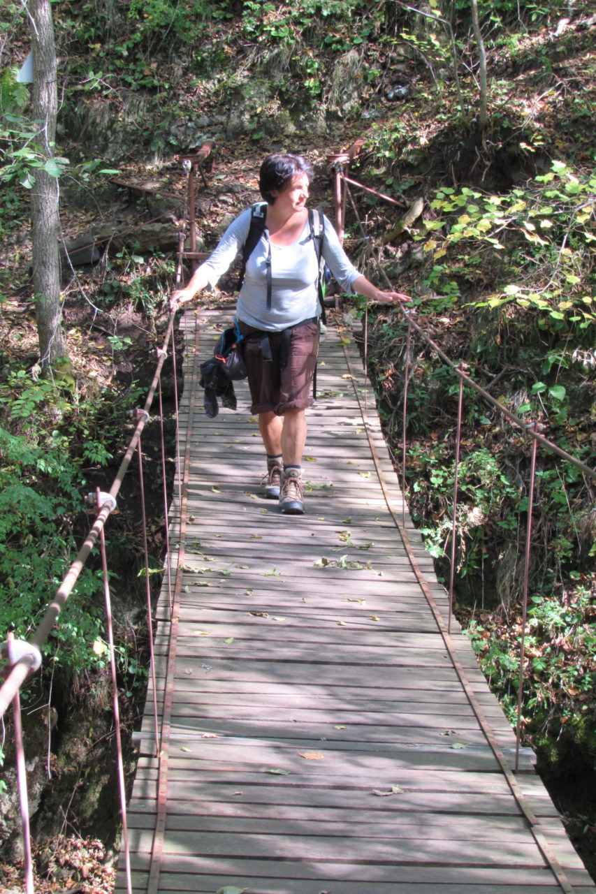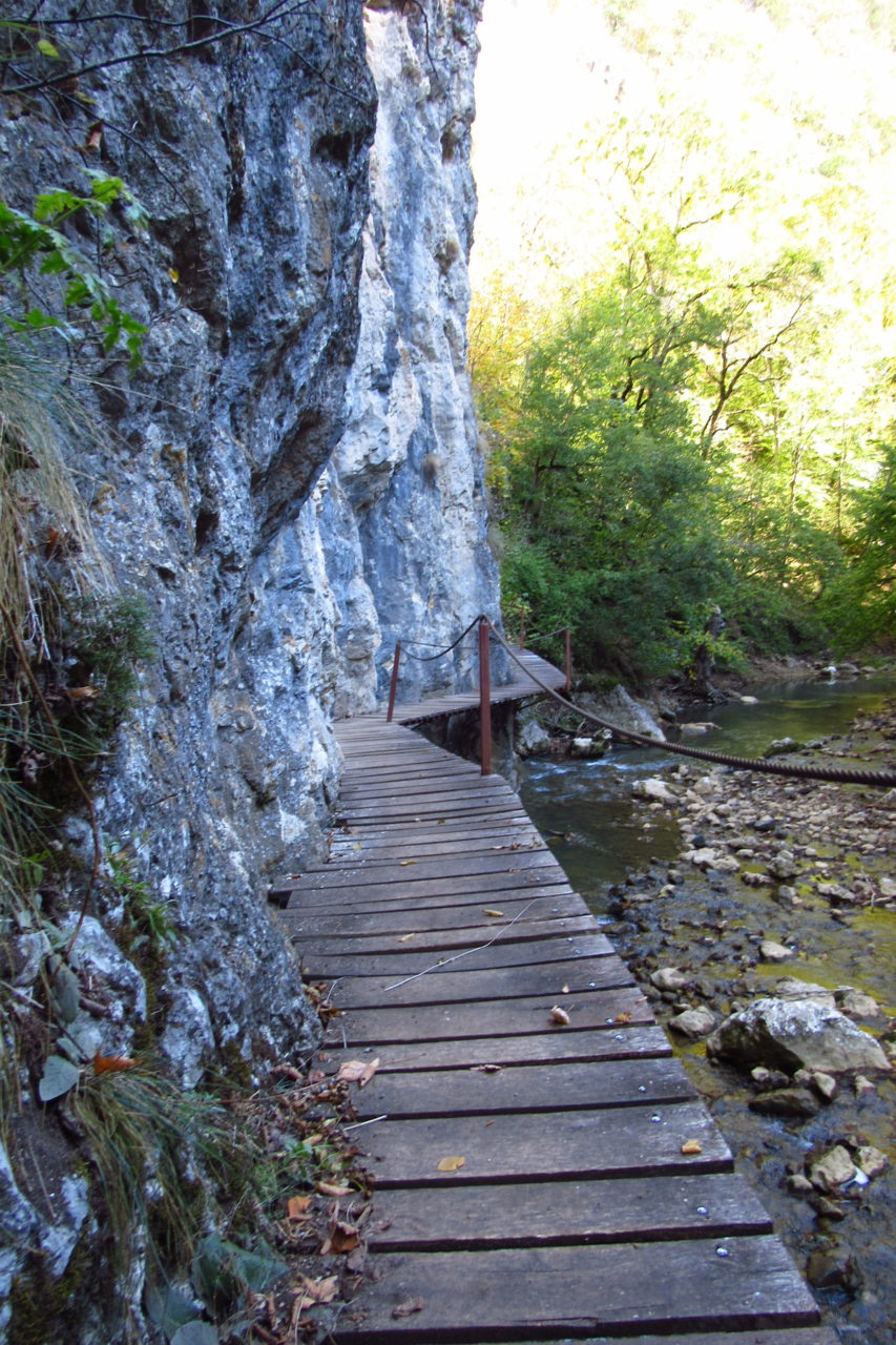 Hát erre aztán már tényleg nincsenek szavak. Ha csak az nem, hogy valóban varázslatos, és nem kicsit kihívásos, pláne ekkora zsákokkal. A bevezető szakasz elején van egy kis “bár”. Lehet kapni sört meg valamit még. Lehet lovagolni is meg ilyesmik. Nem volt ott senki, de igazán nem is akartunk volna betérni. Van egy tábla kitéve, hogy fizetni kell a természetvédelmi terület látogatásáért. Nem tudtuk először, hogy hol és kinek. Majd találtunk egy kiírást, hogy a területen járőröző parkőröknél. Így hát nekiindultunk. A háromakkora patak mentén haladtunk kicsit. Majd szembesültünk a meredéllyel, amire felvitt az útnak nehezen nevezhető, sziklás, sáros, gyökerekkel tarkított ösvény. Ezen felkapaszkodva egy korláttal ugyan védett, de rém keskeny sziklaperemre értünk. Épp hogy elfértünk a zsákokkal. Minden sziklás, csúszós, és meredek. De élveztük nagyon. Majd jöttek a pallóhidak. Én eddig ilyet csak filmen láttam. Főleg az Indiana Jonesban. Hát nem mondom, hogy az elsőnél nem gondoltam azt, hogy na, ezen hogy fogok átkelni! De nagyon klassz volt! Imádom, hogy az ember előtt nincs akadály. És milyen gyönyörű onnan lenézni a patakra, ami itt inkább már folyó. És a sziklák, amik között kanyarog, és a két part, amit összeköt! Na, nincs mit mondani, és nincs mit mondani! Ebből a típusú függő pallóhídból még jó néhány van itt. Egyik izgibb, mint a másik. Különösen a feljutás rájuk, hogy a lejutásról ne is beszéljünk! De van itt olyan fa híd is, aminek csak az egyik oldalon van korlátja, és olyan átkelés is, ahol nincs is híd, csak kidőlt fa. (Jobb esetben! 🙂 ) Át kellett haladnunk egy a sziklafalra szerelt pallósorom is. Itt kicsit nehezen fértünk a zsákkal, de ezen is túljutottunk. Elértünk egy hídhoz, aminél találkoztunk egy szegedi és egy székesfehérvári pár két nőtagjával. Ők jöttek egyébként a magyarországi autóval, amit láttunk is a szurdok bejáratánál. A két nő innen már nem ment tovább, mert a hídon átkelve nem tudtak lemászni a sziklákon. Kicsit beszélgettem velük, míg Gergő megkísérelte a fent említett lemászást. Hát, ez tényleg nem ment egyszerűen. Aztán persze én is átmentem a hídon, és Gergő, miután letette az ő zsákját, visszamászott az enyémért. Nagy nehezen letuszkoltuk a zsákot, és utánamásztam én is. Azt hiszem, nem sok olyan dolog, út lesz az életemben ezentúl, aminek ne merjek ezek után neki vágni! Nem olyan vészes egyébként az egész, ilyen nagy zsák nélkül. Nem erre tervezték. Csak amolyan hétvégi, kicsit azért gyakorlottabb túrázóknak. Ezt aztán az út végén lévő hídnál dolgozó parkőr is megerősítette. De azért addig még volt előttünk egy-két függőhíd meg szikla meg patakmeder. Nagyon, de nagyon élveztem. Egyrészt álomszép az egész, de kihívásnak se volt semmi!