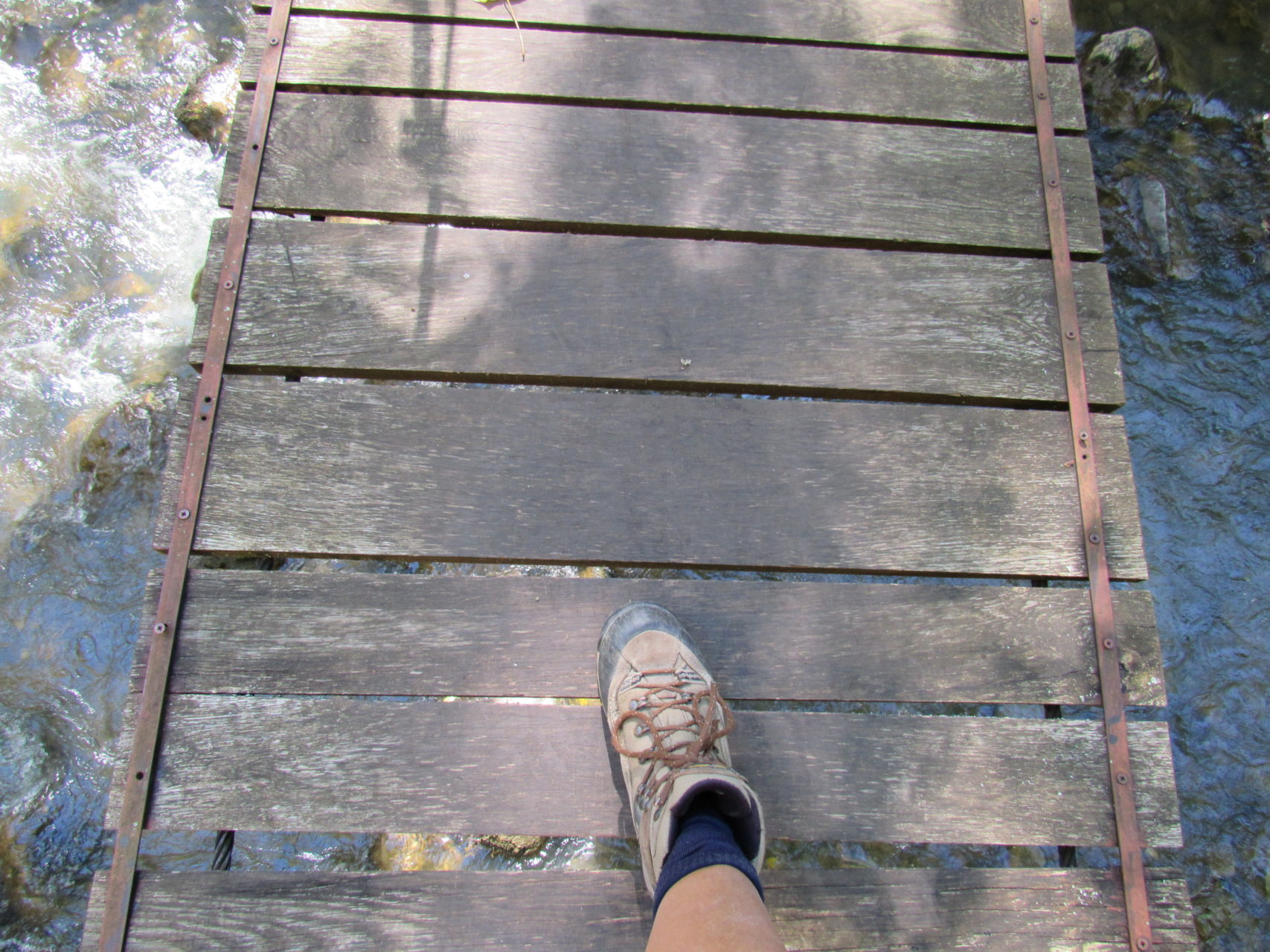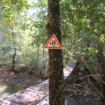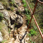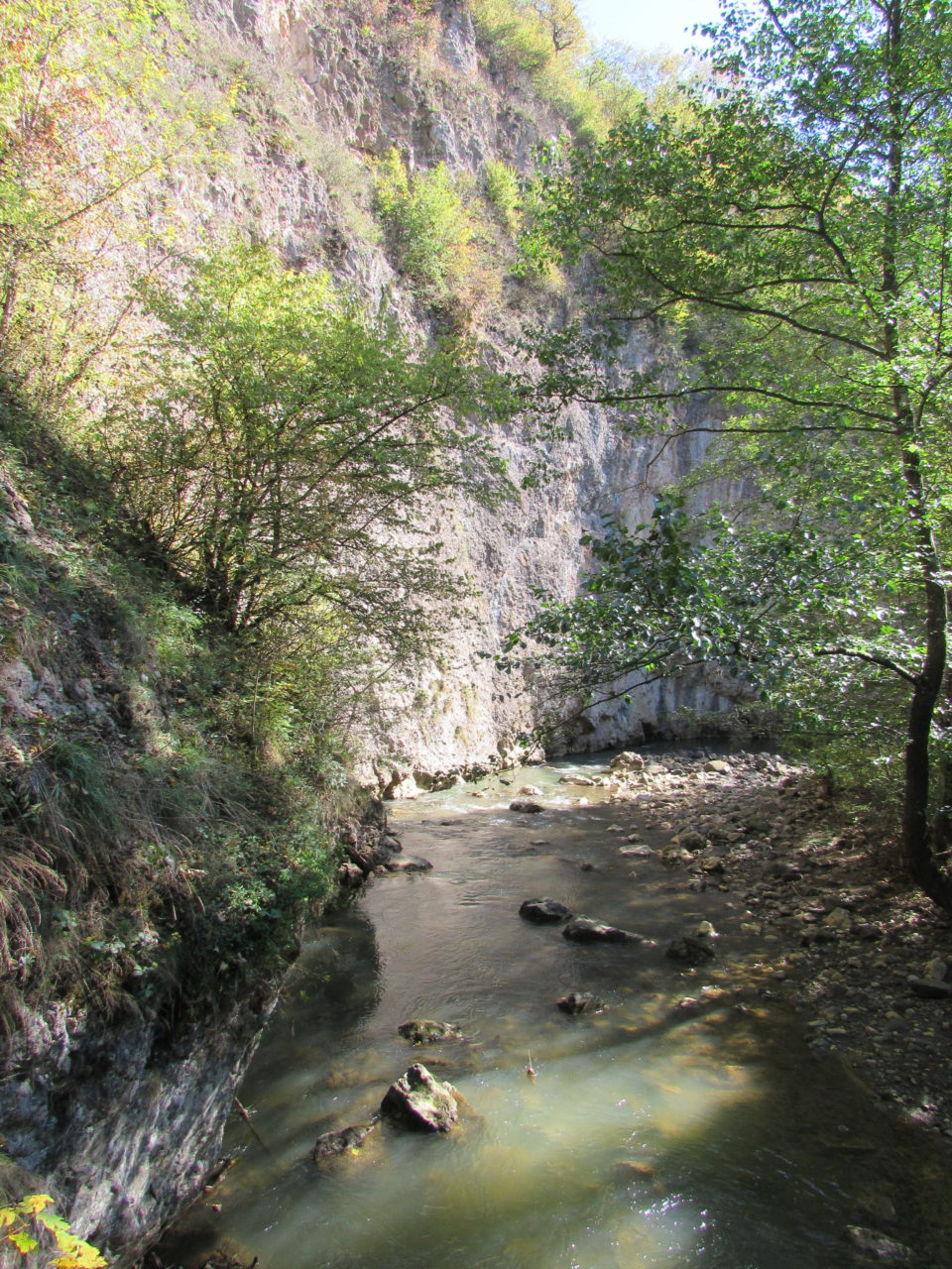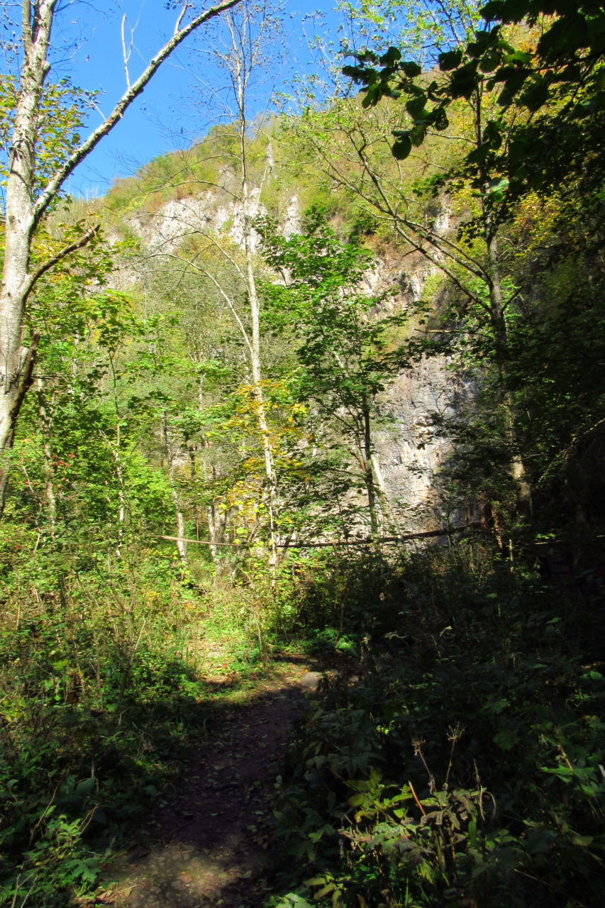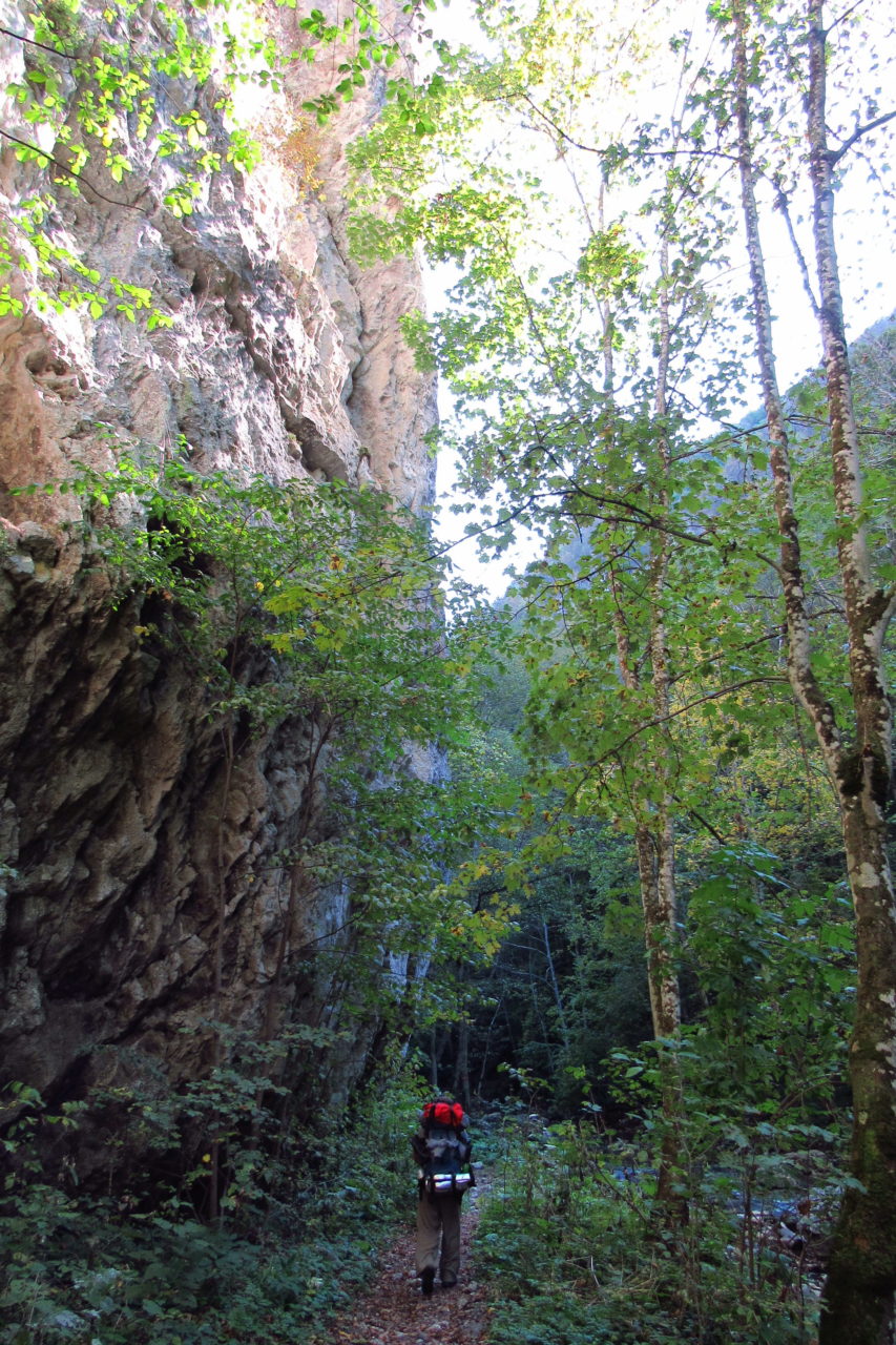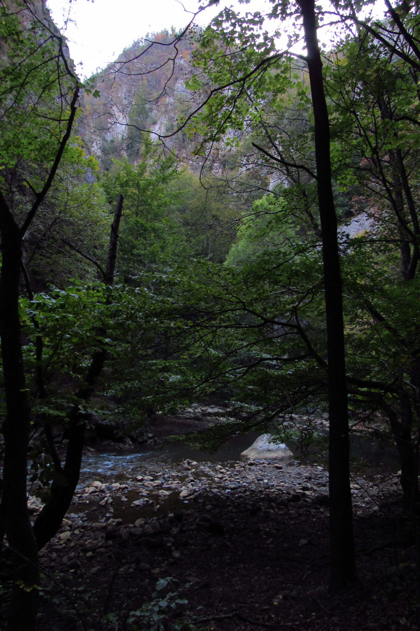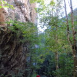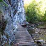 Hát erre aztán már tényleg nincsenek szavak. Ha csak az nem, hogy valóban varázslatos, és nem kicsit kihívásos, pláne ekkora zsákokkal. A bevezető szakasz elején van egy kis “bár”. Lehet kapni sört meg valamit még. Lehet lovagolni is meg ilyesmik. Nem volt ott senki, de igazán nem is akartunk volna betérni. Van egy tábla kitéve, hogy fizetni kell a természetvédelmi terület látogatásáért. Nem tudtuk először, hogy hol és kinek. Majd találtunk egy kiírást, hogy a területen járőröző parkőröknél. Így hát nekiindultunk. A háromakkora patak mentén haladtunk kicsit. Majd szembesültünk a meredéllyel, amire felvitt az útnak nehezen nevezhető, sziklás, sáros, gyökerekkel tarkított ösvény. Ezen felkapaszkodva egy korláttal ugyan védett, de rém keskeny sziklaperemre értünk. Épp hogy elfértünk a zsákokkal. Minden sziklás, csúszós, és meredek. De élveztük nagyon. Majd jöttek a pallóhidak. Én eddig ilyet csak filmen láttam. Főleg az Indiana Jonesban. Hát nem mondom, hogy az elsőnél nem gondoltam azt, hogy na, ezen hogy fogok átkelni! De nagyon klassz volt! Imádom, hogy az ember előtt nincs akadály. És milyen gyönyörű onnan lenézni a patakra, ami itt inkább már folyó. És a sziklák, amik között kanyarog, és a két part, amit összeköt! Na, nincs mit mondani, és nincs mit mondani! Ebből a típusú függő pallóhídból még jó néhány van itt. Egyik izgibb, mint a másik. Különösen a feljutás rájuk, hogy a lejutásról ne is beszéljünk! De van itt olyan fa híd is, aminek csak az egyik oldalon van korlátja, és olyan átkelés is, ahol nincs is híd, csak kidőlt fa. (Jobb esetben! 🙂 ) Át kellett haladnunk egy a sziklafalra szerelt pallósorom is. Itt kicsit nehezen fértünk a zsákkal, de ezen is túljutottunk. Elértünk egy hídhoz, aminél találkoztunk egy szegedi és egy székesfehérvári pár két nőtagjával. Ők jöttek egyébként a magyarországi autóval, amit láttunk is a szurdok bejáratánál. A két nő innen már nem ment tovább, mert a hídon átkelve nem tudtak lemászni a sziklákon. Kicsit beszélgettem velük, míg Gergő megkísérelte a fent említett lemászást. Hát, ez tényleg nem ment egyszerűen. Aztán persze én is átmentem a hídon, és Gergő, miután letette az ő zsákját, visszamászott az enyémért. Nagy nehezen letuszkoltuk a zsákot, és utánamásztam én is. Azt hiszem, nem sok olyan dolog, út lesz az életemben ezentúl, aminek ne merjek ezek után neki vágni! Nem olyan vészes egyébként az egész, ilyen nagy zsák nélkül. Nem erre tervezték. Csak amolyan hétvégi, kicsit azért gyakorlottabb túrázóknak. Ezt aztán az út végén lévő hídnál dolgozó parkőr is megerősítette. De azért addig még volt előttünk egy-két függőhíd meg szikla meg patakmeder. Nagyon, de nagyon élveztem. Egyrészt álomszép az egész, de kihívásnak se volt semmi!