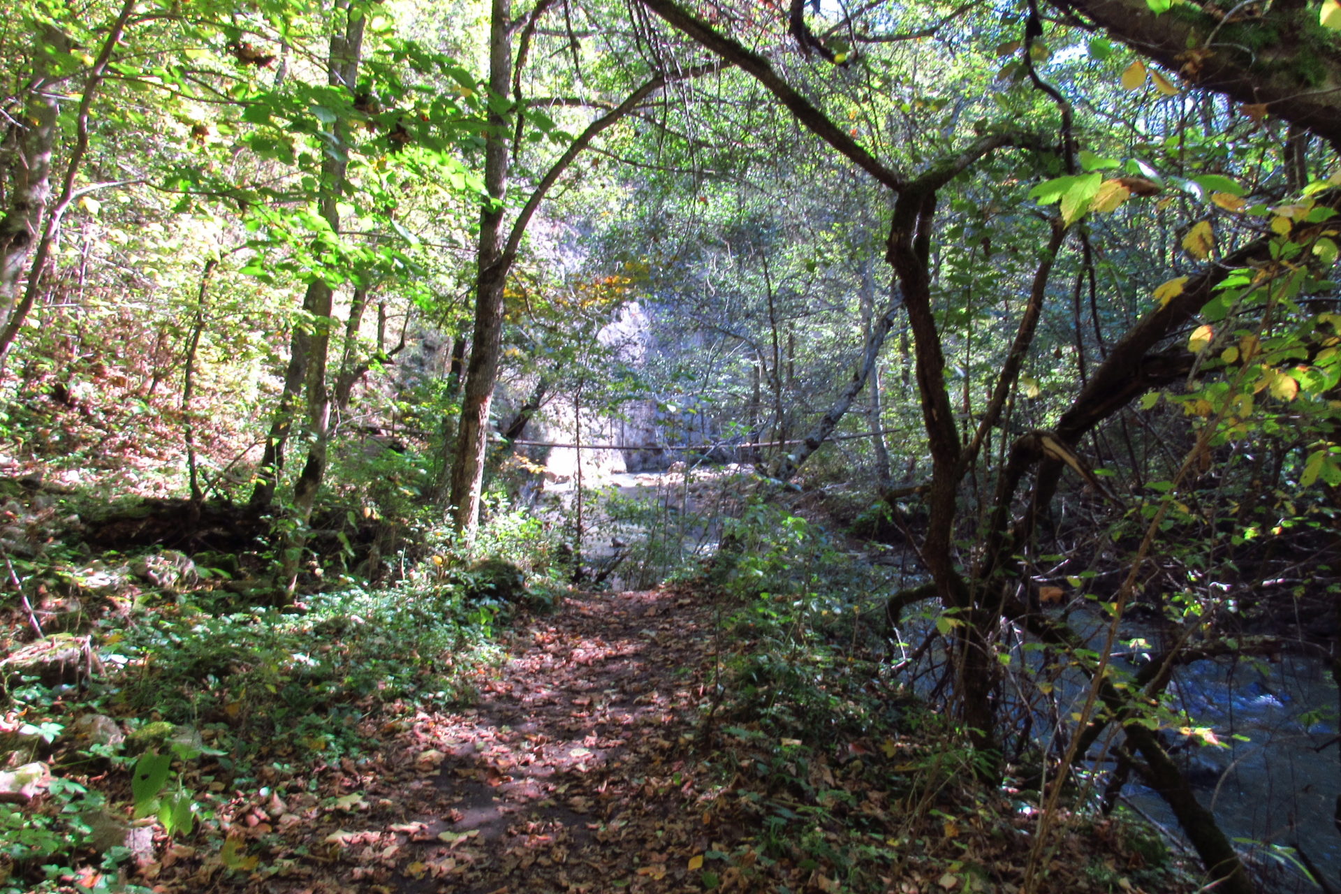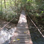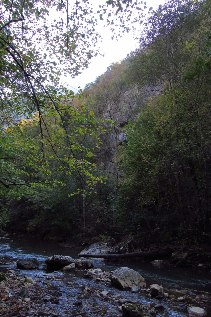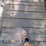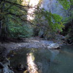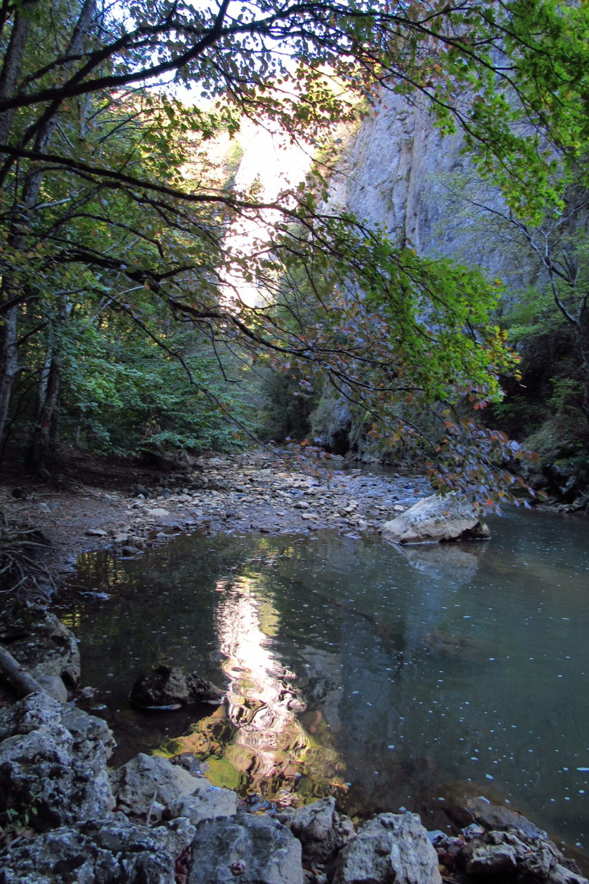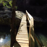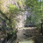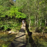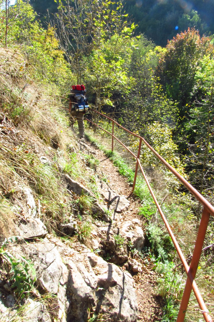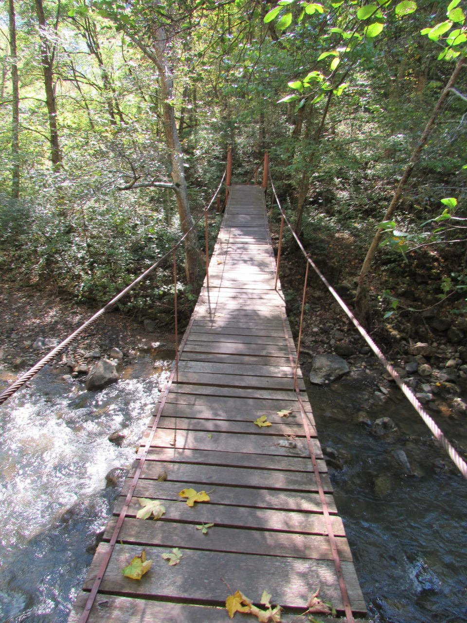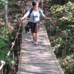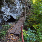Hát erre aztán már tényleg nincsenek szavak. Ha csak az nem, hogy valóban varázslatos, és nem kicsit kihívásos, pláne ekkora zsákokkal. A bevezető szakasz elején van egy kis “bár”. Lehet kapni sört meg valamit még. Lehet lovagolni is meg ilyesmik. Nem volt ott senki, de igazán nem is akartunk volna betérni. Van egy tábla kitéve, hogy fizetni kell a természetvédelmi terület látogatásáért. Nem tudtuk először, hogy hol és kinek. Majd találtunk egy kiírást, hogy a területen járőröző parkőröknél. Így hát nekiindultunk. A háromakkora patak mentén haladtunk kicsit. Majd szembesültünk a meredéllyel, amire felvitt az útnak nehezen nevezhető, sziklás, sáros, gyökerekkel tarkított ösvény. Ezen felkapaszkodva egy korláttal ugyan védett, de rém keskeny sziklaperemre értünk. Épp hogy elfértünk a zsákokkal. Minden sziklás, csúszós, és meredek. De élveztük nagyon. Majd jöttek a pallóhidak. Én eddig ilyet csak filmen láttam. Főleg az Indiana Jonesban. Hát nem mondom, hogy az elsőnél nem gondoltam azt, hogy na, ezen hogy fogok átkelni! De nagyon klassz volt! Imádom, hogy az ember előtt nincs akadály. És milyen gyönyörű onnan lenézni a patakra, ami itt inkább már folyó. És a sziklák, amik között kanyarog, és a két part, amit összeköt! Na, nincs mit mondani, és nincs mit mondani! Ebből a típusú függő pallóhídból még jó néhány van itt. Egyik izgibb, mint a másik. Különösen a feljutás rájuk, hogy a lejutásról ne is beszéljünk! De van itt olyan fa híd is, aminek csak az egyik oldalon van korlátja, és olyan átkelés is, ahol nincs is híd, csak kidőlt fa. (Jobb esetben! 🙂 ) Át kellett haladnunk egy a sziklafalra szerelt pallósorom is. Itt kicsit nehezen fértünk a zsákkal, de ezen is túljutottunk. Elértünk egy hídhoz, aminél találkoztunk egy szegedi és egy székesfehérvári pár két nőtagjával. Ők jöttek egyébként a magyarországi autóval, amit láttunk is a szurdok bejáratánál. A két nő innen már nem ment tovább, mert a hídon átkelve nem tudtak lemászni a sziklákon. Kicsit beszélgettem velük, míg Gergő megkísérelte a fent említett lemászást. Hát, ez tényleg nem ment egyszerűen. Aztán persze én is átmentem a hídon, és Gergő, miután letette az ő zsákját, visszamászott az enyémért. Nagy nehezen letuszkoltuk a zsákot, és utánamásztam én is. Azt hiszem, nem sok olyan dolog, út lesz az életemben ezentúl, aminek ne merjek ezek után neki vágni! Nem olyan vészes egyébként az egész, ilyen nagy zsák nélkül. Nem erre tervezték. Csak amolyan hétvégi, kicsit azért gyakorlottabb túrázóknak. Ezt aztán az út végén lévő hídnál dolgozó parkőr is megerősítette. De azért addig még volt előttünk egy-két függőhíd meg szikla meg patakmeder. Nagyon, de nagyon élveztem. Egyrészt álomszép az egész, de kihívásnak se volt semmi!