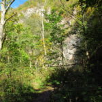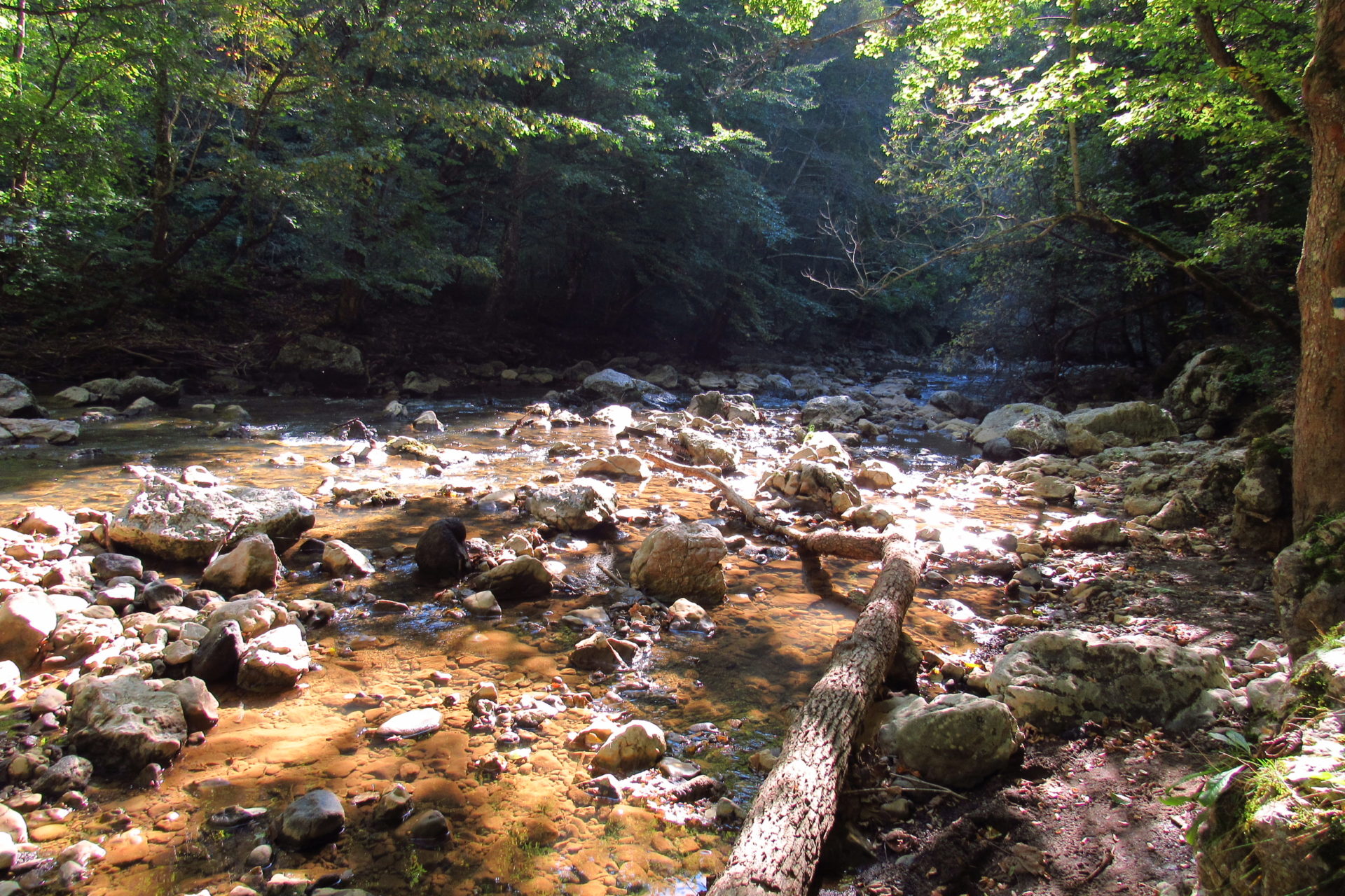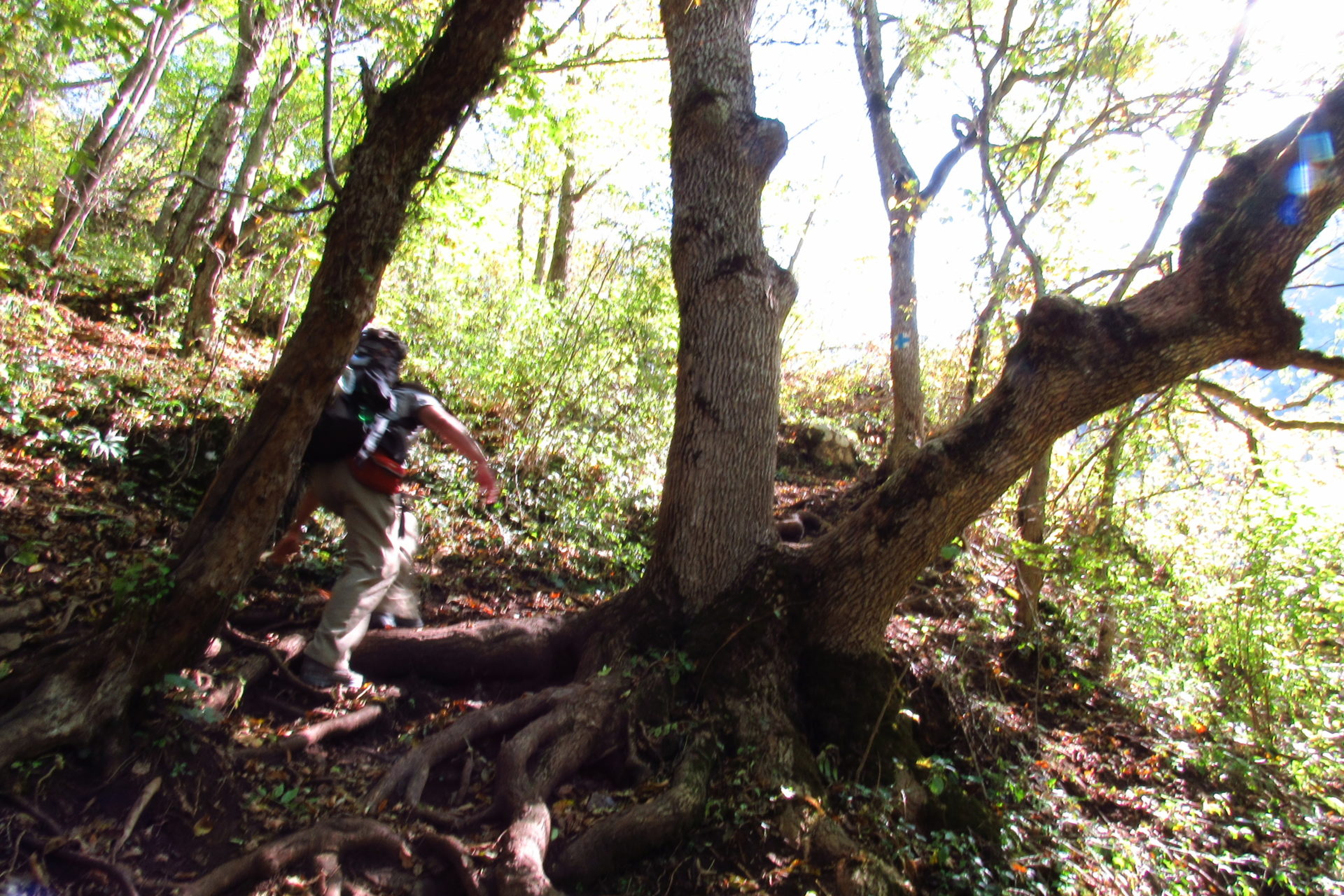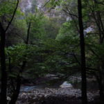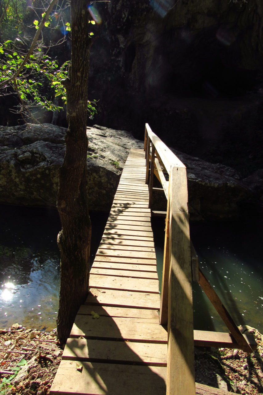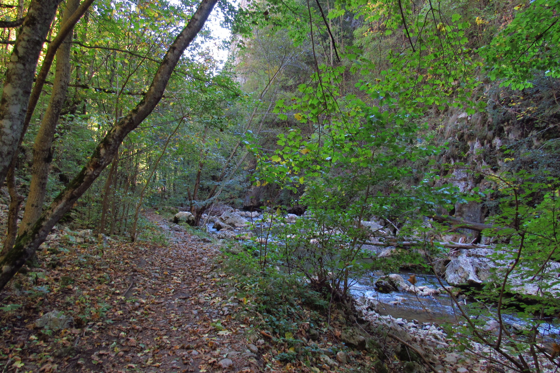 Hát erre aztán már tényleg nincsenek szavak. Ha csak az nem, hogy valóban varázslatos, és nem kicsit kihívásos, pláne ekkora zsákokkal. A bevezető szakasz elején van egy kis “bár”. Lehet kapni sört meg valamit még. Lehet lovagolni is meg ilyesmik. Nem volt ott senki, de igazán nem is akartunk volna betérni. Van egy tábla kitéve, hogy fizetni kell a természetvédelmi terület látogatásáért. Nem tudtuk először, hogy hol és kinek. Majd találtunk egy kiírást, hogy a területen járőröző parkőröknél. Így hát nekiindultunk. A háromakkora patak mentén haladtunk kicsit. Majd szembesültünk a meredéllyel, amire felvitt az útnak nehezen nevezhető, sziklás, sáros, gyökerekkel tarkított ösvény. Ezen felkapaszkodva egy korláttal ugyan védett, de rém keskeny sziklaperemre értünk. Épp hogy elfértünk a zsákokkal. Minden sziklás, csúszós, és meredek. De élveztük nagyon. Majd jöttek a pallóhidak. Én eddig ilyet csak filmen láttam. Főleg az Indiana Jonesban. Hát nem mondom, hogy az elsőnél nem gondoltam azt, hogy na, ezen hogy fogok átkelni! De nagyon klassz volt! Imádom, hogy az ember előtt nincs akadály. És milyen gyönyörű onnan lenézni a patakra, ami itt inkább már folyó. És a sziklák, amik között kanyarog, és a két part, amit összeköt! Na, nincs mit mondani, és nincs mit mondani! Ebből a típusú függő pallóhídból még jó néhány van itt. Egyik izgibb, mint a másik. Különösen a feljutás rájuk, hogy a lejutásról ne is beszéljünk! De van itt olyan fa híd is, aminek csak az egyik oldalon van korlátja, és olyan átkelés is, ahol nincs is híd, csak kidőlt fa. (Jobb esetben! 🙂 ) Át kellett haladnunk egy a sziklafalra szerelt pallósorom is. Itt kicsit nehezen fértünk a zsákkal, de ezen is túljutottunk. Elértünk egy hídhoz, aminél találkoztunk egy szegedi és egy székesfehérvári pár két nőtagjával. Ők jöttek egyébként a magyarországi autóval, amit láttunk is a szurdok bejáratánál. A két nő innen már nem ment tovább, mert a hídon átkelve nem tudtak lemászni a sziklákon. Kicsit beszélgettem velük, míg Gergő megkísérelte a fent említett lemászást. Hát, ez tényleg nem ment egyszerűen. Aztán persze én is átmentem a hídon, és Gergő, miután letette az ő zsákját, visszamászott az enyémért. Nagy nehezen letuszkoltuk a zsákot, és utánamásztam én is. Azt hiszem, nem sok olyan dolog, út lesz az életemben ezentúl, aminek ne merjek ezek után neki vágni! Nem olyan vészes egyébként az egész, ilyen nagy zsák nélkül. Nem erre tervezték. Csak amolyan hétvégi, kicsit azért gyakorlottabb túrázóknak. Ezt aztán az út végén lévő hídnál dolgozó parkőr is megerősítette. De azért addig még volt előttünk egy-két függőhíd meg szikla meg patakmeder. Nagyon, de nagyon élveztem. Egyrészt álomszép az egész, de kihívásnak se volt semmi!