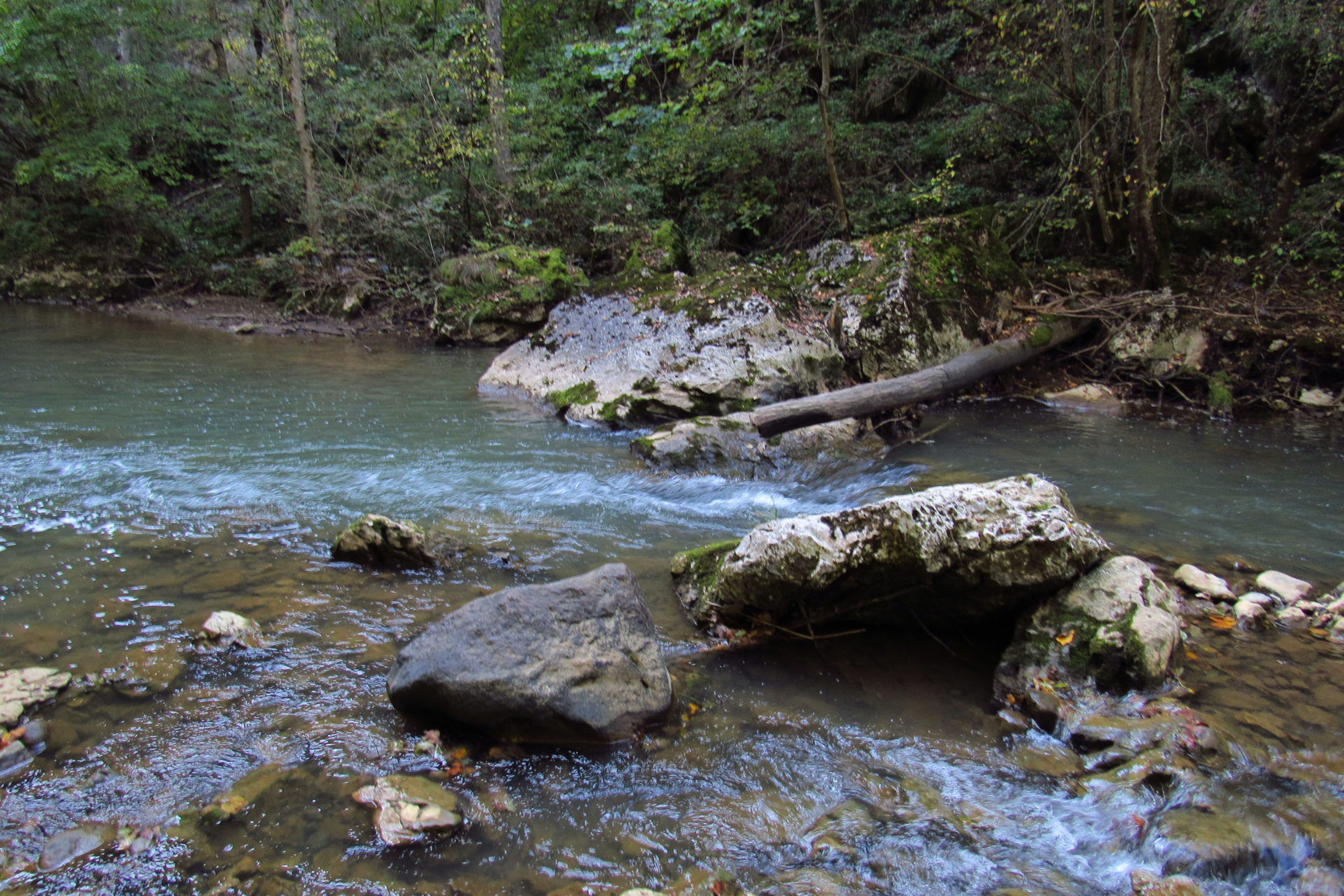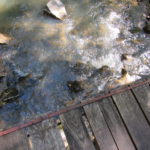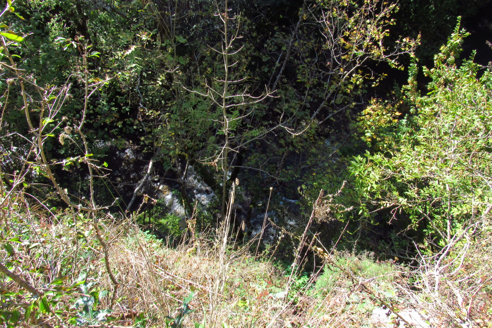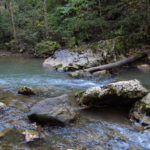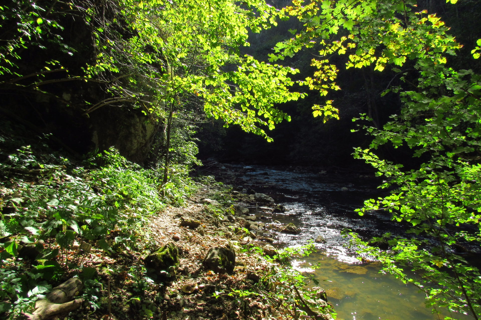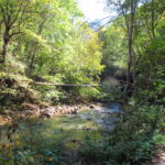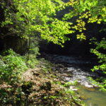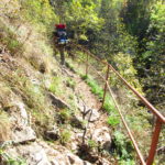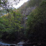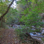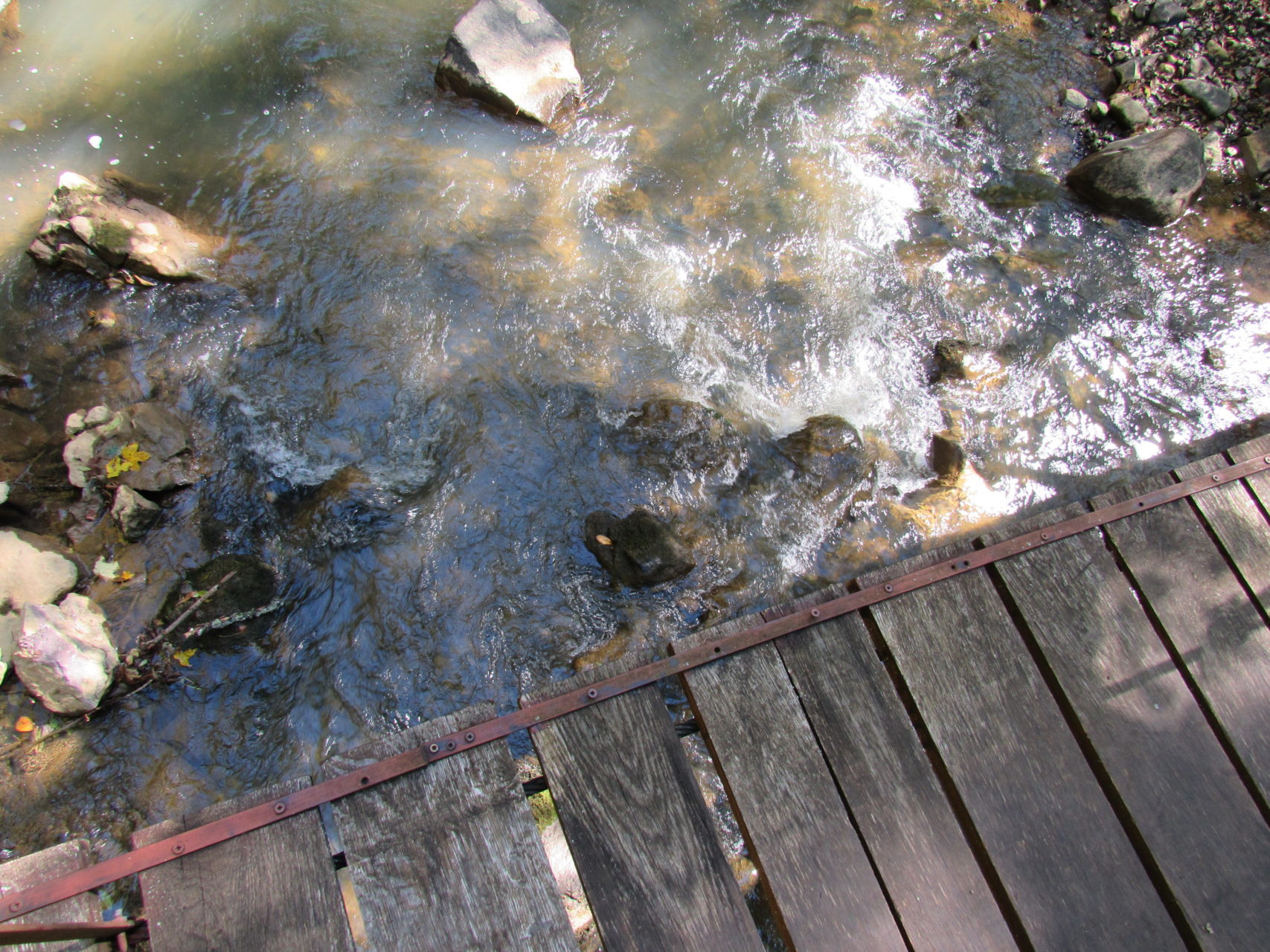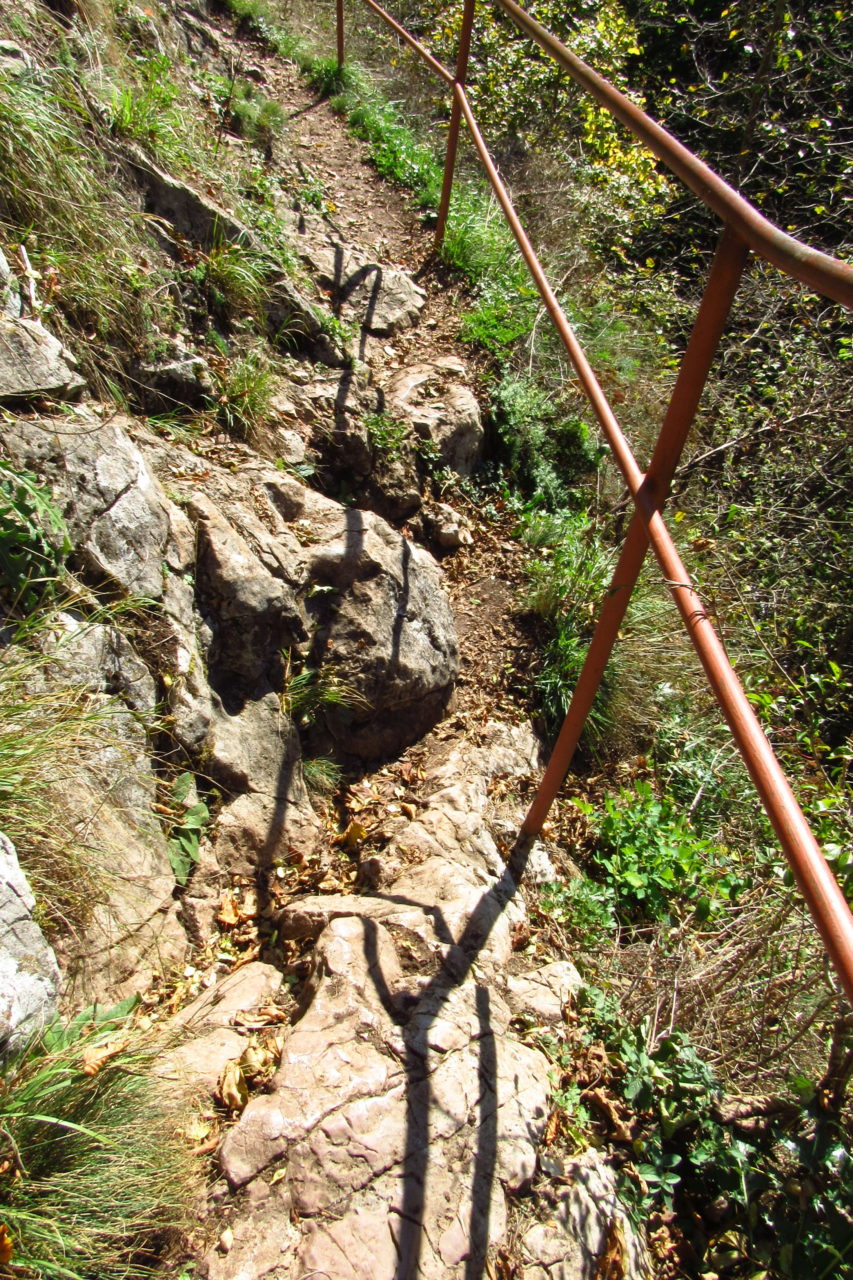 Hát erre aztán már tényleg nincsenek szavak. Ha csak az nem, hogy valóban varázslatos, és nem kicsit kihívásos, pláne ekkora zsákokkal. A bevezető szakasz elején van egy kis “bár”. Lehet kapni sört meg valamit még. Lehet lovagolni is meg ilyesmik. Nem volt ott senki, de igazán nem is akartunk volna betérni. Van egy tábla kitéve, hogy fizetni kell a természetvédelmi terület látogatásáért. Nem tudtuk először, hogy hol és kinek. Majd találtunk egy kiírást, hogy a területen járőröző parkőröknél. Így hát nekiindultunk. A háromakkora patak mentén haladtunk kicsit. Majd szembesültünk a meredéllyel, amire felvitt az útnak nehezen nevezhető, sziklás, sáros, gyökerekkel tarkított ösvény. Ezen felkapaszkodva egy korláttal ugyan védett, de rém keskeny sziklaperemre értünk. Épp hogy elfértünk a zsákokkal. Minden sziklás, csúszós, és meredek. De élveztük nagyon. Majd jöttek a pallóhidak. Én eddig ilyet csak filmen láttam. Főleg az Indiana Jonesban. Hát nem mondom, hogy az elsőnél nem gondoltam azt, hogy na, ezen hogy fogok átkelni! De nagyon klassz volt! Imádom, hogy az ember előtt nincs akadály. És milyen gyönyörű onnan lenézni a patakra, ami itt inkább már folyó. És a sziklák, amik között kanyarog, és a két part, amit összeköt! Na, nincs mit mondani, és nincs mit mondani! Ebből a típusú függő pallóhídból még jó néhány van itt. Egyik izgibb, mint a másik. Különösen a feljutás rájuk, hogy a lejutásról ne is beszéljünk! De van itt olyan fa híd is, aminek csak az egyik oldalon van korlátja, és olyan átkelés is, ahol nincs is híd, csak kidőlt fa. (Jobb esetben! 🙂 ) Át kellett haladnunk egy a sziklafalra szerelt pallósorom is. Itt kicsit nehezen fértünk a zsákkal, de ezen is túljutottunk. Elértünk egy hídhoz, aminél találkoztunk egy szegedi és egy székesfehérvári pár két nőtagjával. Ők jöttek egyébként a magyarországi autóval, amit láttunk is a szurdok bejáratánál. A két nő innen már nem ment tovább, mert a hídon átkelve nem tudtak lemászni a sziklákon. Kicsit beszélgettem velük, míg Gergő megkísérelte a fent említett lemászást. Hát, ez tényleg nem ment egyszerűen. Aztán persze én is átmentem a hídon, és Gergő, miután letette az ő zsákját, visszamászott az enyémért. Nagy nehezen letuszkoltuk a zsákot, és utánamásztam én is. Azt hiszem, nem sok olyan dolog, út lesz az életemben ezentúl, aminek ne merjek ezek után neki vágni! Nem olyan vészes egyébként az egész, ilyen nagy zsák nélkül. Nem erre tervezték. Csak amolyan hétvégi, kicsit azért gyakorlottabb túrázóknak. Ezt aztán az út végén lévő hídnál dolgozó parkőr is megerősítette. De azért addig még volt előttünk egy-két függőhíd meg szikla meg patakmeder. Nagyon, de nagyon élveztem. Egyrészt álomszép az egész, de kihívásnak se volt semmi!