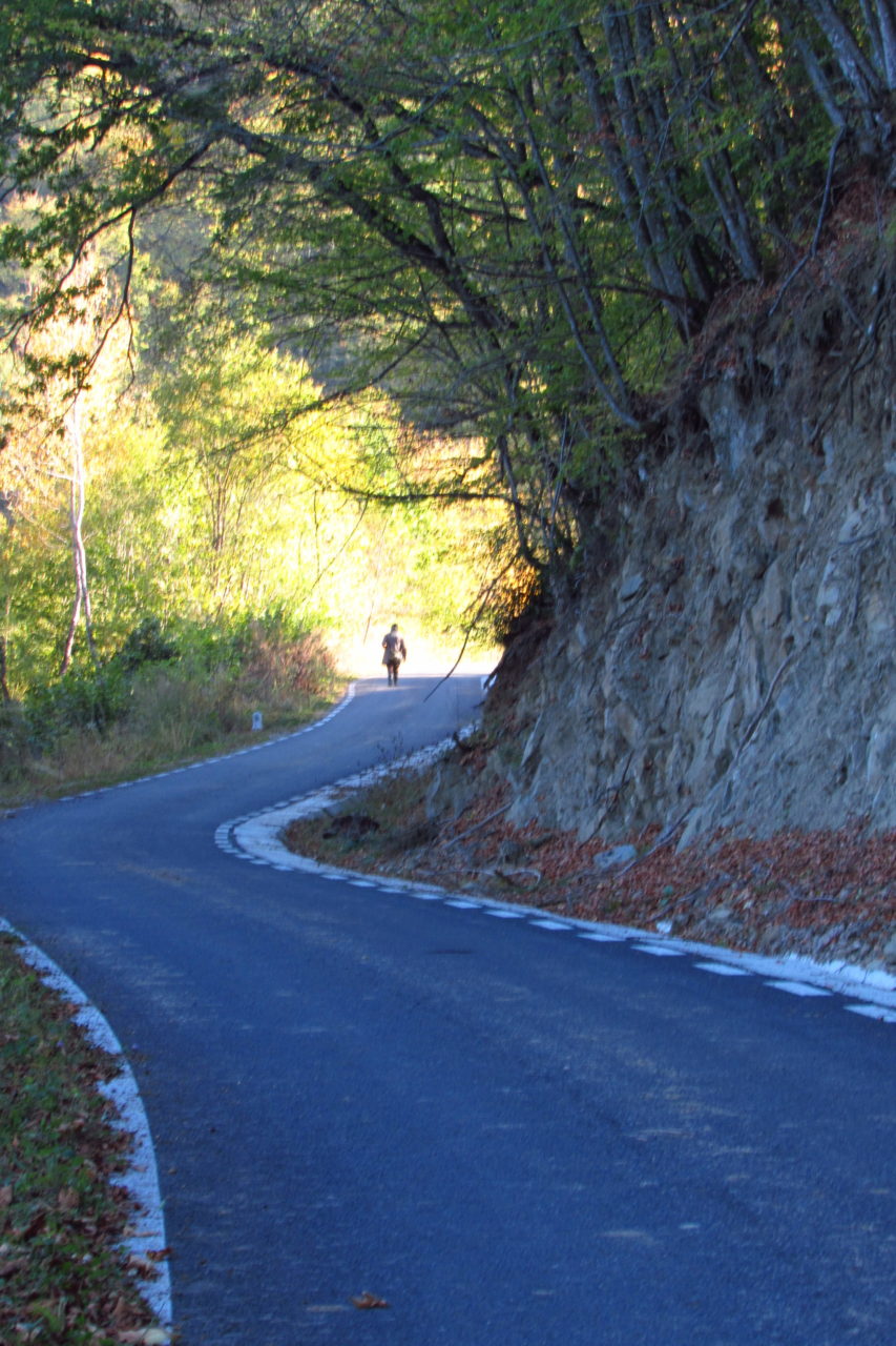 Az előbb említett őrnél végül fizettünk, és útba is igazított minket. Gergő ugyan mondta, hogy mire kiérünk a szakadékból, akkor leszünk még csak félúton. Azért az, amikor az őr azt mondta, hogy onnan, ahol találkoztunk, még kb. 13 km van hátra, kissé mellbe vágott. Mondta, hogy merre kell menni, és hogy vagy felvesz minket, amikor végez, vagy szerinte inkább be kéne menni az út mellett kb. 3 km-re levő panzióba. Ő úgy vélte, hogy be is sötétedik, mire Vargyasra érünk, s egyébként is túl hosszú az út. Mondtuk, hogy szerintünk végigmegyünk most már.  Így is lett. És ezen a szakaszon játszottam az idővel. Elég nehéz volt menni ezen a betonúton ennyi kaland és út után. Ilyenkor persze az megy az emberben, hogy bárcsak ott lennénk már. Ráadásul itt minden 100 méter jelezve is volt az út mentén, és persze a kilométerek is. Én ezt nem szeretem, mert az ember önkénytelenül is nézi, hogy mennyi van még. Ilyenkor én egy fura üzemmódba kapcsolok. Megjelenik bennem a bika makacssága, és megyek, megyek, megyek. Gergő szerint jó gyors tempóban. Ráadásul szó volt róla ugye, hogy esetleg ez a fiú felvesz minket, amit nem igazán akartam, de kísértésként azért ott lebegett. Na szóval, eszembe jutott, hogy nemrég még Isaszegen voltunk. Onnan indultunk. Ez a múlt. Akkor ott az jutott eszembe, hogy  milyen lesz majd arra gondolni, ha egyszer véget ér ez az út, hogy milyen is volt. Akkor ez teljesen lehetetlennek tűnt. Most meg itt vagyunk. A múlt nagyon gyorsan történik. Már ez a pillanat is a múlt. És egyszercsak már az is, ami most van, múlt lesz. Bármi, ami nehéz, és most benne vagyunk, egyszer elmúlik, és csak emlék lesz. És persze a jó is, és minden. Ha az ember látja a kilométertáblákat, és itt ráadásul a 100 métereket is, akkor ez egy játék is lehet. Minden méter, amin túl vagy, egy emlék lesz. És előtted a jövő. Amiben vagy, az a lépés, az a méter, a jelen. Ahogy haladsz, egyszer csak a 9 km-es tábla már annyira a múlt, hogy egy 5-ös mellett haladsz el. Ilyen az életünk is. Annyira élveztem ezt, és közben persze a csodás tájat is, hogy észre sem vettem, de nagyon hamar be is értünk. Nem jött a fiú egyébként.