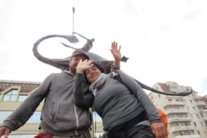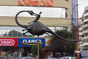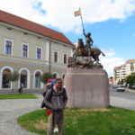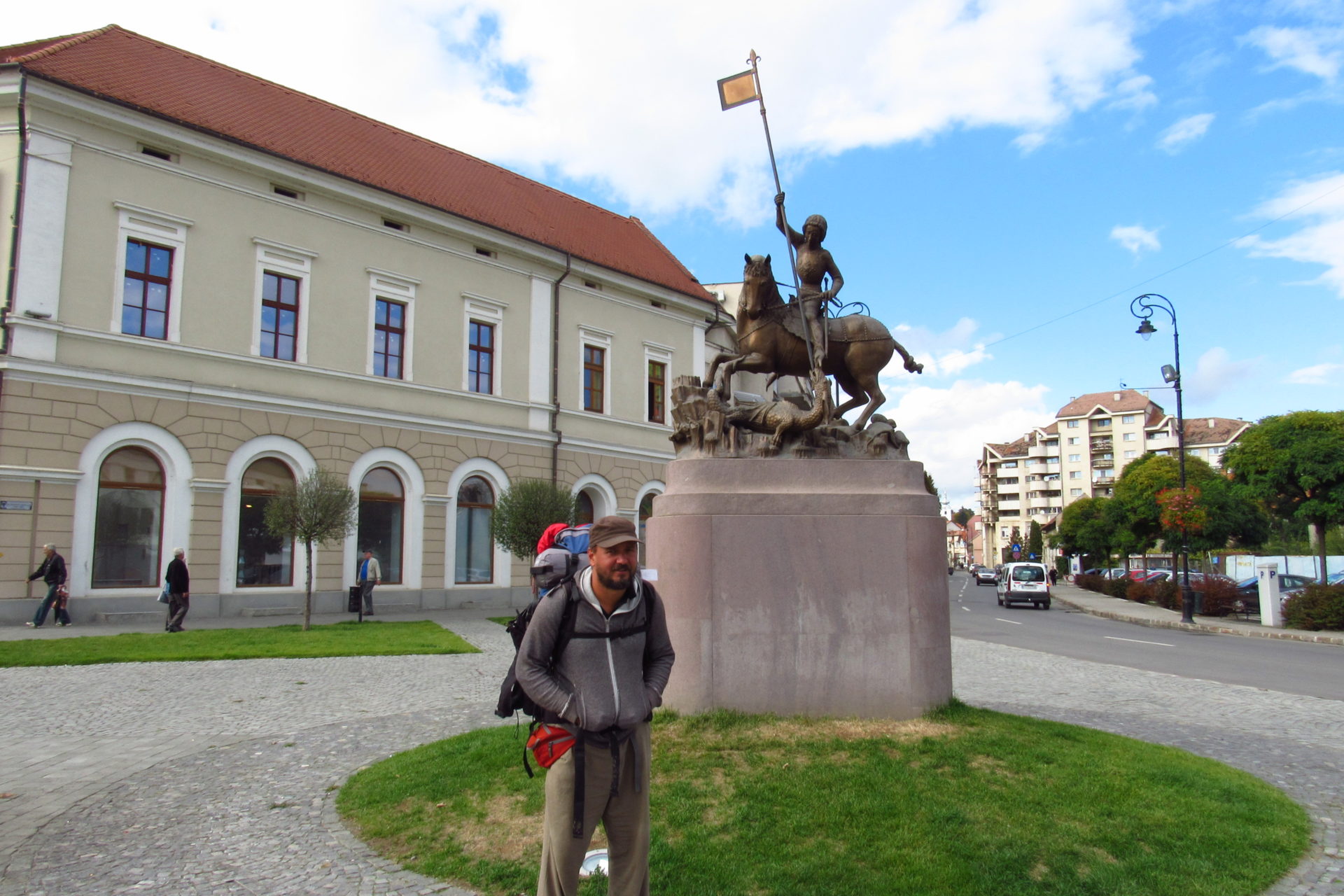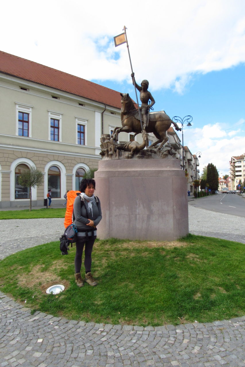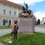 Begyalogoltunk a sárkányos szoborig, ami a kitűzött cél volt. Ott aztán újabb fotók készültek. Mindig is annyira viccesnek találtam ezt a szobrot. Van a városban még egy Szent György szobor. Az olyan igazi komoly. De mi ezt a sárkányt akartuk elérni, mondhatnánk legyőzni. Érdekes, hogy nem érzem egyáltalán győzelemnek, hogy ide értünk. Inkább valamiféle hihetetlenség érzés van és volt ott bennem. Hihetetlen, hogy itt vagyunk, ide értünk és vége. Persze az is igaz, hogy azért volt útközben egy-két sárkány, amivel megküzdöttünk! Legalábbis én, az biztos. 🙂  De most ott álltunk, és tulajdonképpen semmi nagy HÚHA EZT MEGCSINÁLTUK érzésünk nem volt akkor és ott… Gergő jól elfáradt. Én pedig nagyon, de nagyon érdekesen éreztem magam.