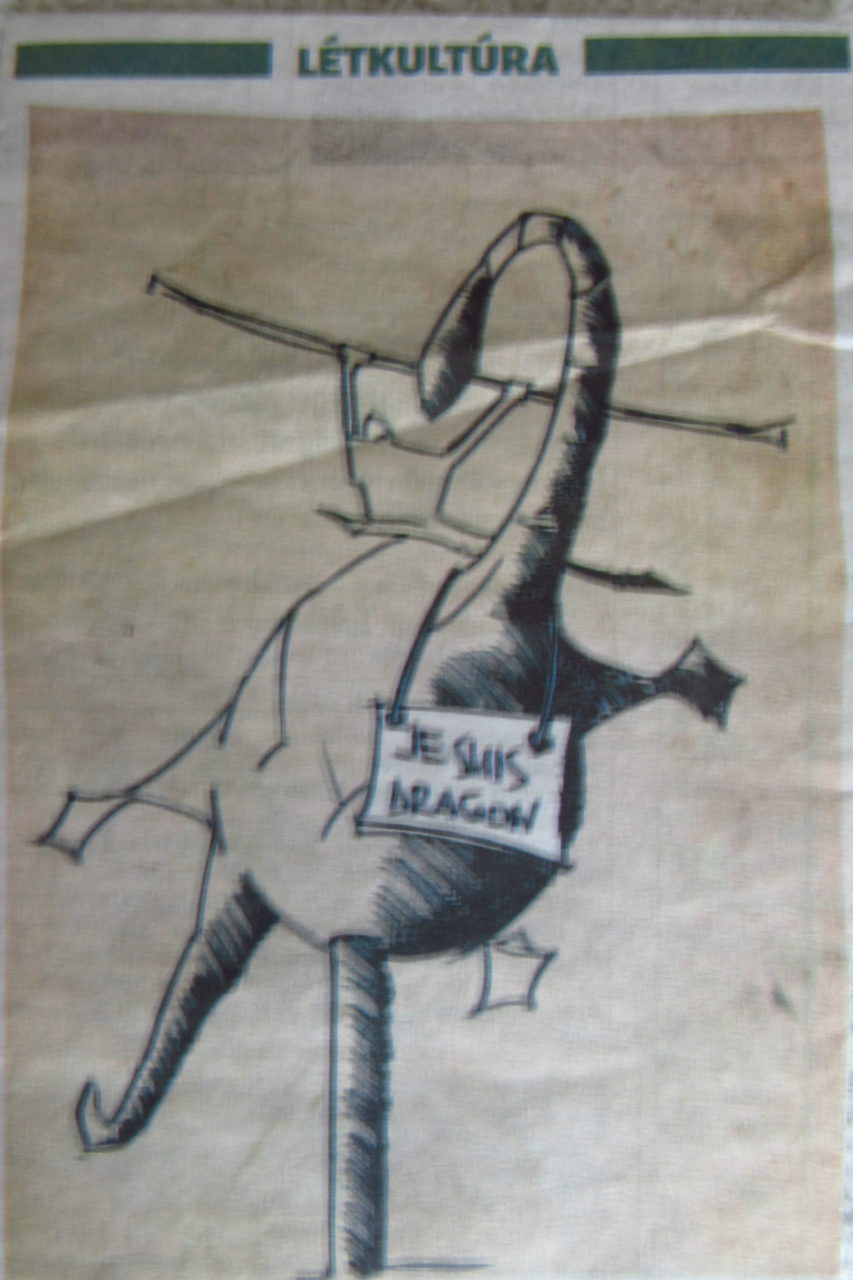 Láttam, hogy az újságban van egy karikatúra a sárkányról, azt elkértem. Ennek kapcsán aztán kiderült, hogy mi járatban vagyunk. Azonnal meghívott minket kávéra és valami Unikumféle italra. Gondolom azt gondolta: na, ezeknek tuti szükségük van egy kis lélekerősítőre! Vicces volt. Jó volt kicsit itt ülni és mesélni. Kicsit levezetődött a dolog.